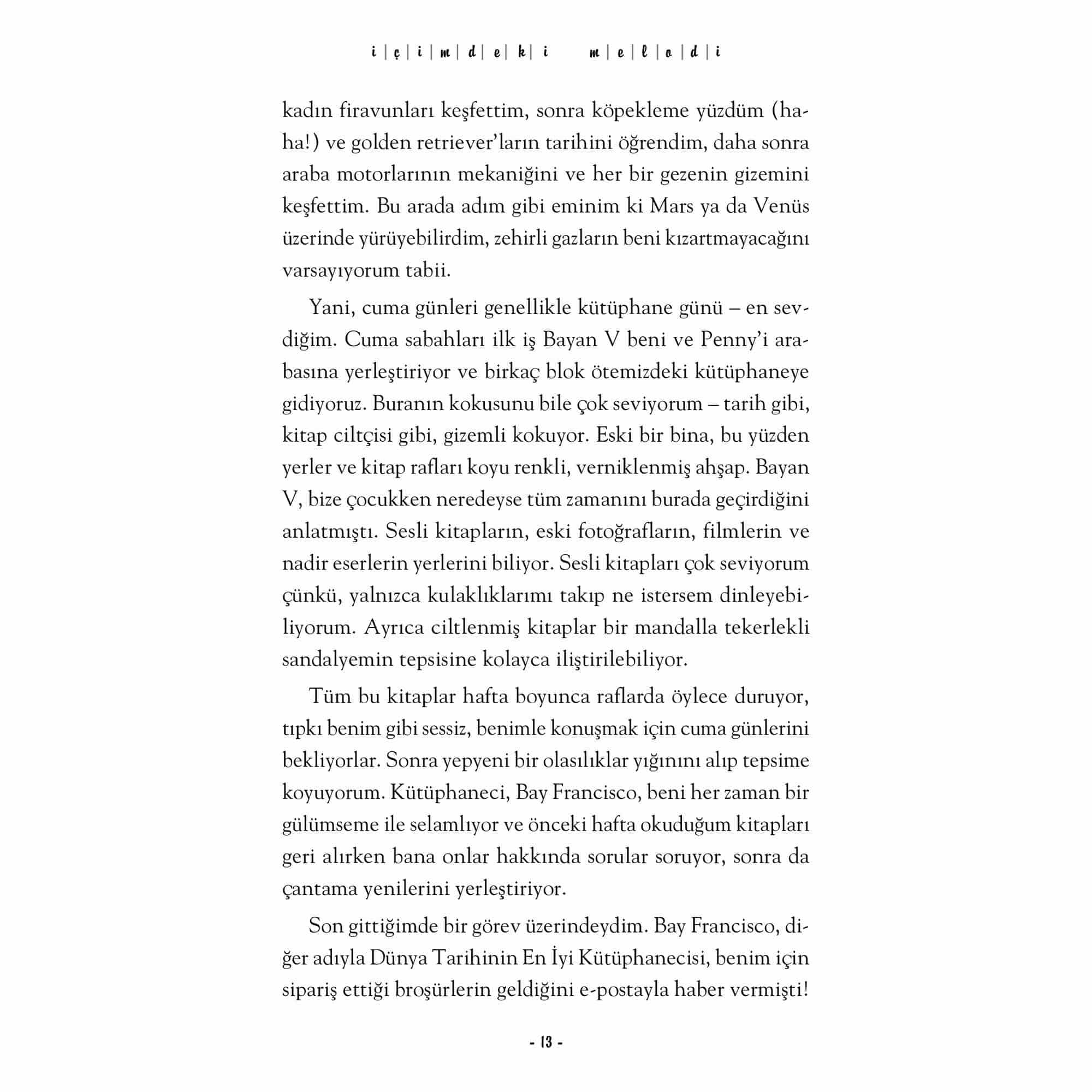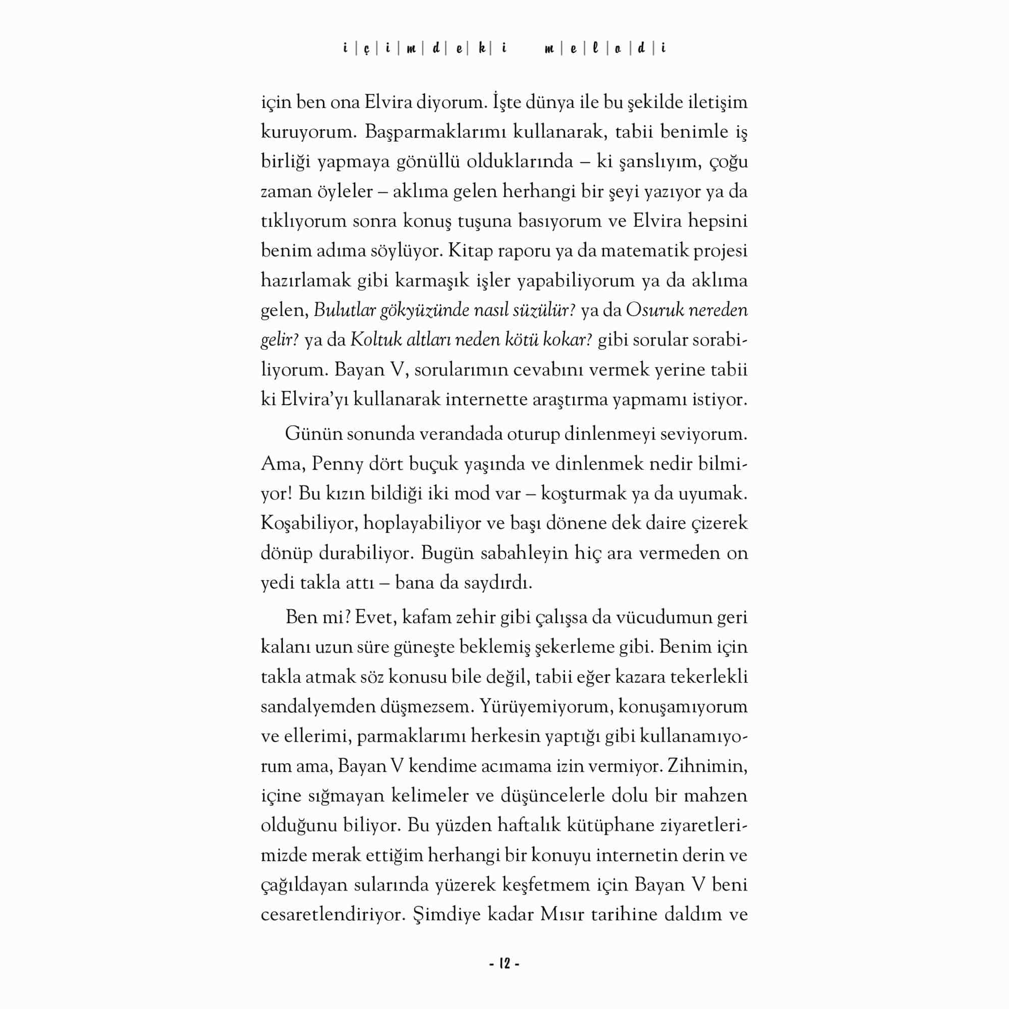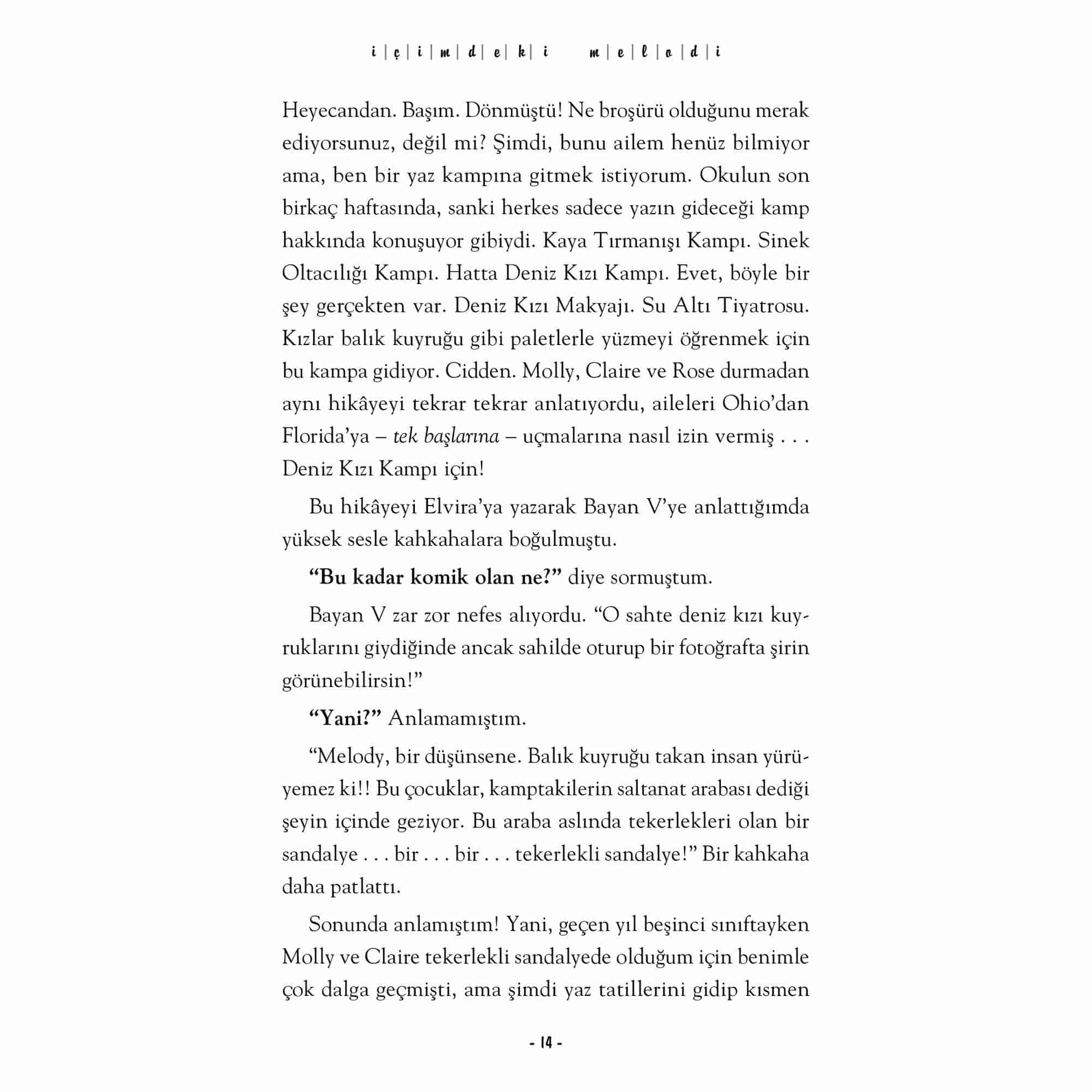 Dünya çapında otuzdan fazla dile çevrilen, milyonlarca okurun kalbinde taht kurarak çok satan listelerinde yerini aylarca koruyan İçimdeki Müzik’in devam romanı. Sharon M. Draper uluslararası ve yerel 50’den fazla ödülle onurlandırılmış tecrübeli ve ismi hafızalarda olan bir yazar. Melody, bu devam romanında artık daha da cesur ve hedefleri doğrultusunda asla pes etmemeyi öğreniyor. Engellere değil, yeteneklere odaklanarak nasıl yaşama sımsıkı tutunulur dersi veriyor ve bu yolculukta tüm samimi duygularına, korkuları, hayal kırıklıkları, umutlarına şahit oluyoruz. İçimdeki Müzik’in beyaz perdeye uyarlanması okurlar için heyecan verici bir haber. Disney tarafından çekimleri devam eden kitabın 2023’de vizyona girecek olması her iki kitabın satışlarına olumlu yansıyacak. İçimdeki Melodi yurtdışında yayımlandığı günden beri topladığı övgülerle kitabın en az ilki kadar iyi olduğunu ispatlıyor. “Genç okurlar için harika bir hikâye ve elbette benim gibi ilk kitapta Melody’ye aşık olanlar için.” -GoodReads, Okur Yorumu “Bu kitapta Melody on iki yaşında ve okulla alakalı tüm problemleri ve sınırları aşmış bir genç kız olarak karşımıza yeniden çıkıyor. Ama bekleyin! Henüz hiçbir şey görmediniz.” -GoodReads, Okur Yorumu “Kampta sahip olduğu arkadaşlıklar ve onlarla kurduğu bu bağı Melody, ömrünün sonuna kadar yanında taşıyacak.” -GoodReads, Okur Yorumu
