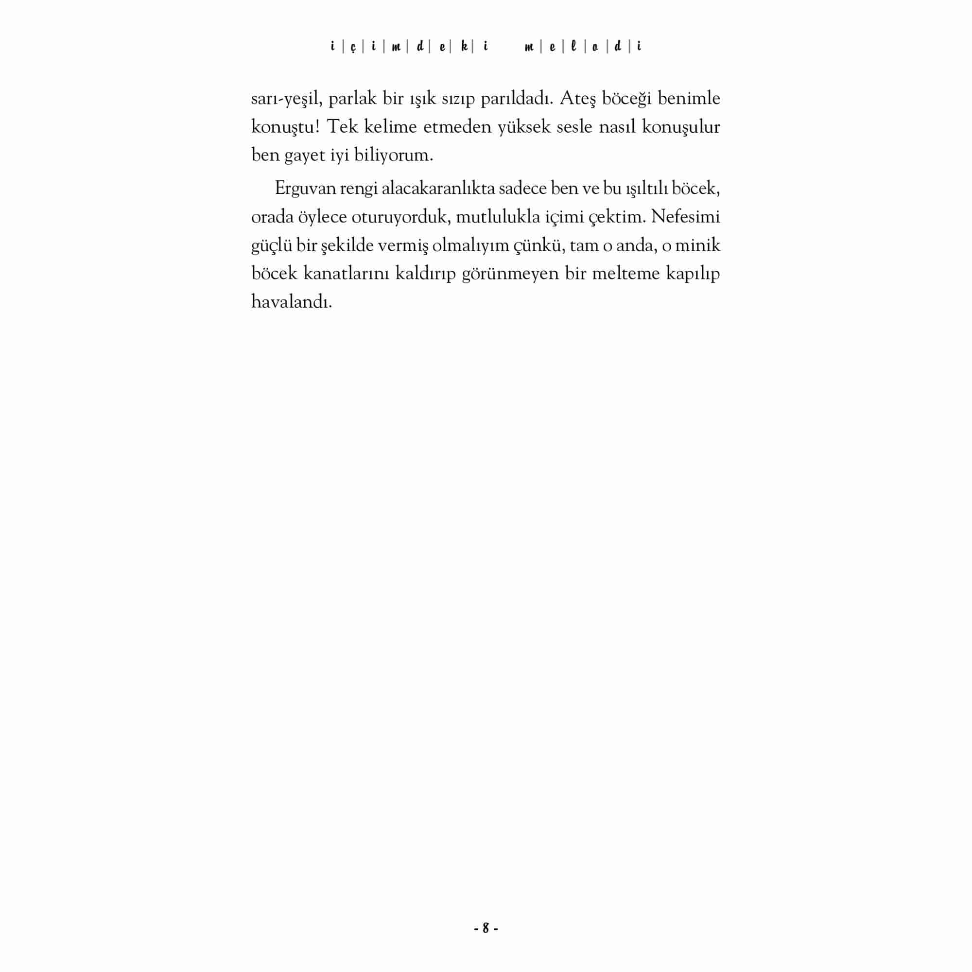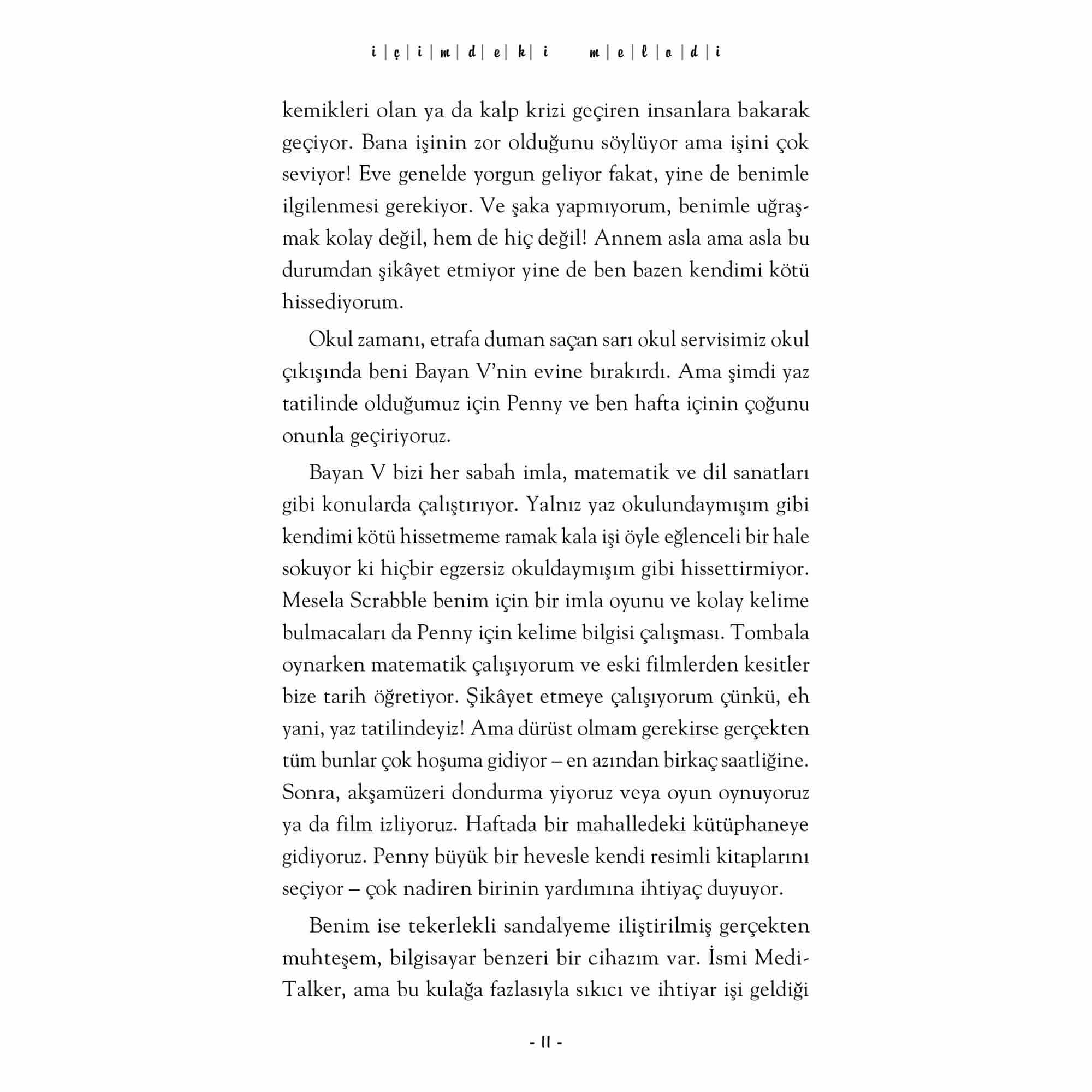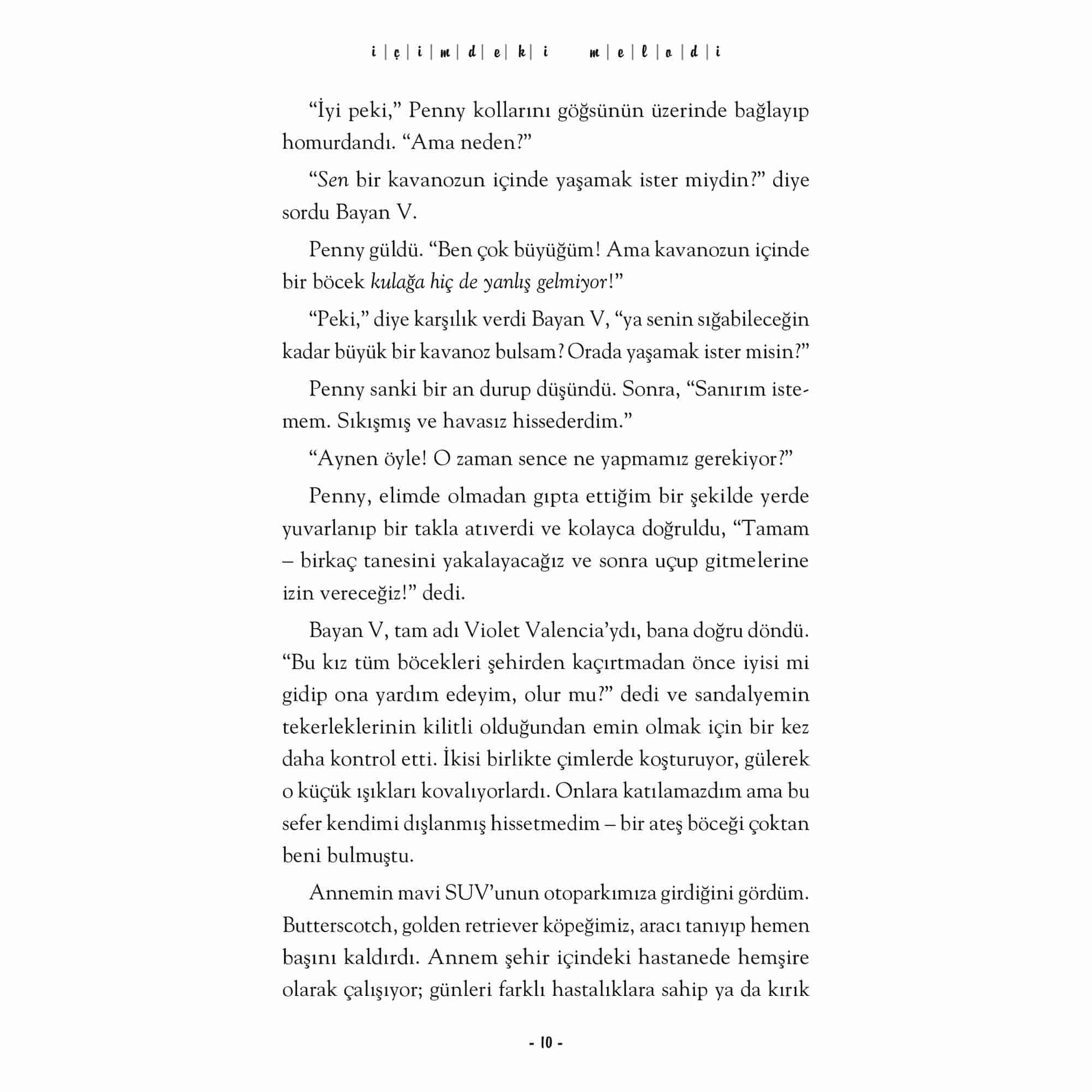 Dünya çapında otuzdan fazla dile çevrilen, milyonlarca okurun kalbinde taht kurarak çok satan listelerinde yerini aylarca koruyan İçimdeki Müzik’in devam romanı. Sharon M. Draper uluslararası ve yerel 50’den fazla ödülle onurlandırılmış tecrübeli ve ismi hafızalarda olan bir yazar. Melody, bu devam romanında artık daha da cesur ve hedefleri doğrultusunda asla pes etmemeyi öğreniyor. Engellere değil, yeteneklere odaklanarak nasıl yaşama sımsıkı tutunulur dersi veriyor ve bu yolculukta tüm samimi duygularına, korkuları, hayal kırıklıkları, umutlarına şahit oluyoruz. İçimdeki Müzik’in beyaz perdeye uyarlanması okurlar için heyecan verici bir haber. Disney tarafından çekimleri devam eden kitabın 2023’de vizyona girecek olması her iki kitabın satışlarına olumlu yansıyacak. İçimdeki Melodi yurtdışında yayımlandığı günden beri topladığı övgülerle kitabın en az ilki kadar iyi olduğunu ispatlıyor. “Genç okurlar için harika bir hikâye ve elbette benim gibi ilk kitapta Melody’ye aşık olanlar için.” -GoodReads, Okur Yorumu “Bu kitapta Melody on iki yaşında ve okulla alakalı tüm problemleri ve sınırları aşmış bir genç kız olarak karşımıza yeniden çıkıyor. Ama bekleyin! Henüz hiçbir şey görmediniz.” -GoodReads, Okur Yorumu “Kampta sahip olduğu arkadaşlıklar ve onlarla kurduğu bu bağı Melody, ömrünün sonuna kadar yanında taşıyacak.” -GoodReads, Okur Yorumu