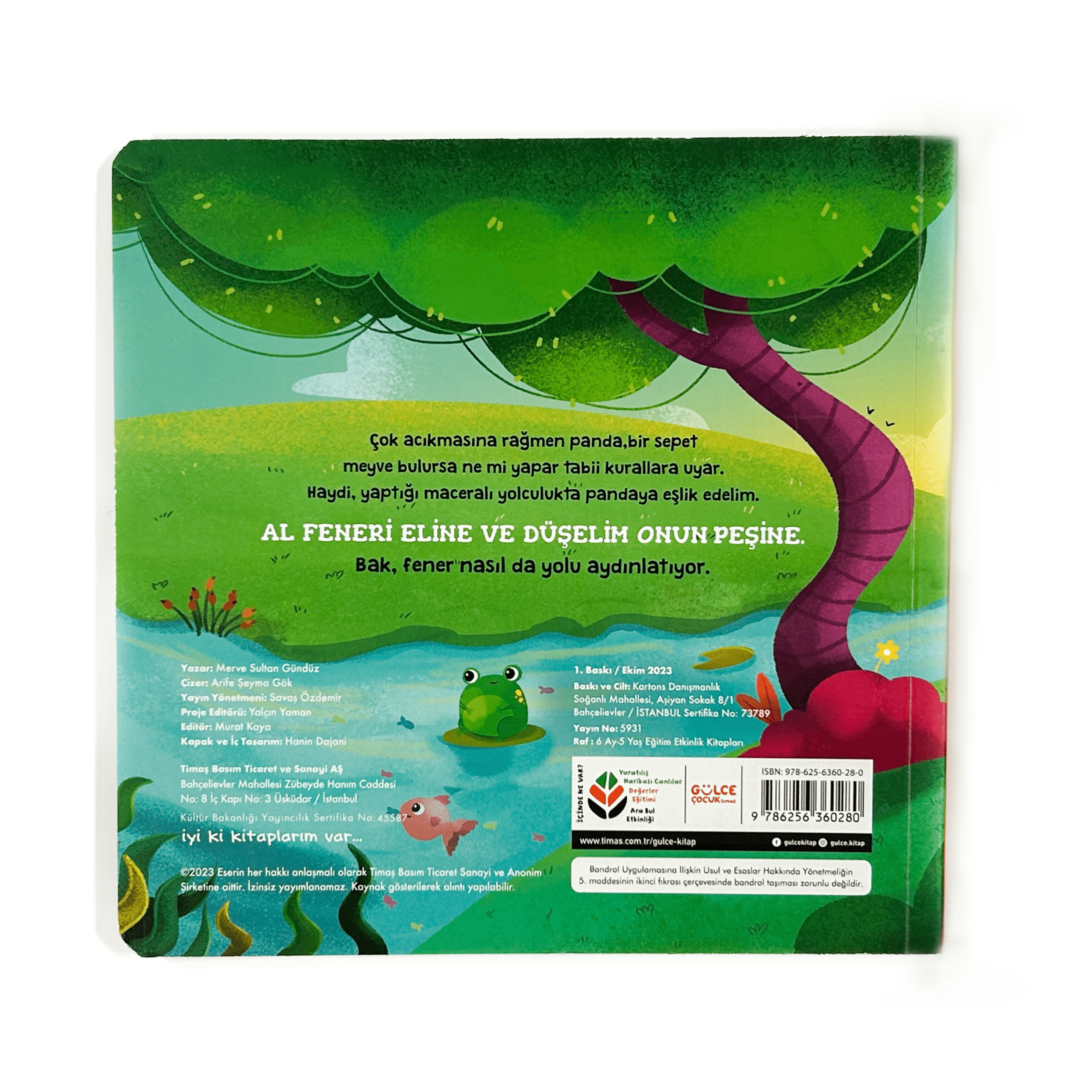 Çok acıkmasına rağmen panda, bir sepet meyve bulursa ne mi yapar tabii kurallara uyar. Haydi, yaptığı maceralı yolculukta pandaya eşlik edelim. Al feneri eline ve düşelim onun peşine. Bak, fener nasıl da yolu aydınlatıyor.