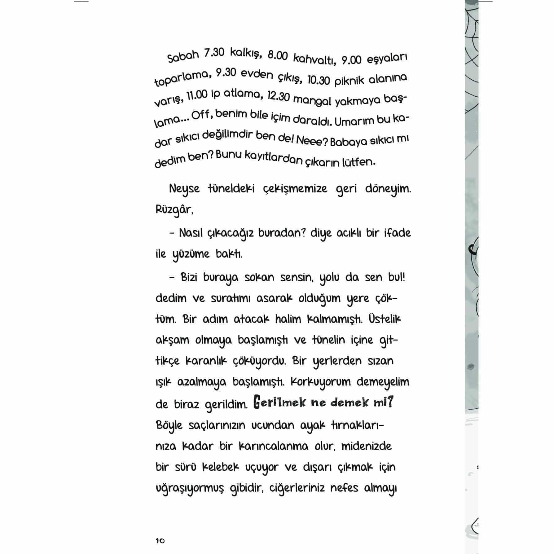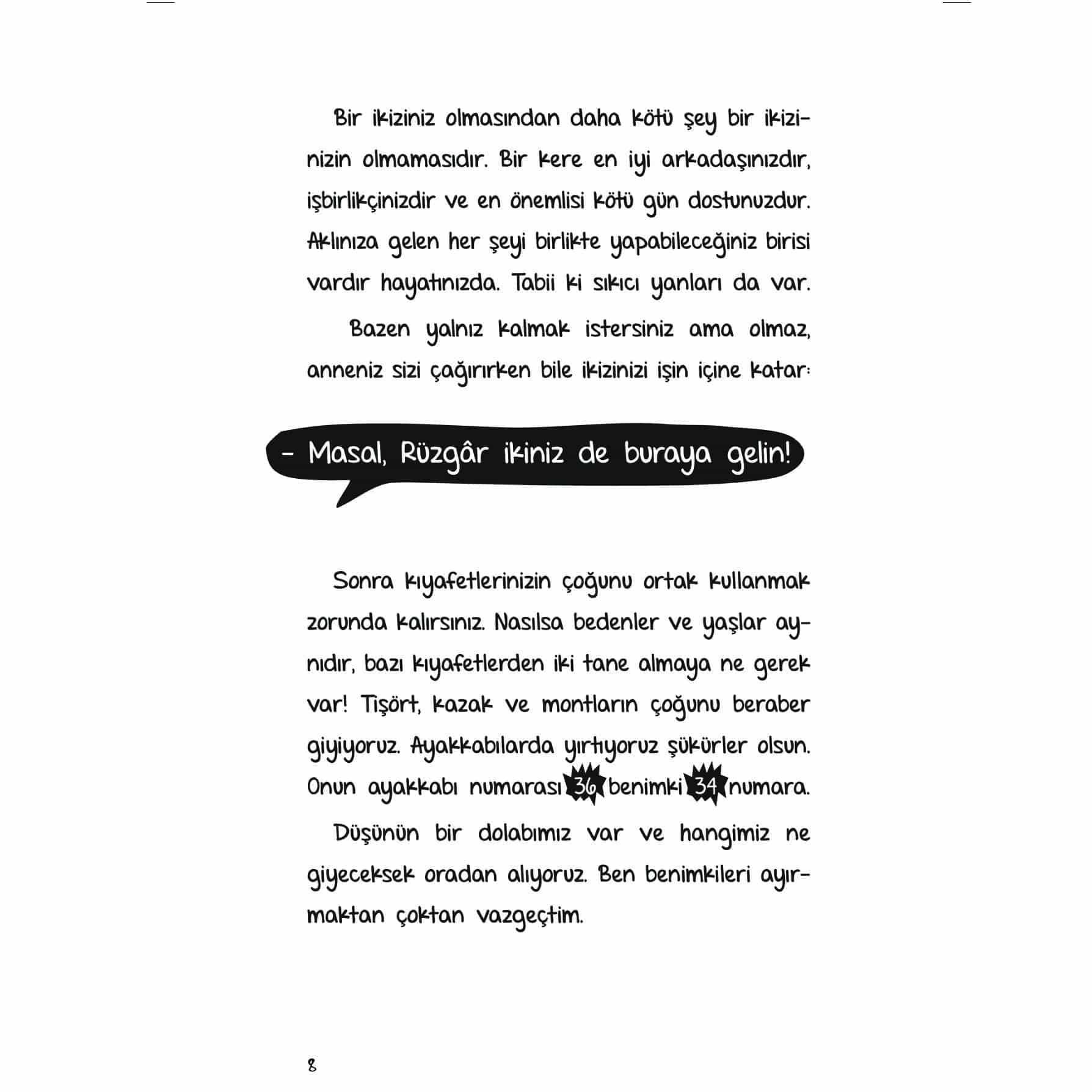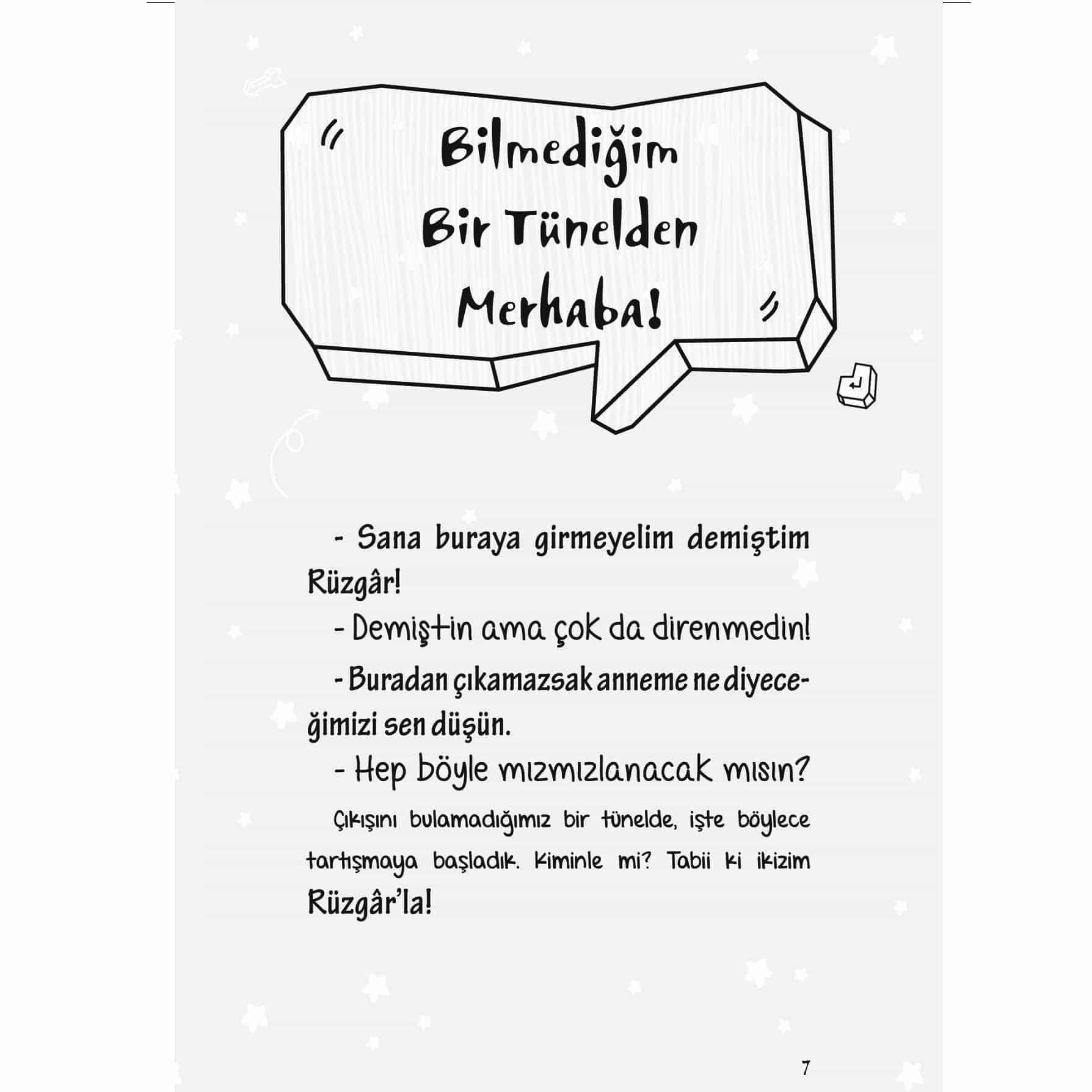 "- Neden mi kızıyorum? Çünkü sana buraya gelmeyelim dedim. Ama dinleyen kim. Sırf sen yalnız gelme diye takıldım peşine. Bu tünelin nereye çıktığı umurumda bile değil. Şimdi annemle babamla evde yemek yiyor olacaktık. Üstelik yarın sınav var ve ben hiç çalışmadan gideceğim. Tabii buradan çıkabilirsek ve annem bizi birbirimize bağlamazsa! - Çok komiksin Masal. Sen bir sınava iki hafta önceden çalışmaya başlarsın." İşte Masal ile Rüzgar'ın çekişmeli diyaloglarından sadece biri... "Masal ile Rüzgar kim, onlara ne oldu?" diye sorduğunuzu duyar gibiyim... Rüzgar, maceraperest bir çocuk. Kasabanın dışında kullanılmayan bir tren hattında gezinirken gizli bir tünel buluyor ve vakit kaybetmeden bu tünelin içinde yapacağı keşif için planlar yapıyor. Ailesinin izin vermeyeceğini bildiği için de türlü türlü muzipliklerle ikizi Masal’ı ikna ediyor… Masal nasıl biri mi? Masal, ikizi Rüzgar'ın tam zıttı. Rüzgar'a uymamak için elinden geleni yapıyor ama pek başarılı olduğunu söyleyemem...Neyse sevgili okur, bu kadar bilgi yeter. Daha fazlası için kitabı okumalısın... Birbirinden çok ama çok farklı ikiz kardeşlerin bol çekişmeli, deli dolu maceraları seni bekliyor!