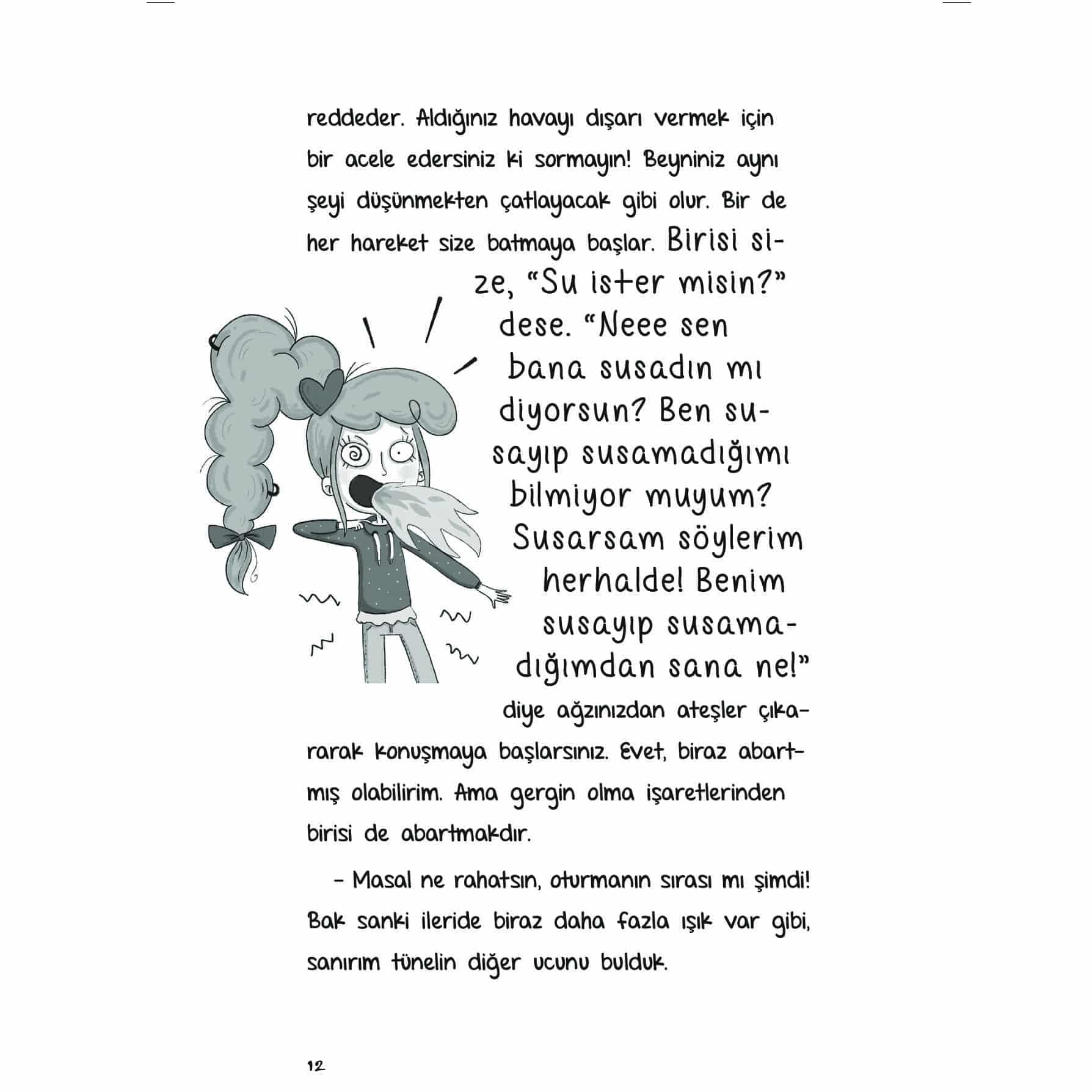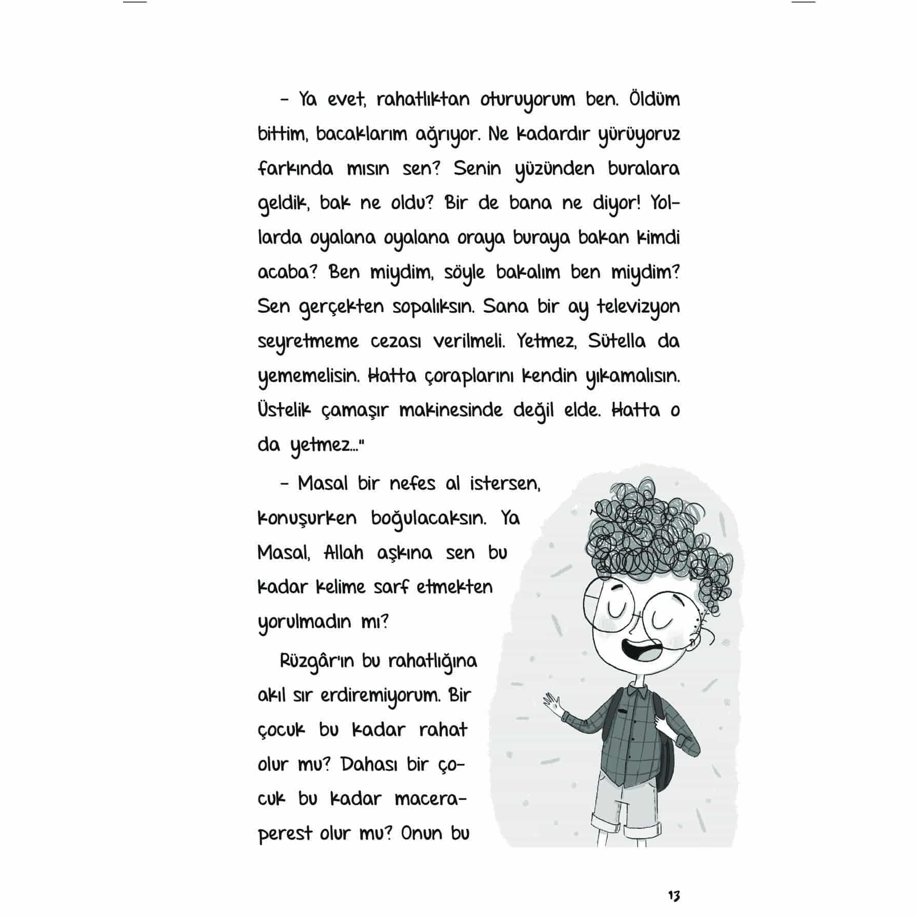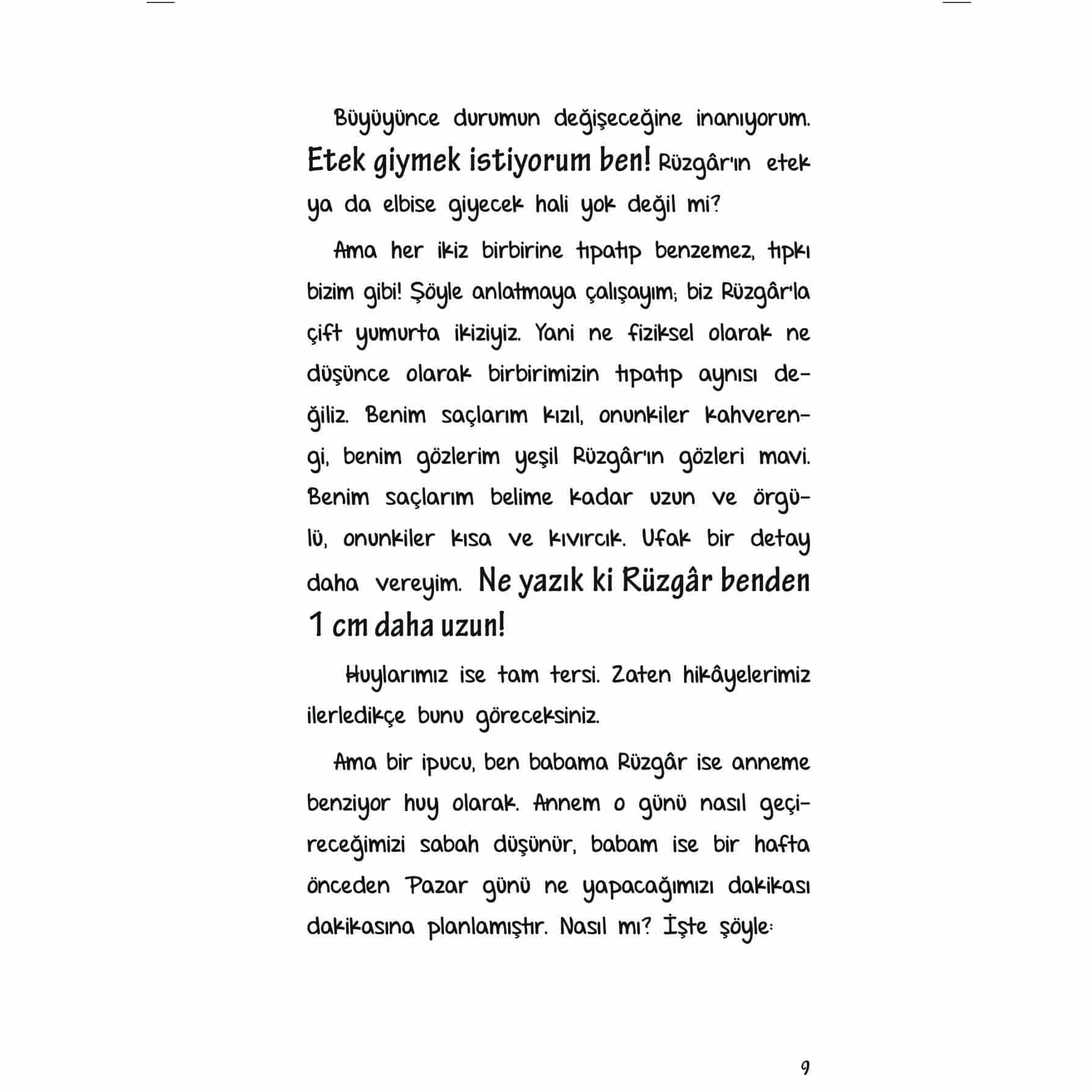 "- Neden mi kızıyorum? Çünkü sana buraya gelmeyelim dedim. Ama dinleyen kim. Sırf sen yalnız gelme diye takıldım peşine. Bu tünelin nereye çıktığı umurumda bile değil. Şimdi annemle babamla evde yemek yiyor olacaktık. Üstelik yarın sınav var ve ben hiç çalışmadan gideceğim. Tabii buradan çıkabilirsek ve annem bizi birbirimize bağlamazsa! - Çok komiksin Masal. Sen bir sınava iki hafta önceden çalışmaya başlarsın." İşte Masal ile Rüzgar'ın çekişmeli diyaloglarından sadece biri... "Masal ile Rüzgar kim, onlara ne oldu?" diye sorduğunuzu duyar gibiyim... Rüzgar, maceraperest bir çocuk. Kasabanın dışında kullanılmayan bir tren hattında gezinirken gizli bir tünel buluyor ve vakit kaybetmeden bu tünelin içinde yapacağı keşif için planlar yapıyor. Ailesinin izin vermeyeceğini bildiği için de türlü türlü muzipliklerle ikizi Masal’ı ikna ediyor… Masal nasıl biri mi? Masal, ikizi Rüzgar'ın tam zıttı. Rüzgar'a uymamak için elinden geleni yapıyor ama pek başarılı olduğunu söyleyemem...Neyse sevgili okur, bu kadar bilgi yeter. Daha fazlası için kitabı okumalısın... Birbirinden çok ama çok farklı ikiz kardeşlerin bol çekişmeli, deli dolu maceraları seni bekliyor!