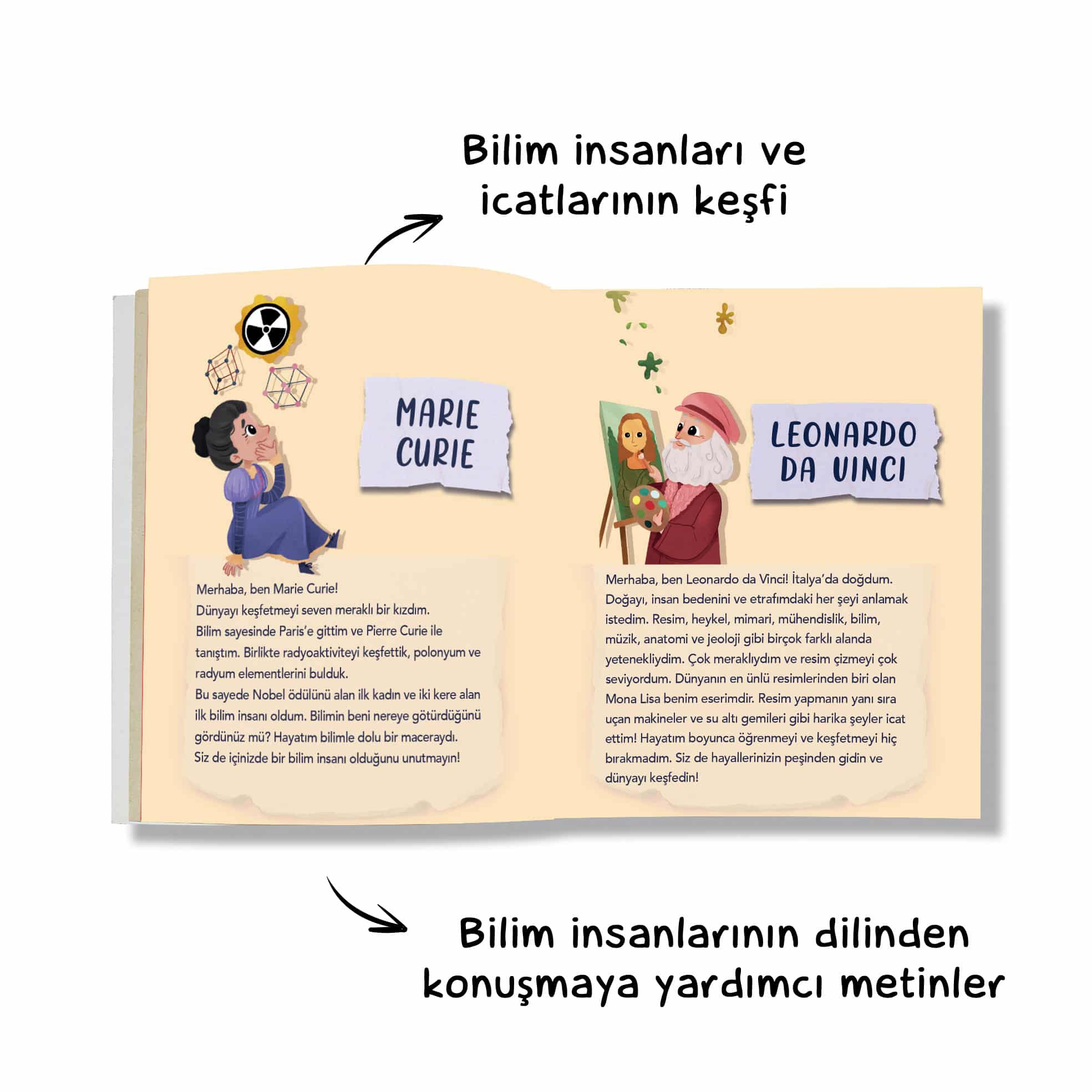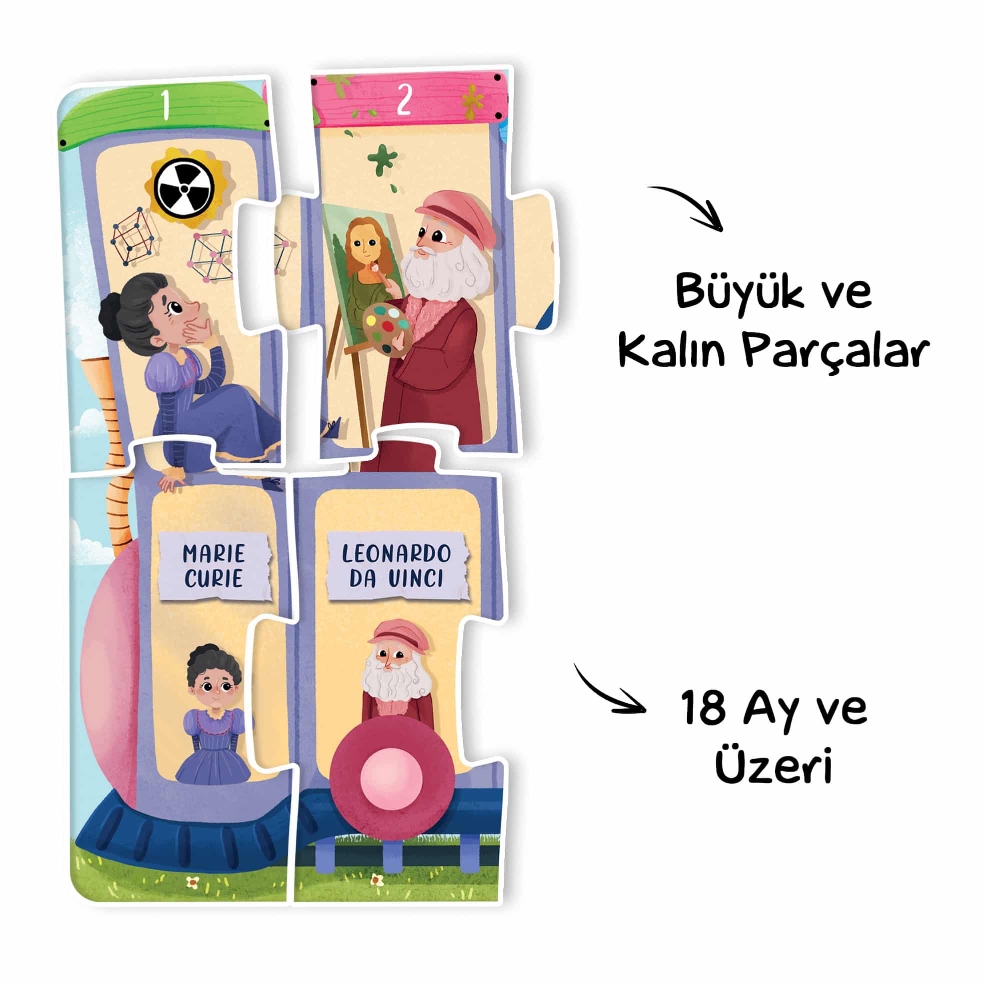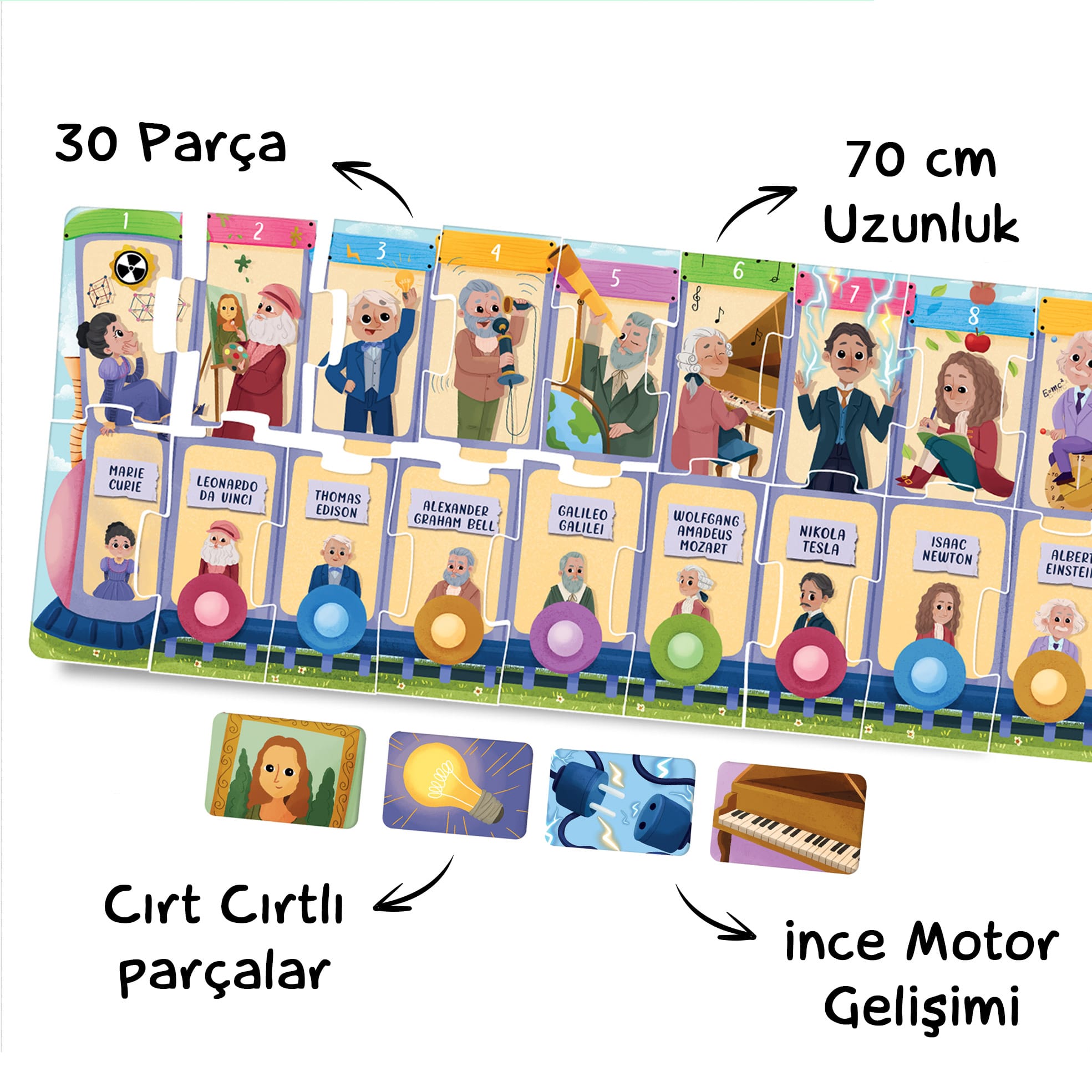 Bu trende kimler mi var? Hadi birlikte keşfedelim! Marie Cruie’den Thomas Edison’a, Einstein’dan Azi Sancar’a… Birçok bilim insanı bu trende! Yapbozu tamamlayın, upuzuuuun treni oluşturun! Bilim insanlarını ve keşiflerini tamamlarken kitapçığı da incelemeyi unutmayın!
