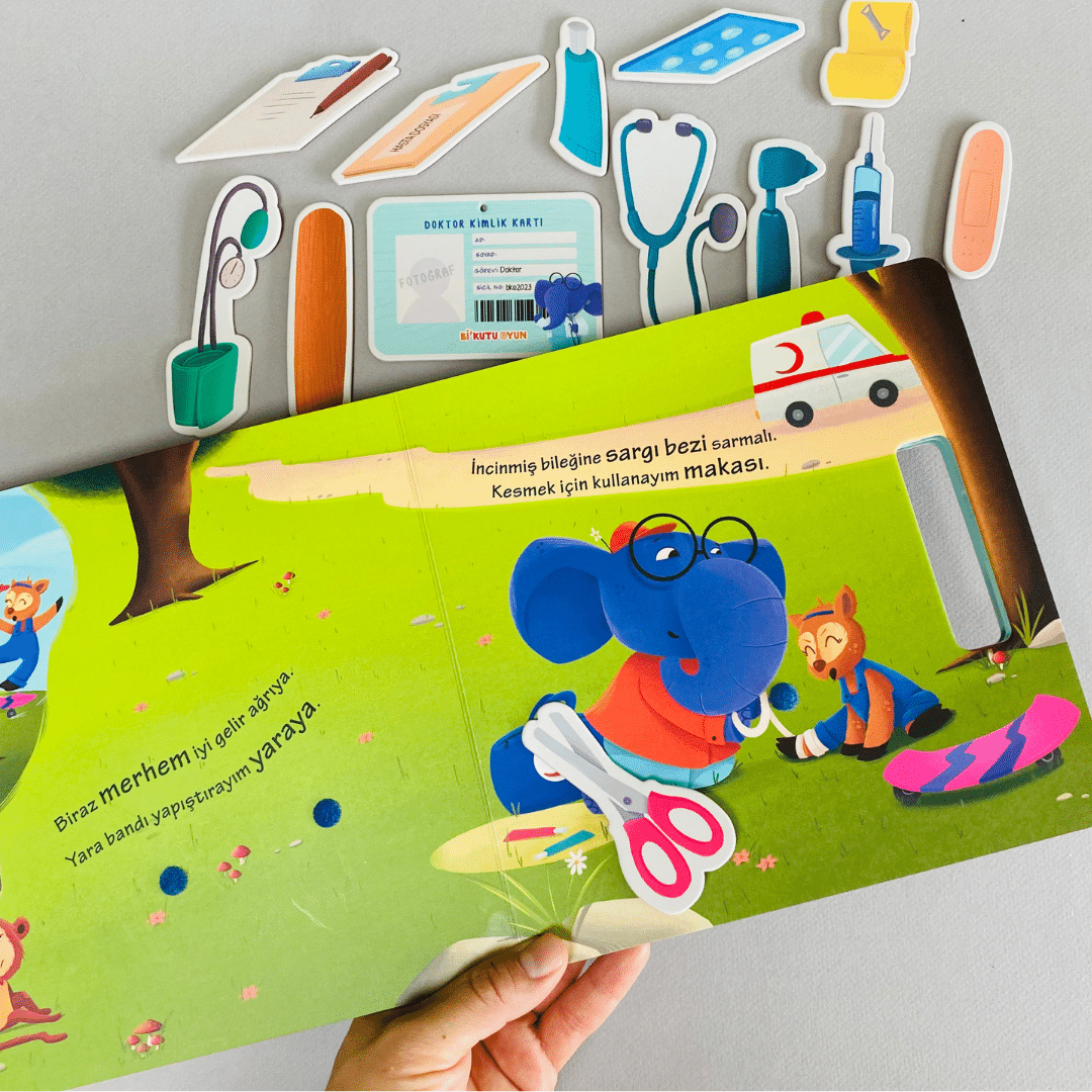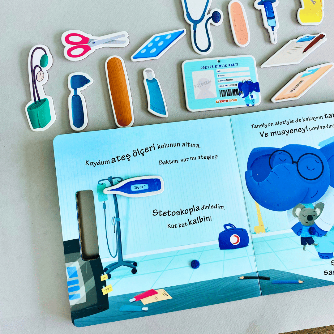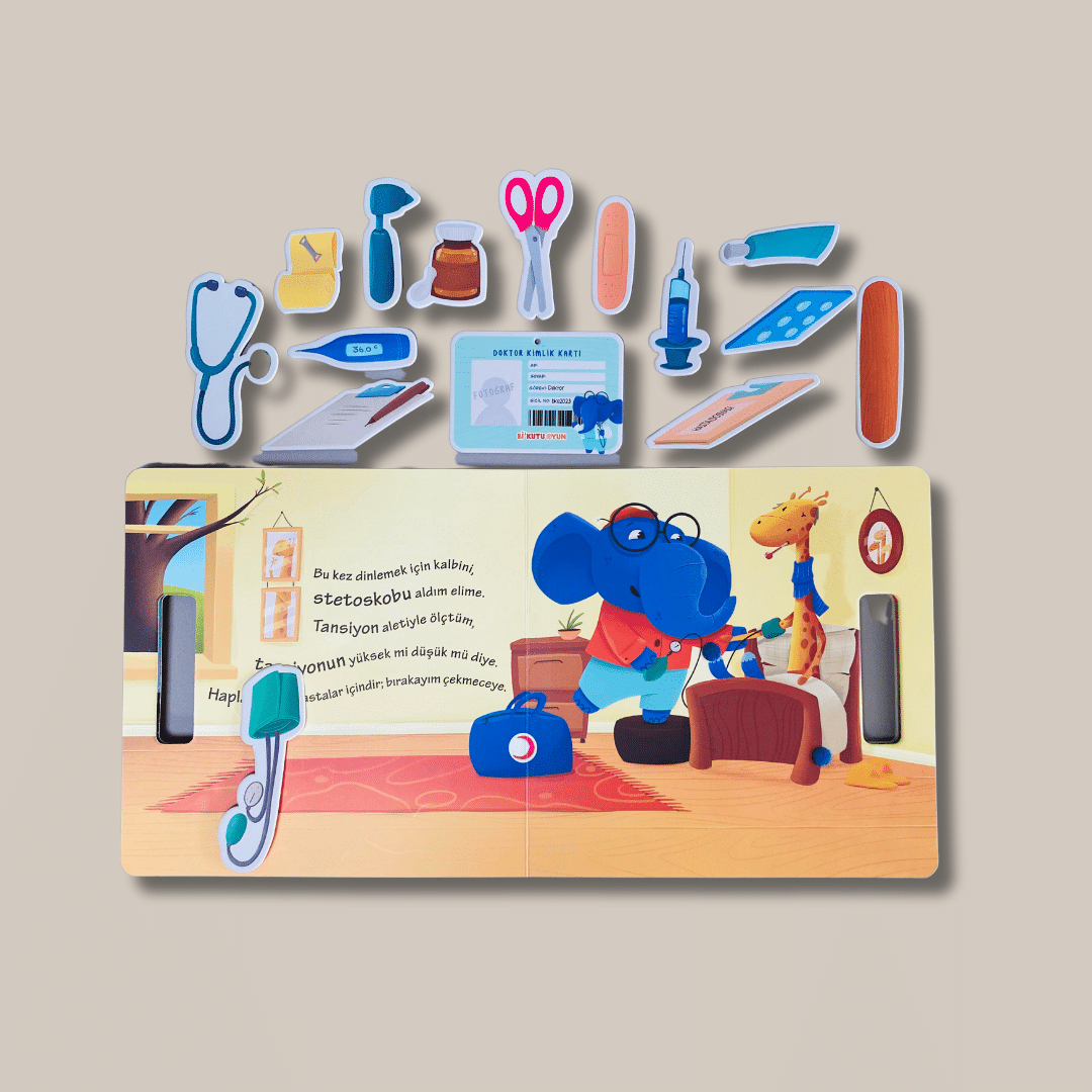 Giydim doktor önlüğümü, aldım çantamı yanıma. Stetoskop, otoskop, tansiyon aleti ve daha pek çoğu tanışmayı bekliyor bu kitapta. Haydi, çıkalım yola. Bakalım kimlerin ihtiyacı varmış yardıma?
