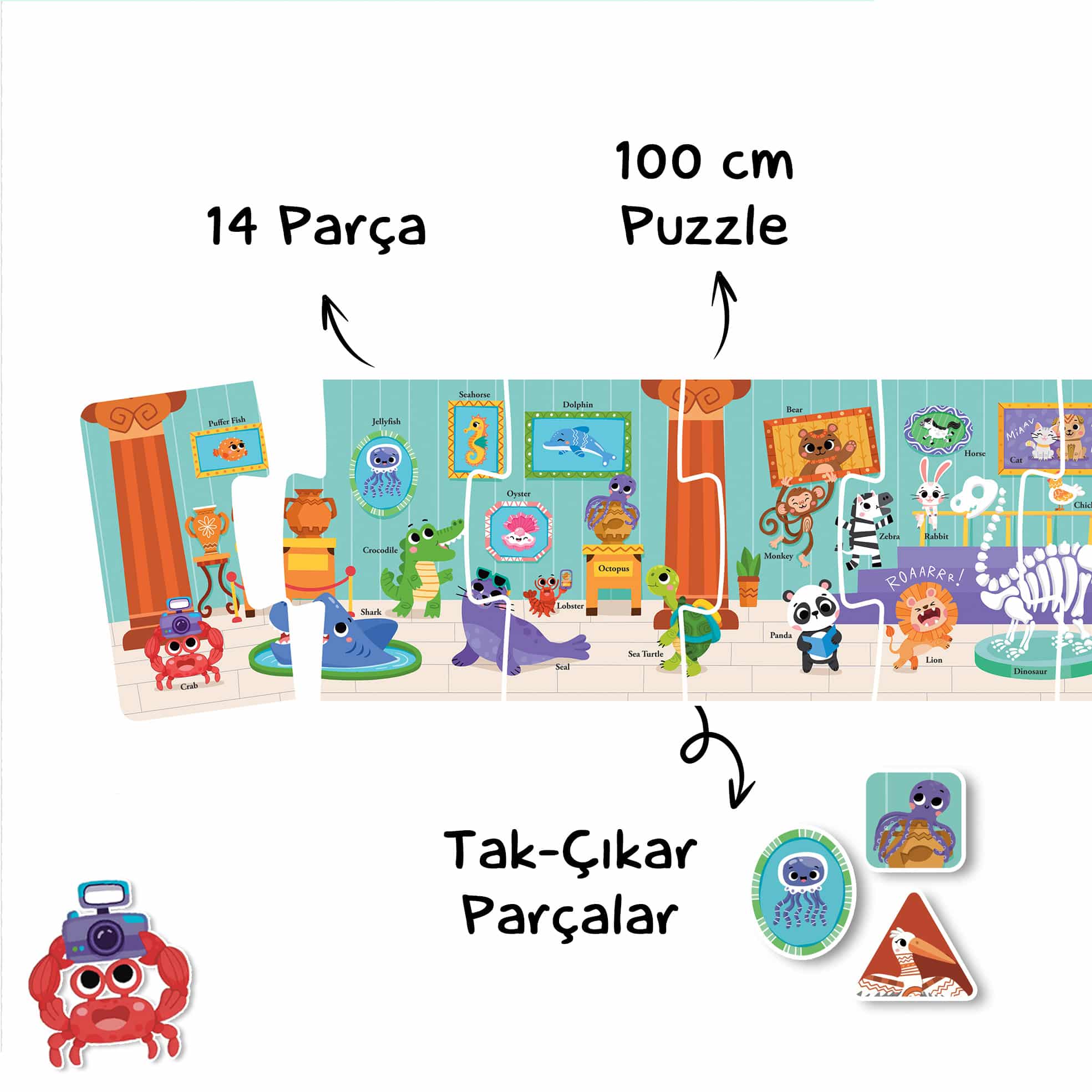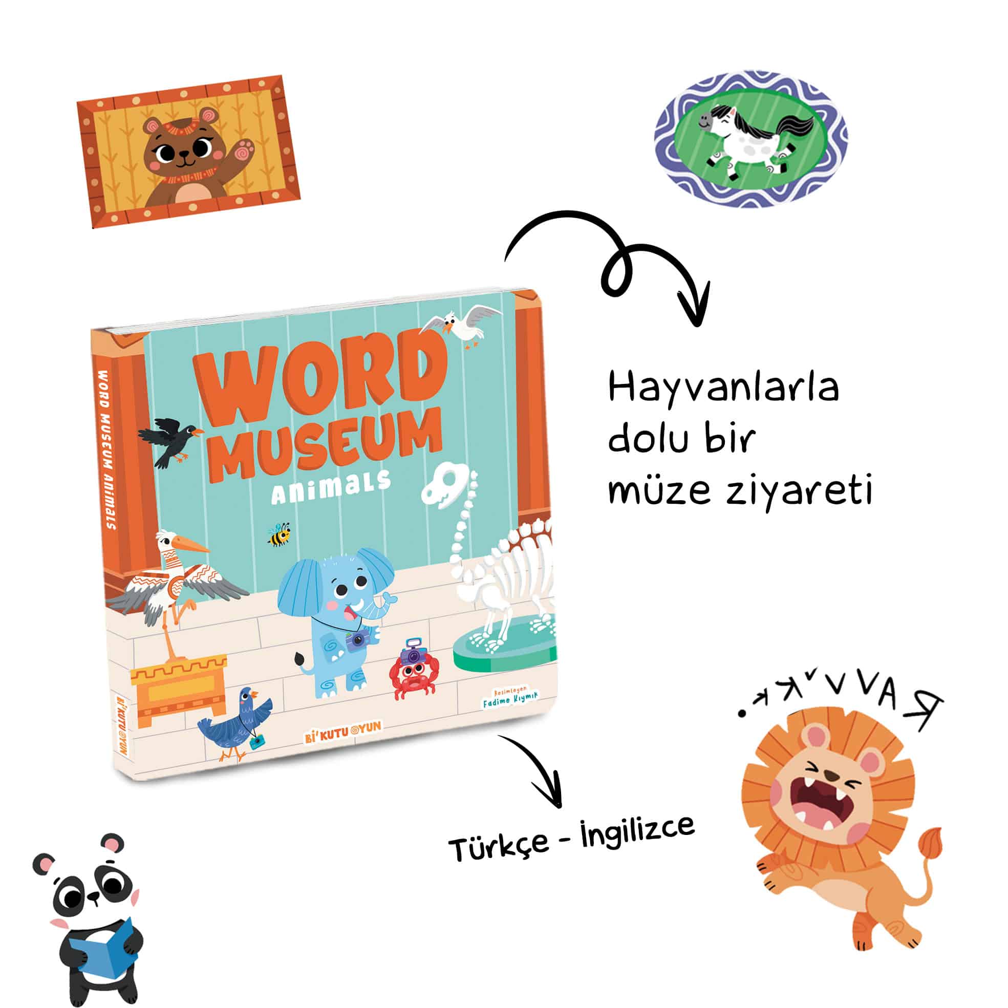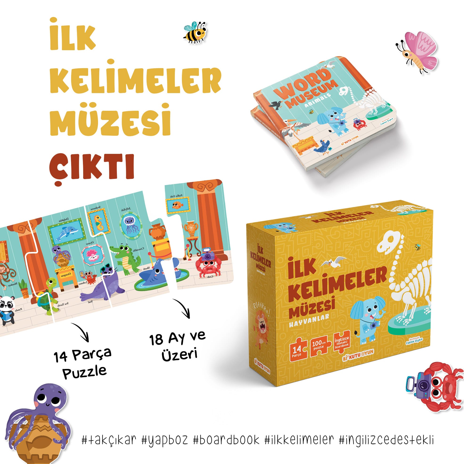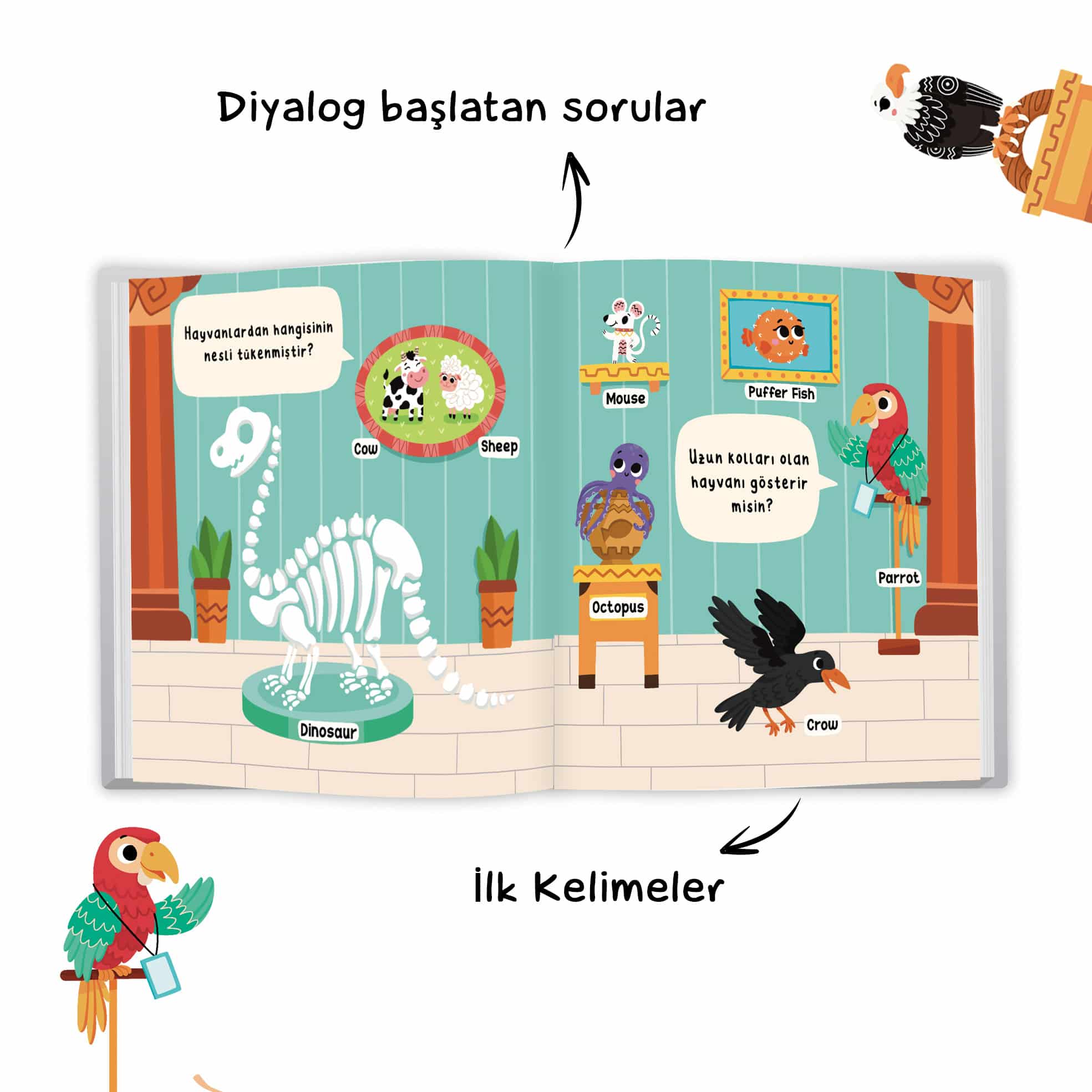 Puzzle’I tamamlayıp kocaman bir müzeyi keşfetmeye hazır mısın? Müzede seni pek çok hayvan bekliyor. Bu hayvanların Türkçe ve İngilizce isimlerini kitabından inceleyebilirsin. Haydi hemen puzzle’I tamamla ve İlk Kelimeler Müzesi’nin eğlenceli dünyasına adım at!