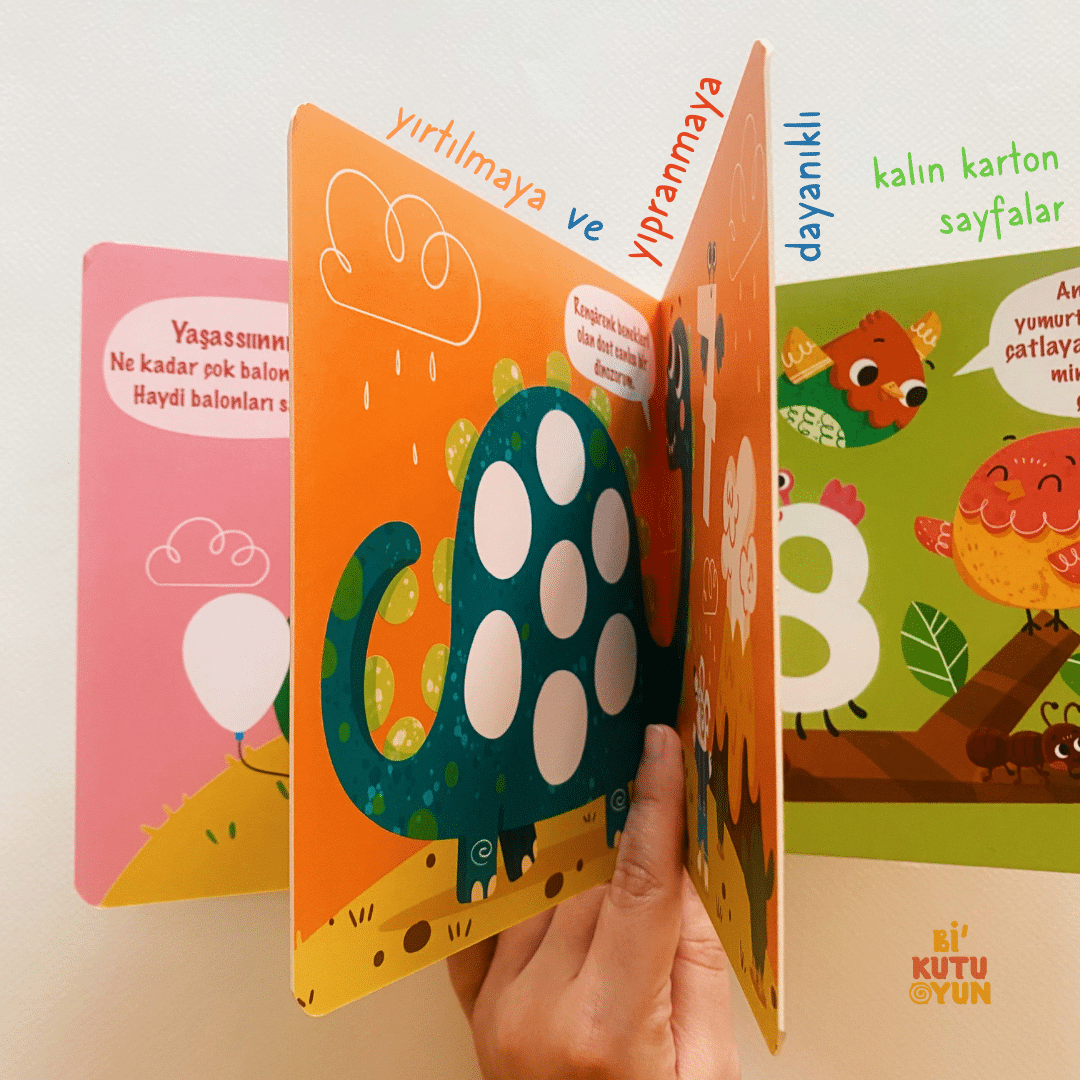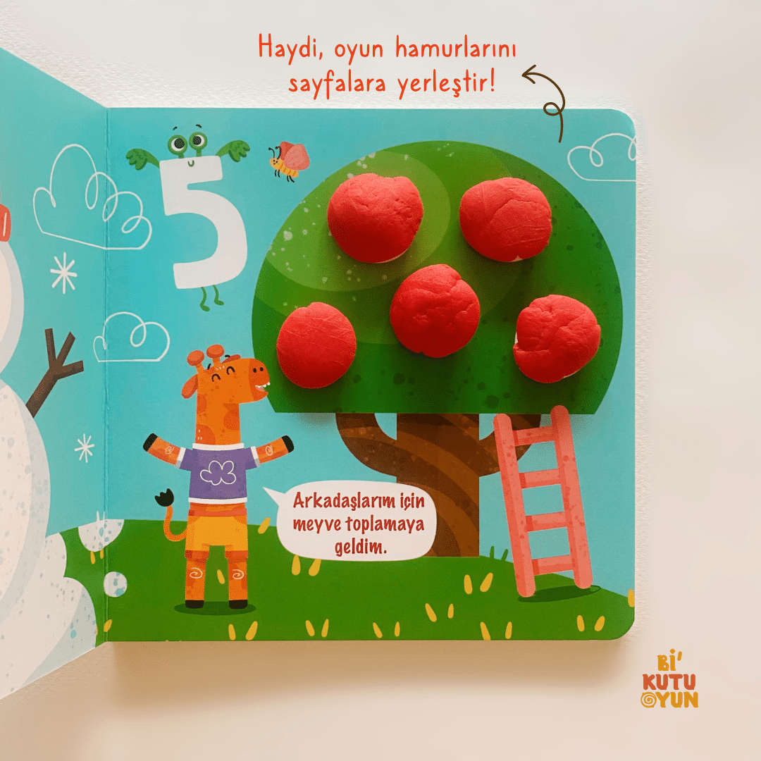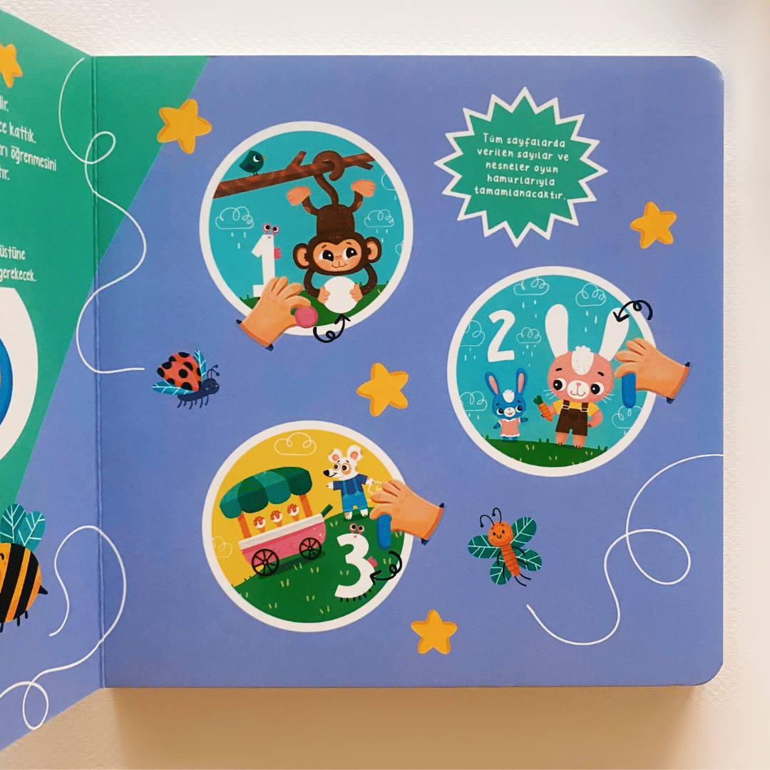 Bir, iki, üç sayıları öğreniyorum. Bir top, iki kulak, üç top dondurma, birer birer sayıyorum. Güneş ışınları, dinozorun benekleri, kardan adamın düğmeleri ne kadar da eğlenceli! Renkli hamurlarımla tüm resimleri tamamlıyorum. Hem sayıları öğreniyorum hem ince motor becerilerimi geliştiriyorum hem de hayal gücümü destekliyorum. Haydi başlayalım.