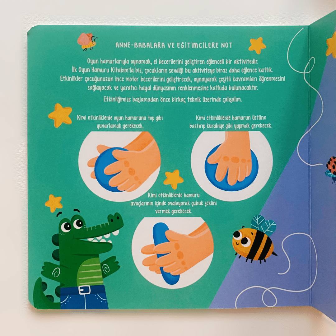 İlk Oyun Hamuru Kitabım’la biz çocukların sevdiği bu aktiviteye biraz daha eğlence kattık. Etkinlikler çocuğunuzun ince motor becerilerini geliştirecek, oynayarak çeşitli kavramları öğrenmesini sağlayacak ve yaratıcı hayal dünyasının renklenmesine katkıda bulunacaktır. Dokunsal ve görsel bir farkındalık oluşturacak olan oyun hamuru kitabımız çocuklarımız ve ailelerimiz tarafından çok sevilecektir.