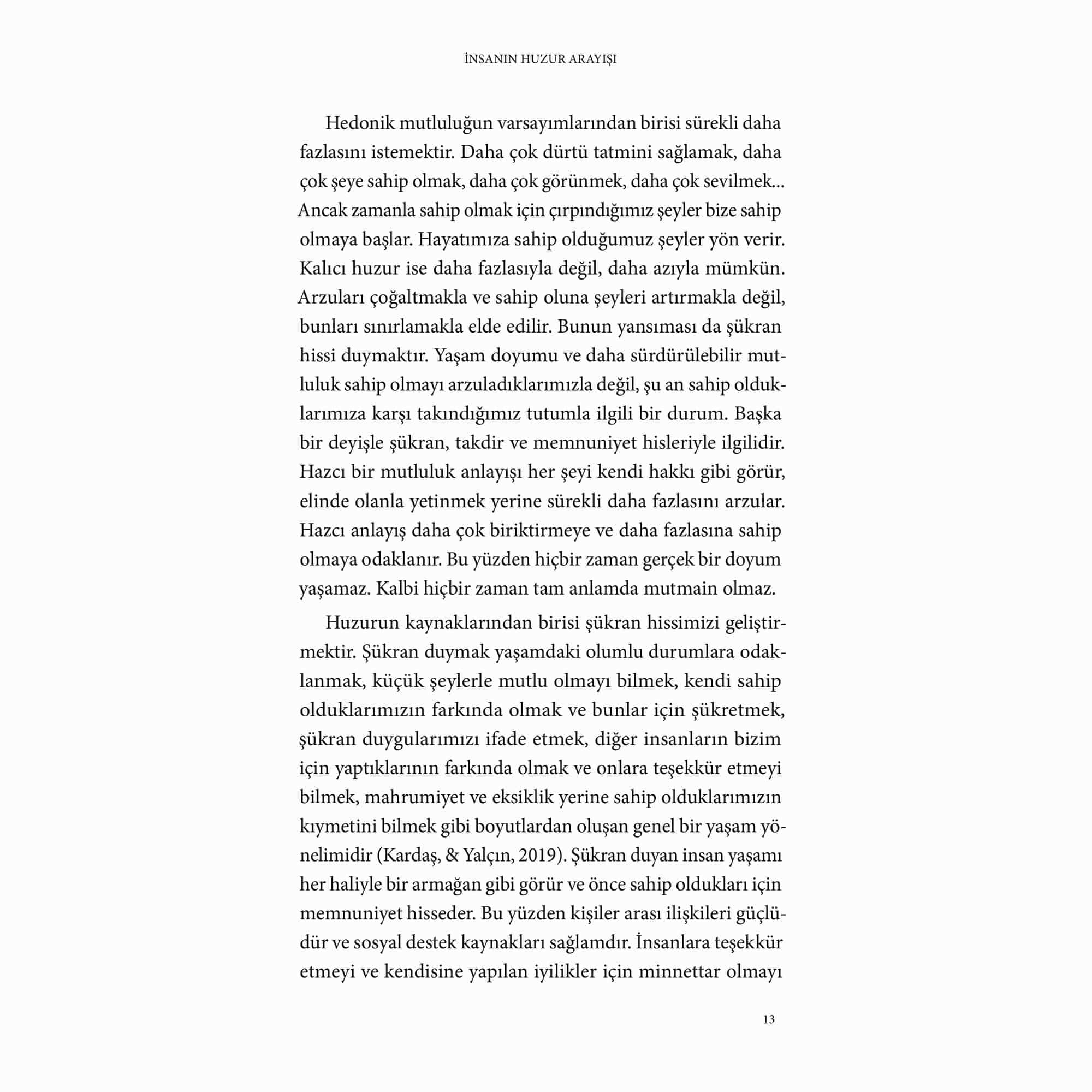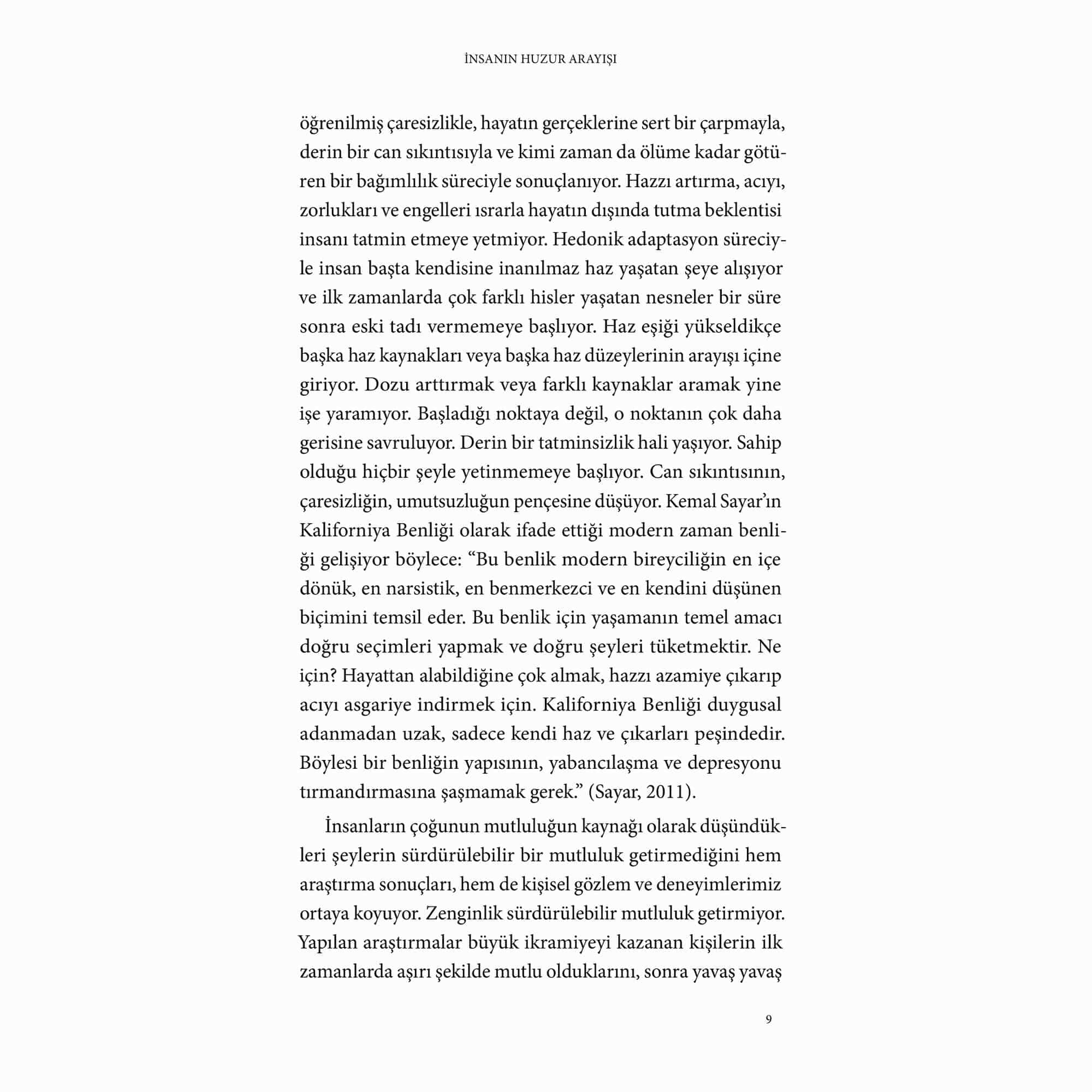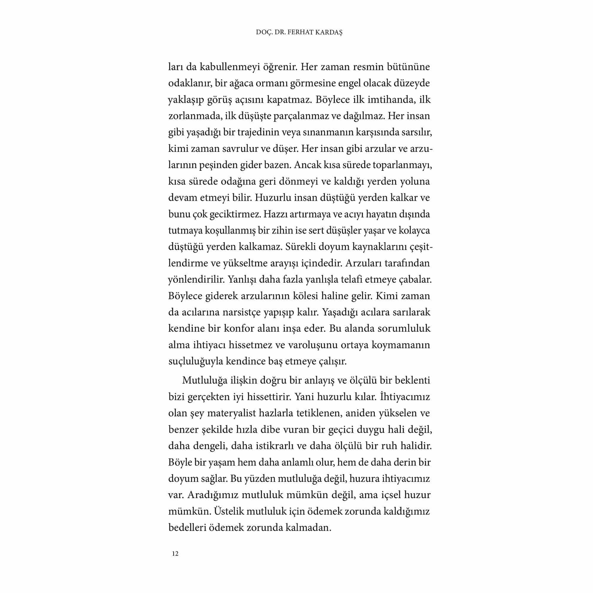 Mutluluk üzerine yapılan araştırmalar son zamanlarda hiç olmadığı kadar çoğalmış durumda. İnsanlar her fırsatta mutluluk denilen şeyi tatmak ve bunu kalıcı hale getirmek istiyor. Çoğu insan da acıları, zorlukları, engelleri, olumsuzlukları hayatının dışında tutarak büyük mutluluk ödülüne ulaşmanın peşinde. Bütün bu çabaya rağmen mutlu değiliz ve ruhsal patolojilerimiz giderek çoğalıyor. Psikiyatri kitaplarına sürekli yeni psikolojik rahatsızlıklar ekleniyor. Depresyon, kaygı, yeme bozuklukları, intiharlar, bağımlılık, cinsel sorunlar, alkolizm, yalnızlık, düşük benlik saygısı, kumar bağımlılığı gibi sorunlar hiç olmadığı kadar fazla ve hızla artmaya devam ediyor. Mutluluk meselesi söz konusu olunca yanlış yerde yanlış şeyi aramak, insanın trajedisini derinleştiriyor sadece. Sahip olduğu hiçbir şeyle yetinmeyen insan can sıkıntısının, çaresizliğin, umutsuzluğun pençesine düşüyor. Oysa bütün zorluklara, acı ve imtihanlara rağmen güzele ulaşmak, iyi hissetmek mümkün. İhtiyaç duyduğumuz, aradığımız şey hazza dayanan hedonik bir mutluluk değil; sakinliğe, dinginliğe, kabullenmeye dayanan bir iç huzurudur. Mutluluğu değil, huzuru aramamız gerekiyor aslında. Doç. Dr. Ferhat Kardaş’tan alışılmış örneklerden farklı, mutluluk ve huzur arayışını odağına alan değerli bir çalışma İnsanın Huzur Arayışı...