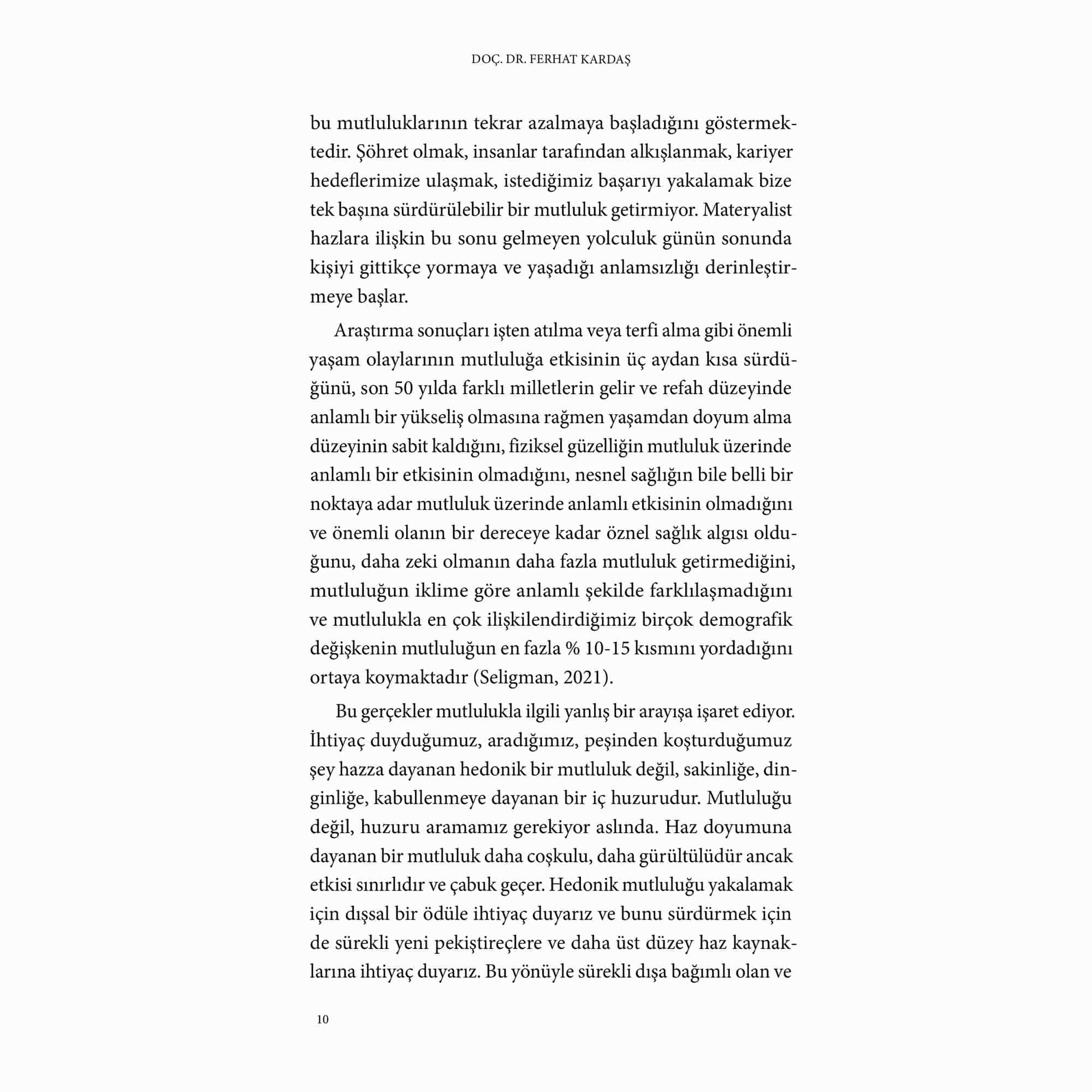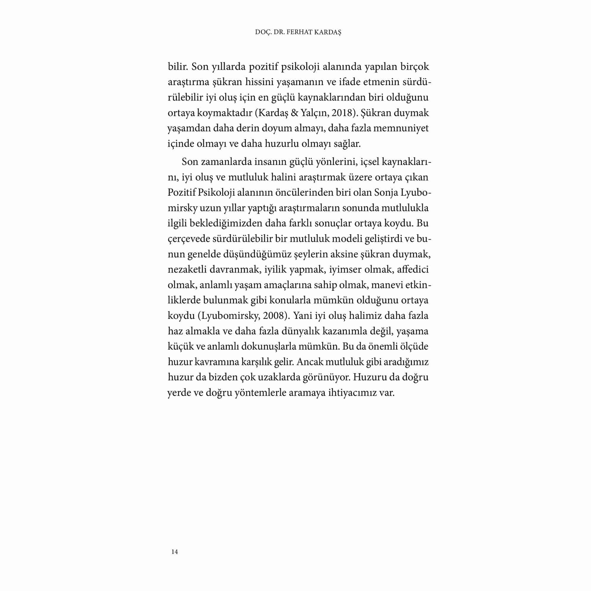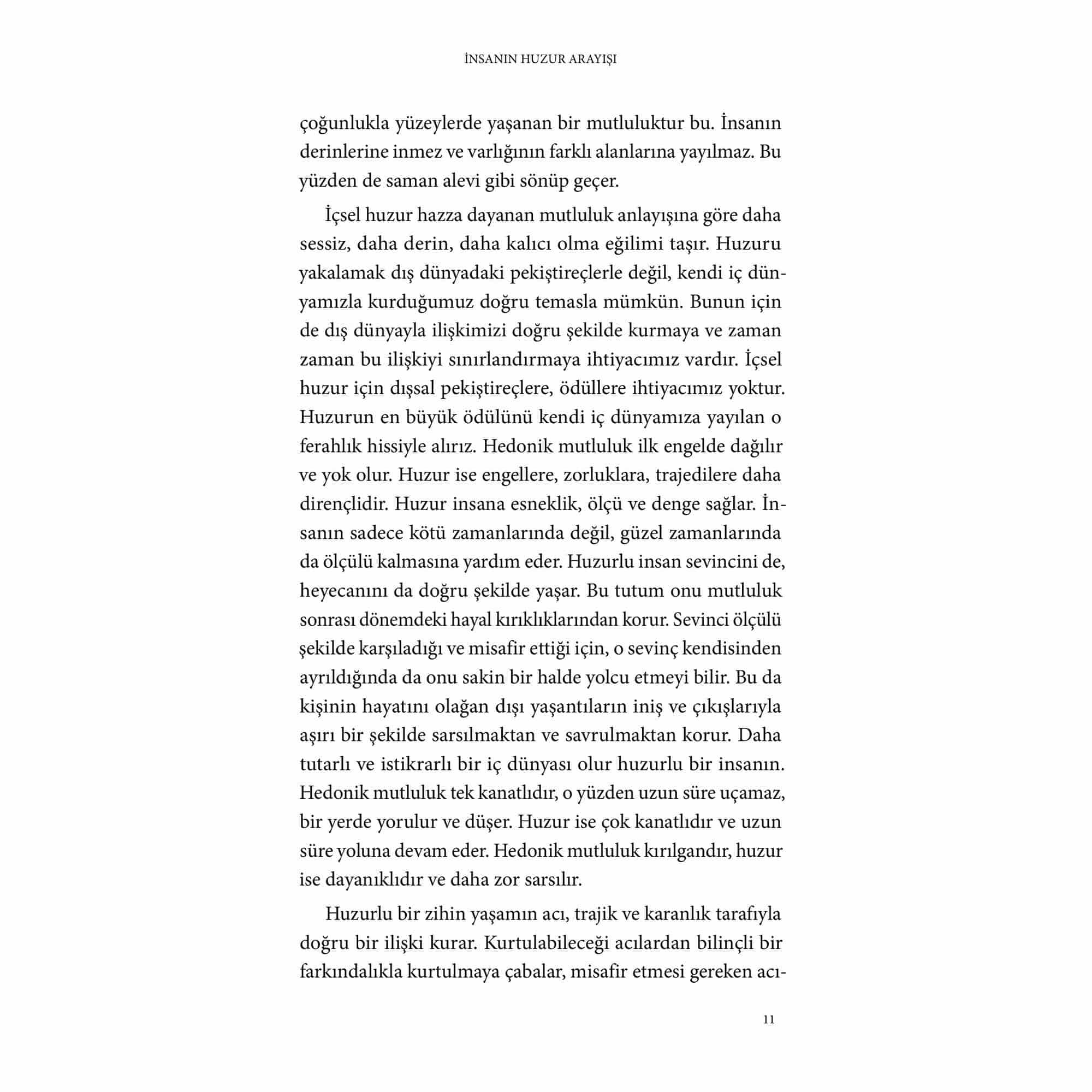 Mutluluk üzerine yapılan araştırmalar son zamanlarda hiç olmadığı kadar çoğalmış durumda. İnsanlar her fırsatta mutluluk denilen şeyi tatmak ve bunu kalıcı hale getirmek istiyor. Çoğu insan da acıları, zorlukları, engelleri, olumsuzlukları hayatının dışında tutarak büyük mutluluk ödülüne ulaşmanın peşinde. Bütün bu çabaya rağmen mutlu değiliz ve ruhsal patolojilerimiz giderek çoğalıyor. Psikiyatri kitaplarına sürekli yeni psikolojik rahatsızlıklar ekleniyor. Depresyon, kaygı, yeme bozuklukları, intiharlar, bağımlılık, cinsel sorunlar, alkolizm, yalnızlık, düşük benlik saygısı, kumar bağımlılığı gibi sorunlar hiç olmadığı kadar fazla ve hızla artmaya devam ediyor. Mutluluk meselesi söz konusu olunca yanlış yerde yanlış şeyi aramak, insanın trajedisini derinleştiriyor sadece. Sahip olduğu hiçbir şeyle yetinmeyen insan can sıkıntısının, çaresizliğin, umutsuzluğun pençesine düşüyor. Oysa bütün zorluklara, acı ve imtihanlara rağmen güzele ulaşmak, iyi hissetmek mümkün. İhtiyaç duyduğumuz, aradığımız şey hazza dayanan hedonik bir mutluluk değil; sakinliğe, dinginliğe, kabullenmeye dayanan bir iç huzurudur. Mutluluğu değil, huzuru aramamız gerekiyor aslında. Doç. Dr. Ferhat Kardaş’tan alışılmış örneklerden farklı, mutluluk ve huzur arayışını odağına alan değerli bir çalışma İnsanın Huzur Arayışı...