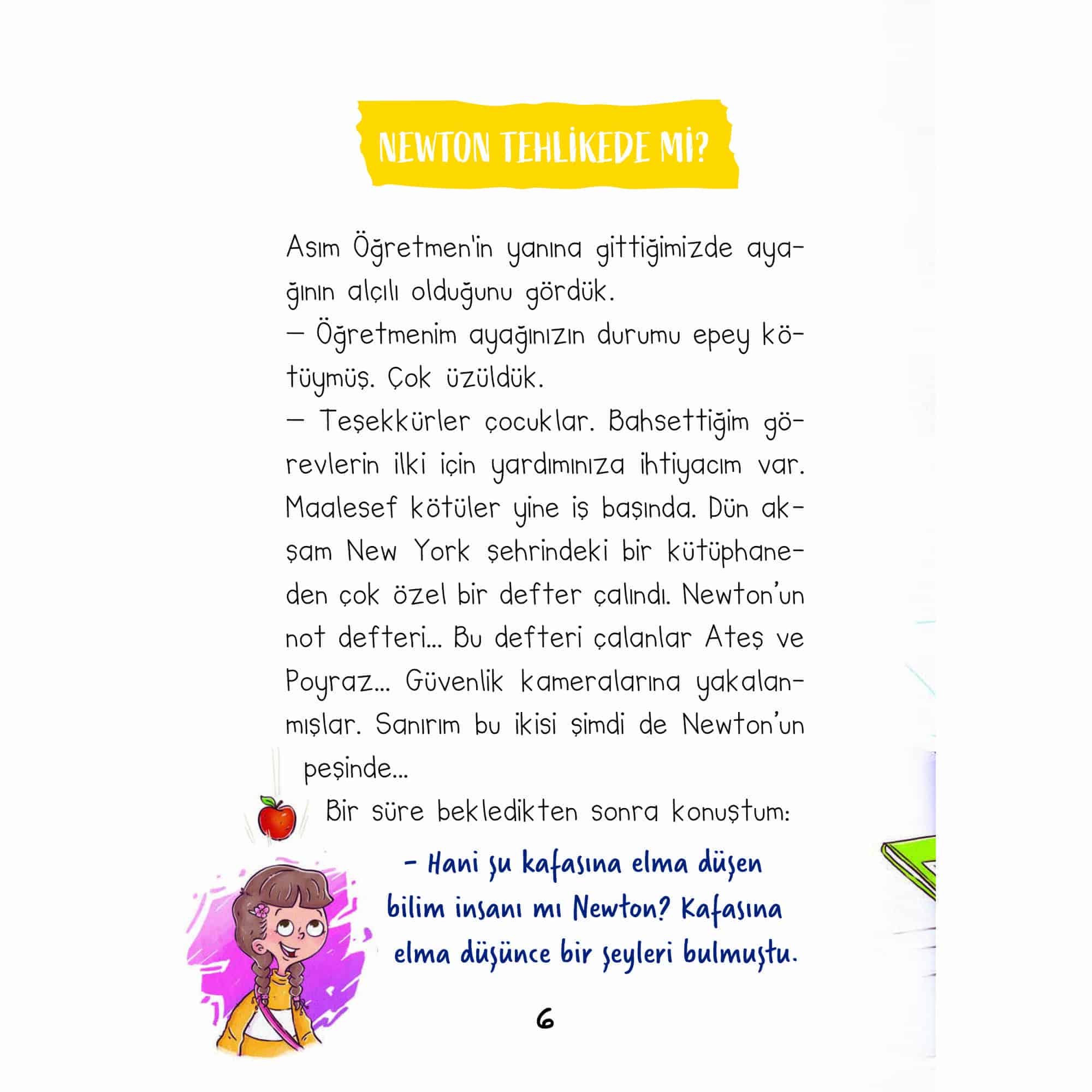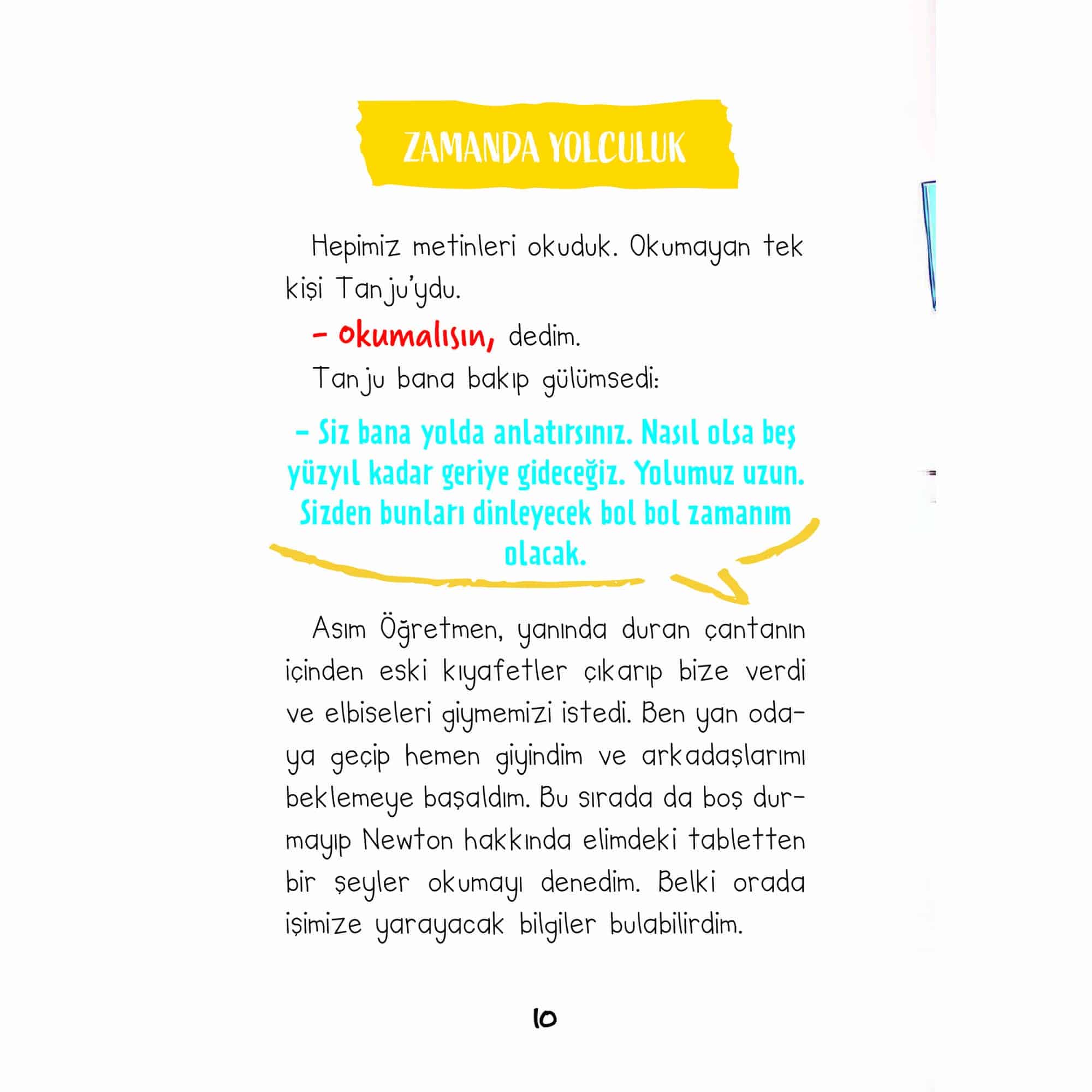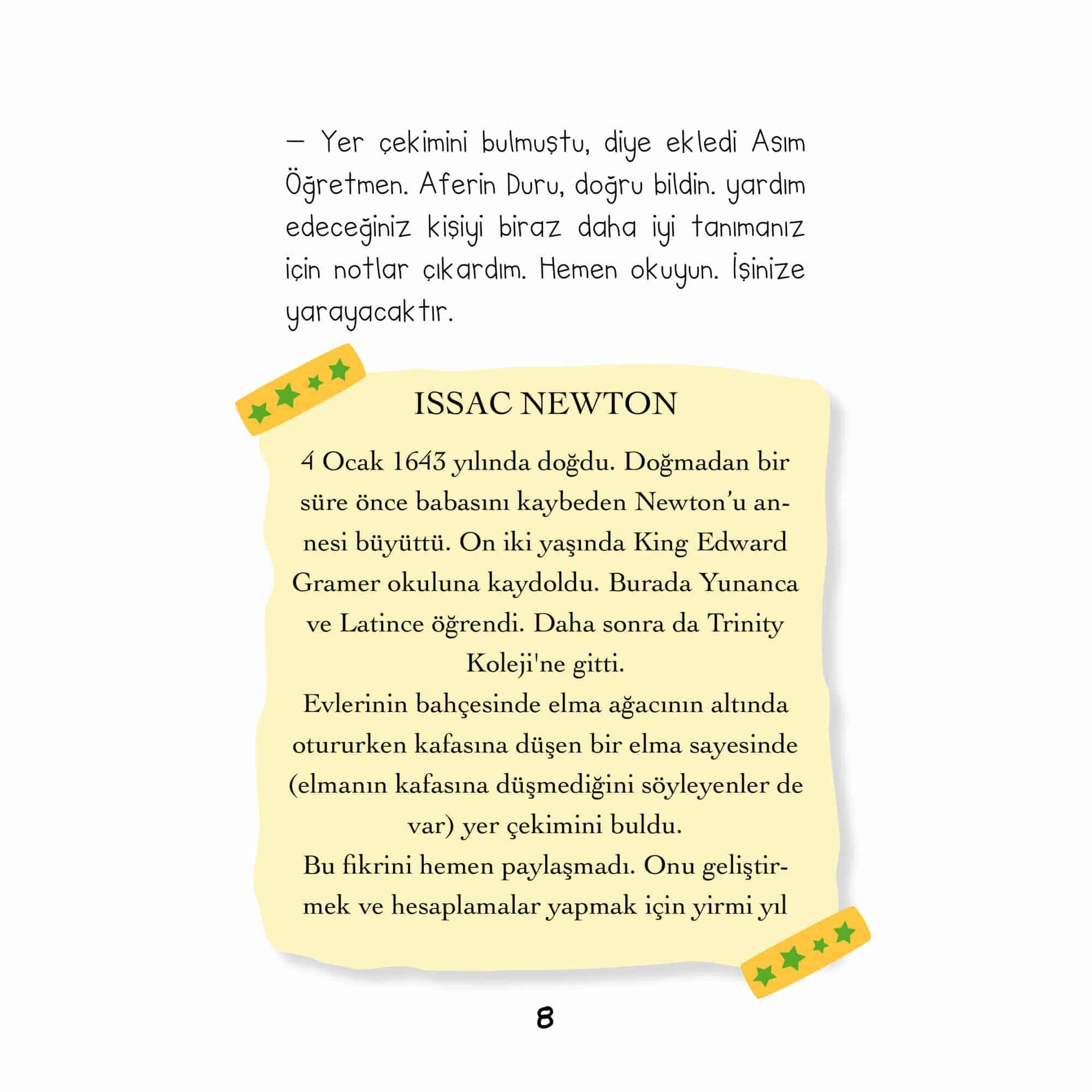 Çok sevilen Levent serisinin yazarı Mustafa Orakçı bu defa okurlarını Duru, Mete ve Tanju’yla tanışmaya davet ediyor. Yazdığı her kitapla okurlarının beğenisini toplayan, çocuklara okumayı sevdiren yazar olarak bilinen Mustafa Orakçı’nın “Bilim İnsanlarının İzinde” serisi beş kitaptan oluşuyor. Serinin bu kitabında kahramanlarımız, yaptıkları zaman yolculukları sayesinde Isaac Newton'la tanışıyor. Hem onu ve onun buluşlarını yakından tanıyor hem de kötü niyetli zaman yolcuları Ateş ve Poyraz’ın planlarını bozuyor.