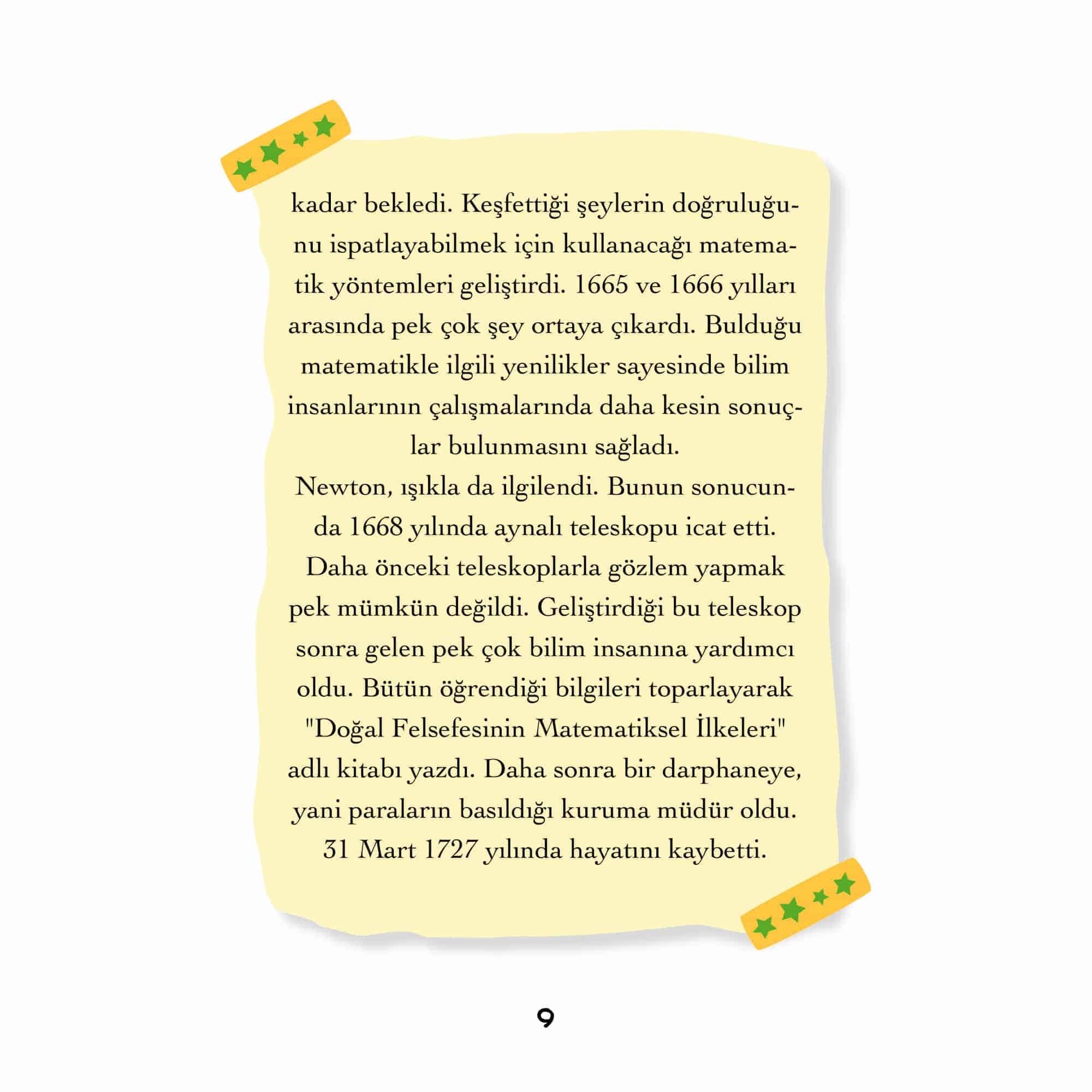 Bilim İnsanlarının İzinde serisinin "Isaac Newton" isimli bu birinci kitabıyla maceraya atılmaya hazır mısın? Duru, Mete ve Tanju seni zamanda yolculuk yapmaya davet ediyor! Asım Öğretmen'in zaman makinesiyle geçmişe giden çocuklar, kötü niyetli zaman yolcuları Ateş ve Poyraz'ı engellemek zorunda. Isaac Newton'un yanına giden üç arkadaş, onunla tanışacak ve Newton'un bilim dünyasını değişecek meşhur kitaplarını Ateş ve Poyraz'ın elinden kurtarmaya çalışacaklar.