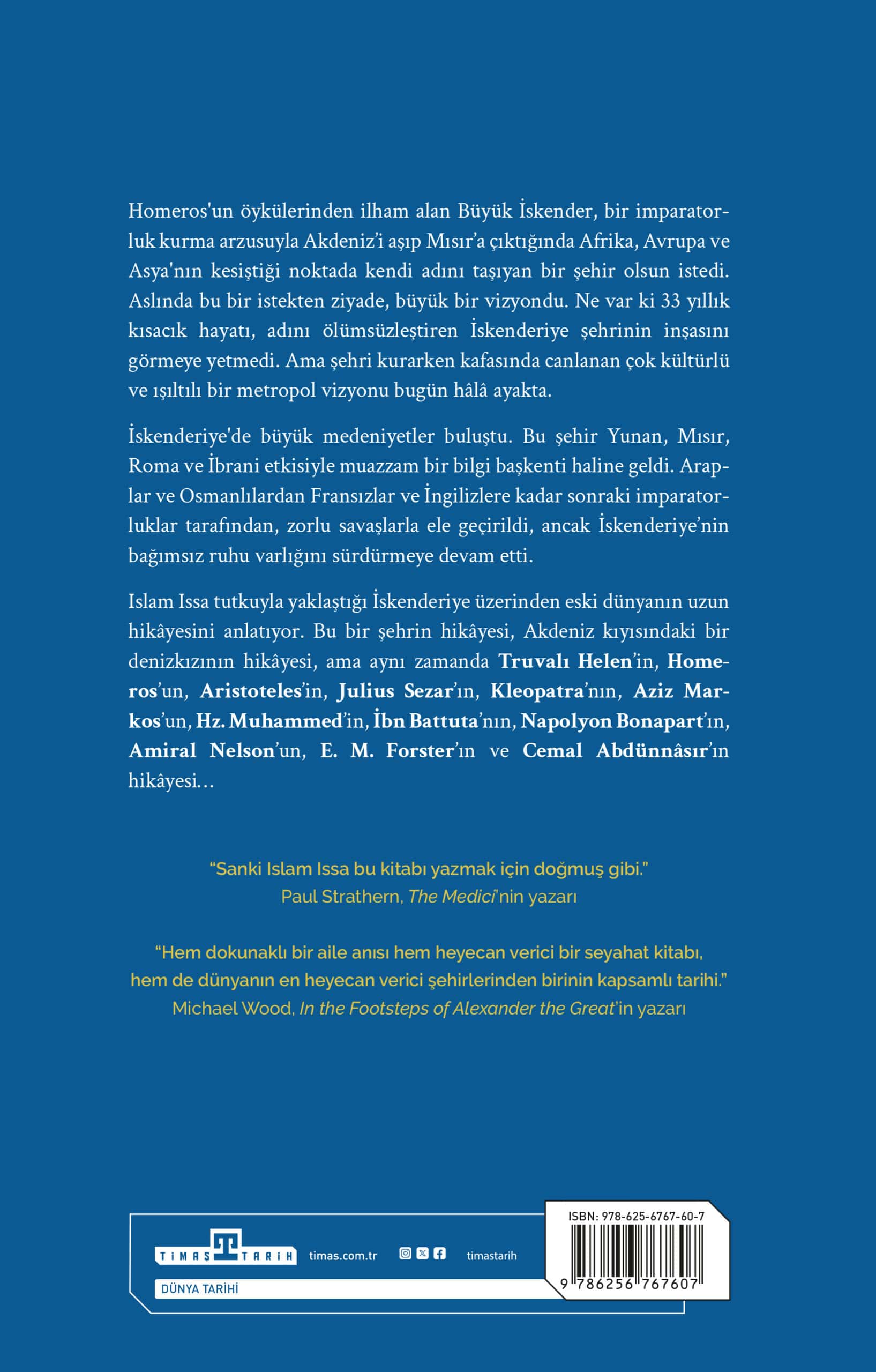 Homeros'un öykülerinden ilham alan Büyük İskender, bir imparatorluk kurma arzusuyla Akdeniz’i aşıp Mısır’a çıktığında Afrika, Avrupa ve Asya'nın kesiştiği noktada kendi adını taşıyan bir şehir olsun istedi. Aslında bu bir istekten ziyade, büyük bir vizyondu. Ne var ki 33 yıllık kısacık hayatı, adını ölümsüzleştiren İskenderiye şehrinin inşasını görmeye yetmedi. Ama şehri kurarken kafasında canlanan çok kültürlü ve ışıltılı bir metropol vizyonu bugün hâlâ ayakta. İskenderiye'de büyük medeniyetler buluştu. Bu şehir Yunan, Mısır, Roma ve İbrani etkisiyle muazzam bir bilgi başkenti haline geldi. Araplar ve Osmanlılardan Fransızlar ve İngilizlere kadar sonraki imparatorluklar tarafından, zorlu savaşlarla ele geçirildi, ancak İskenderiye’nin bağımsız ruhu varlığını sürdürmeye devam etti. Islam Issa tutkuyla yaklaştığı İskenderiye üzerinden eski dünyanın uzun hikâyesini anlatıyor. Bu bir şehrin hikâyesi, Akdeniz kıyısındaki bir denizkızının hikâyesi, ama aynı zamanda Truvalı Helen’in, Homeros’un, Aristoteles’in, Julius Sezar’ın, Kleopatra’nın, Aziz Markos’un, Hz. Muhammed’in, İbn Battuta’nın, Napolyon Bonapart’ın, Amiral Nelson’un, E. M. Forster’ın ve Cemal Abdünnâsır’ın hikâyesi… “Sanki Islam Issa bu kitabı yazmak için doğmuş gibi.” Paul Strathern, The Medici’nin yazarı “Hem dokunaklı bir aile anısı hem heyecan verici bir seyahat kitabı, hem de dünyanın en heyecan verici şehirlerinden birinin kapsamlı tarihi.” Michael Wood, In the Footsteps of Alexander the Great’in yazarı