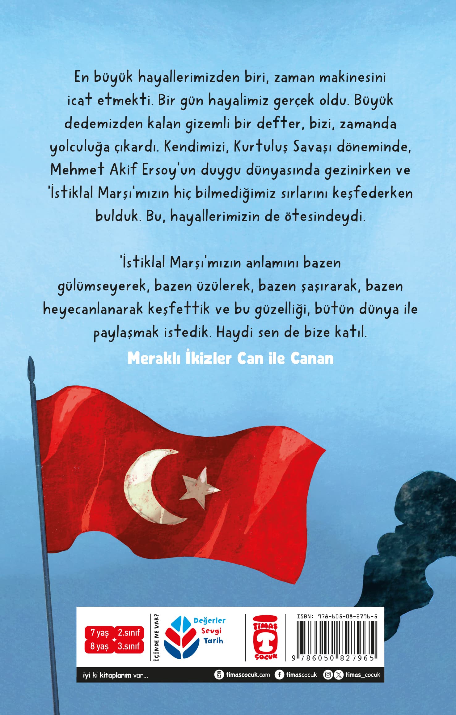 Timaş Çocuk kitaplarının sevimli karakterleri Can ile Canan, sevgi dolu kitaplarıyla çocuklarla buluşmaya devam ediyor. ‘İstiklal Marşı’mız Nasıl Yazıldı?, Can ile Canan'ın çıktığı zaman yolculuğu eşliğinde Mehmet Akif Ersoy'un marşı yazma öncesi yaşadığı acıları, yaptığı kahramanlıkları, halkı bilinçlendirmek için yaptığı konuşmaları ince ince anlattıktan sonra İstiklal Marşı'nı kıta kıta çocukların çok seveceği bir dille şerh ediyor, açıklıyor. Hem çok hızlı okunan hem duygusal olarak etkileyen hem de Can ile Canan’ın maceraları eşliğinde ilerleyen bu kitabı çocuklar çok seviyor ve kitabı okurken Mehmet Akif Ersoy’un İstiklal Marşı’nı nasıl bir duygu hâliyle yaşadığına, geçmişe maceralı bir yolculuk yaparak tanıklık ediyor. Danışmanlığını Fatih Bayhan ve Mehmet Akif Ersoy’un torunu Selma Argon’un yaptığı, Nefise Atçakarlar’ın yazıp, Eda Ertekin’in resimlediği ve kahraman ordumuza ithaf edilen ve tamamı renkli resimli olan bu kitap, ilkokul 2, 3 ve 4. sınıf öğrencilerine hitap ediyor.