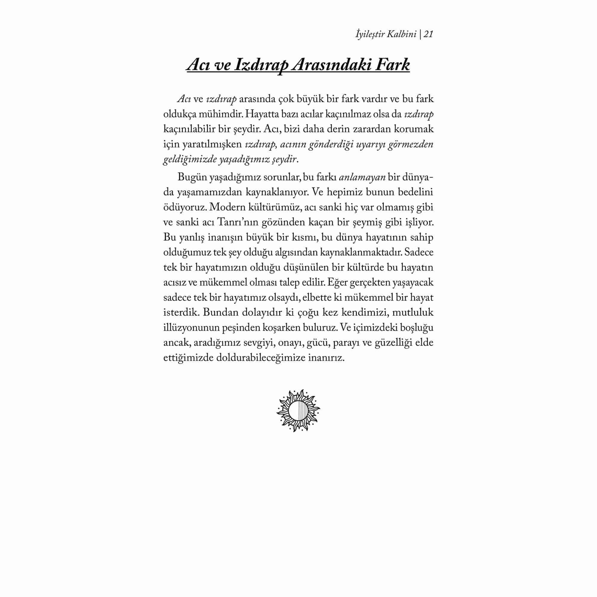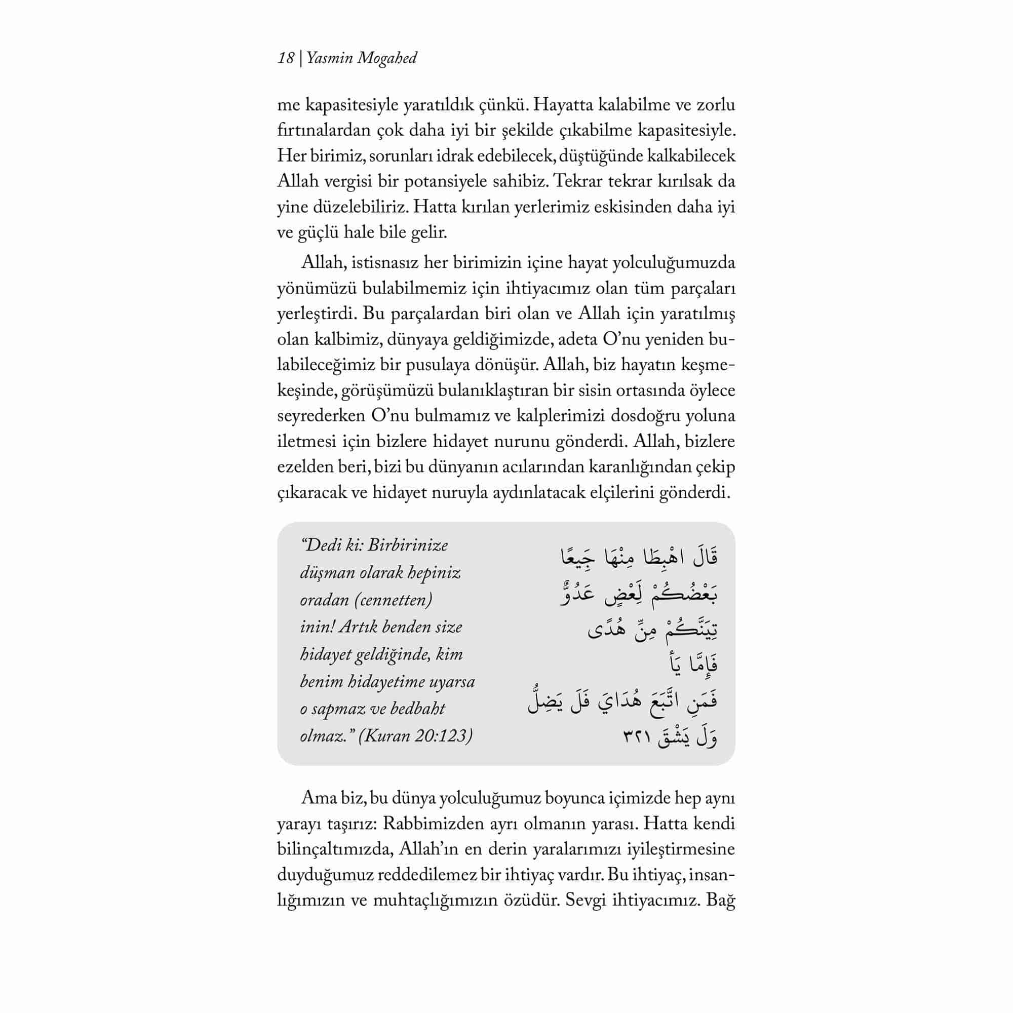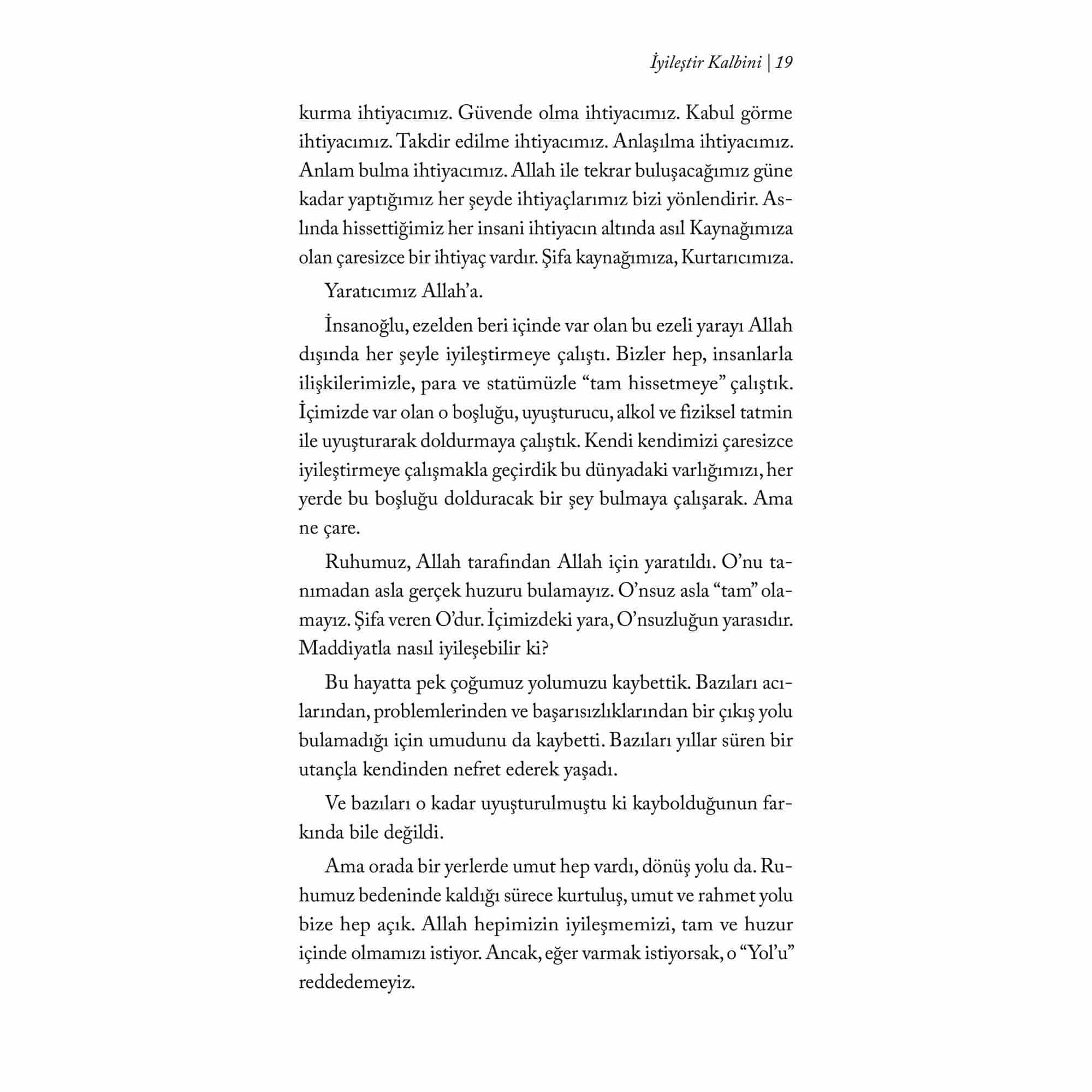 Kalbimiz niçin bu kadar çabuk kırılıyor? Duyduğumuz acılar aslında neyin işareti ve nasıl yorumlanmalı? Kalbimizin hassas ve savunmasız yaratılmış olması arınma yolculuğumuzun bir parçası olabilir mi? Her an mutlu olmak gerçekçi bir beklenti değilse acı ve ıstıraba bakışımız nasıl olduğunda içimizdeki boşluk hissi anlamla dolar? Dünya çapında konferansları milyonlar tarafından takip edilen Yasmin Mogahed, İyileştir Kalbini adlı yeni kitabında bizi kalbimizle yüzleştirip ruhumuza doğru bir yolculuğa çıkarıyor ve içimizde hissettiğimiz boşluğun nedenleri üzerinde duruyor. İnsanı üzen, boşluğa düşüren asıl nedenin, hayatımızın ve kalbimizin merkezine Allah’ın sevgisini yerleştirmememiz olduğunu anlatan Mogahed, önceliklerimizi yaradılış gerçeğimize uygun hale getirdiğimizde açılacak yolları, içinden geçtiğimiz imtihanlardan selim bir kalple çıkabilmemiz için hatırda tutmamız gerekenleri paylaşıyor. Duygusal ve ruhsal iyilik için bir rehber niteliğinde olan İyileştir Kalbini, içimizdeki boşluk hissini dolduracak kaynakları, insanlık için apaçık bir rehber olan Kur’an ayetlerinden ve Peygamberimizin hayatından örneklerle sunuyor.
