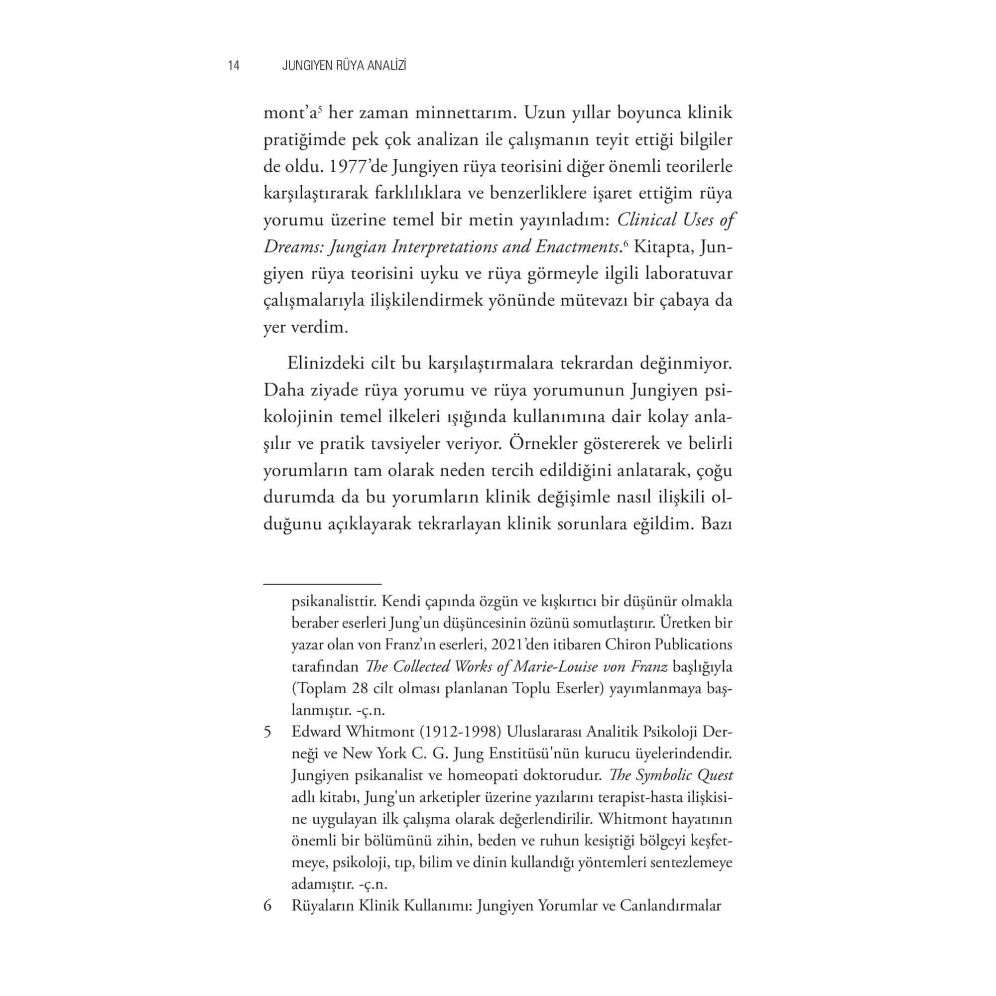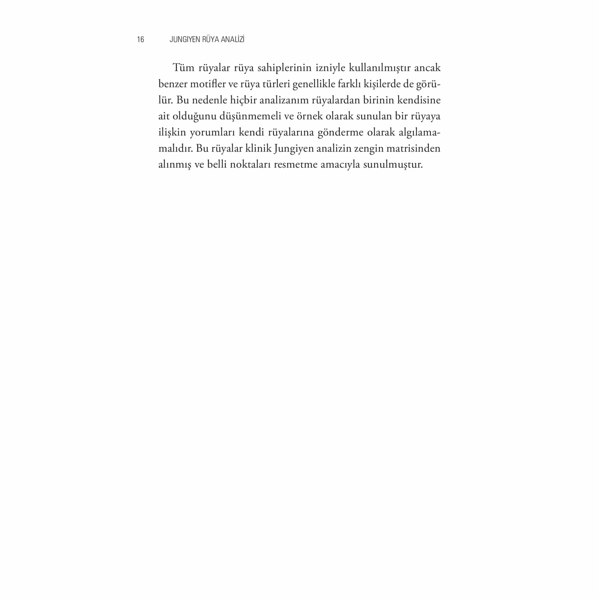 Rüya görmek insanlığın evrensel bir deneyimidir. Fenomenolojik olarak, uyku esnasında zihinde gerçekleştiğini sonradan kabul ettiğimiz bir deneyimdir ama bunlar rüyada bize uyanıkken yaşadıklarımız kadar gerçek görünür. Yani her şey, rüya âlemi olduğunu ancak sonradan kabul ettiğimiz ve ‘gerçek’ olduğu izlenimini veren bir dünyada gerçekleşmiştir. Rüyaların, rüya görenin kişisel psikolojisi, tavırları ve davranış örüntüleriyle yakından ilişkili olduğuna dair modern inanç, bilinçdışının rüyalarda can kazandığını gösteren İsviçreli psikiyatr Carl Gustav Jung'un öncü nitelikteki çalışmalarına çok şey borçludur. Bu kitap Jung'un Analitik Psikolojisinin temel ilkeleri ışığında rüyaları anlamaya yardımcı olacak kapsamlı ve pratik bir rehberdir. Kitapta Jung'un psişe modeli, pek çok klinik rüya örneği verilerek ve bunların bağlam içinde nasıl yorumlanabileceği gösterilerek tanımlanmış ve anlatılmıştır. Jungiyen analist James A. Hall’un yaygın ve tekrarlayan rüya motiflerini, travmatik rüyaları, rüyaların telafi edici ve amaçlı işlevlerini, hastalık veya fiziksel değişimin habercisi olarak rüyaları ve rüyaların rüya görenin yaşam evresi ve bireyleşme süreciyle ilişkisini özenle açıkladığı Jungiyen Rüya Analizi, Özgür Ertana’nın nitelikli çevirisi ve son derece özverili bir çabayla dipnotlar ve eklerle metni zenginleştirmesiyle Türkçe yazında bu sahada önemli bir kaynak haline geldi. Rüyaları anlamak, aynı hataların farklı şekillerde yinelendiği örüntüleri keşfetmeyi mümkün kılar ve tekrar eden bu örüntüleri egonun gözleri önüne serer. Bu çatışmalar berrak bir şekilde görüldüğünde sorumlu bir tavır alma fırsatı doğar. Rüya psişenin tamamının hizmetindedir; ancak bu esas görevden sonra, ikincil bir görev olarak, herhangi bir ego tavrına veya bakış açısına karşı çıkmakla ilgilenir. Uyanıklık hali egosu rüyaların neyi başarmaya çalıştığına bakarak kendi konumunu değerlendirebilir ve arzu ederse daha derin süreçlere katılabilir.