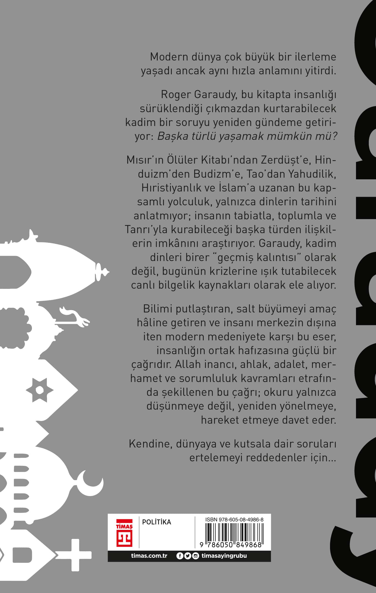 Modern dünya çok büyük bir ilerleme yaşadı ancak aynı hızla anlamını yitirdi. Roger Garaudy, bu kitapta insanlığı sürüklendiği çıkmazdan kurtarabilecek kadim bir soruyu yeniden gündeme getiriyor: Başka türlü yaşamak mümkün mü? Mısır’ın Ölüler Kitabı’ndan Zerdüşt’e, Hinduizm’den Budizm’e, Taoizm’den Yahudilik, Hıristiyanlık ve İslam’a uzanan bu kapsamlı yolculuk, yalnızca dinlerin tarihini anlatmıyor; insanın tabiatla, toplumla ve Allah’la kurabileceği başka türden ilişkilerin imkânını araştırıyor. Garaudy, kadim dinleri birer “geçmiş kalıntısı” olarak değil, bugünün krizlerine ışık tutabilecek canlı bilgelik kaynakları olarak ele alıyor. Bilimi putlaştıran, salt büyümeyi amaç hâline getiren ve insanı merkezin dışına iten modern medeniyete karşı bu eser, insanlığın ortak hafızasına güçlü bir çağrıdır. Allah inancı, ahlak, adalet, merhamet ve sorumluluk kavramları etrafında şekillenen bu çağrı; okuru yalnızca düşünmeye değil, yeniden yönelmeye, hareket etmeye davet eder. Kendine, dünyaya ve kutsala dair soruları ertelemeyi reddedenler için…