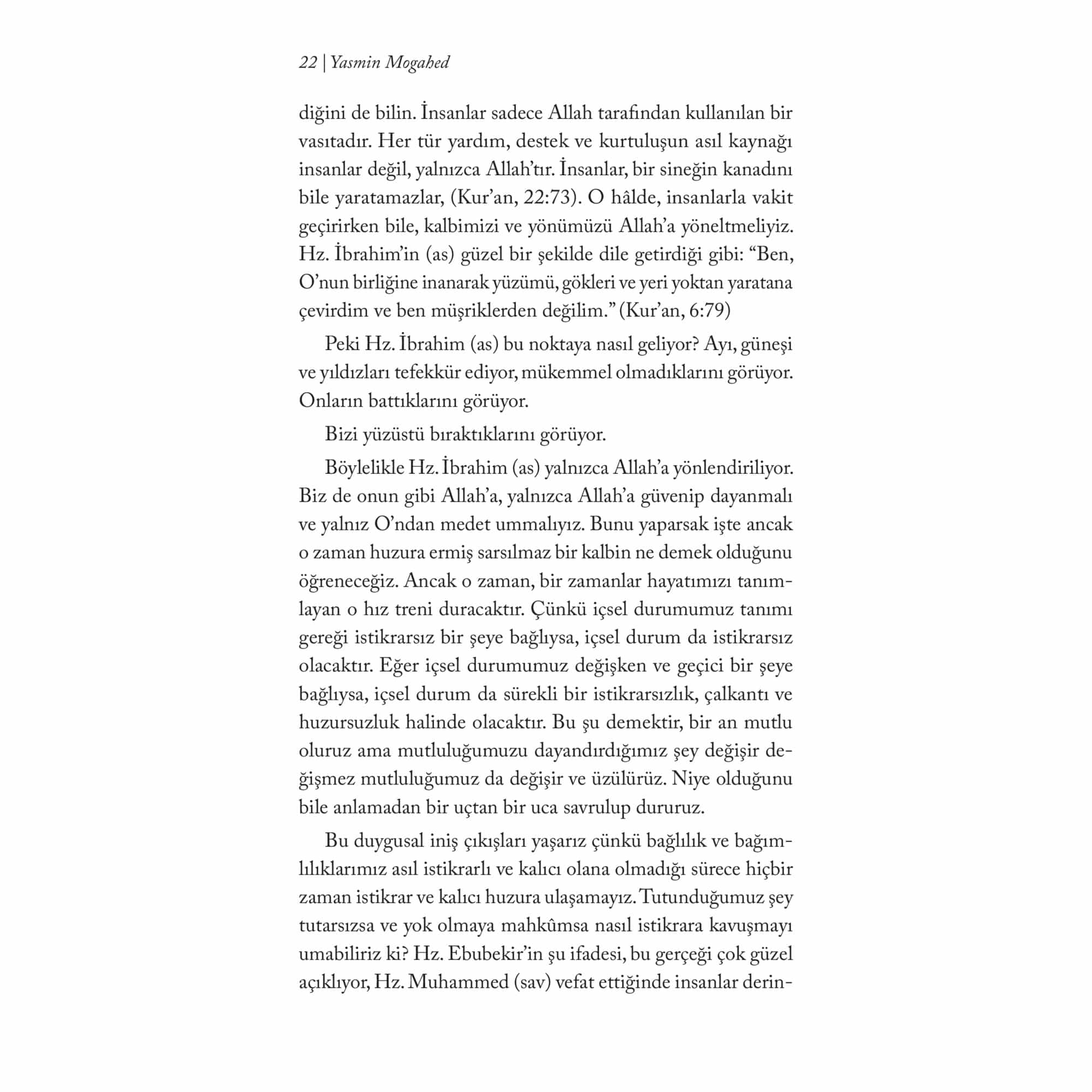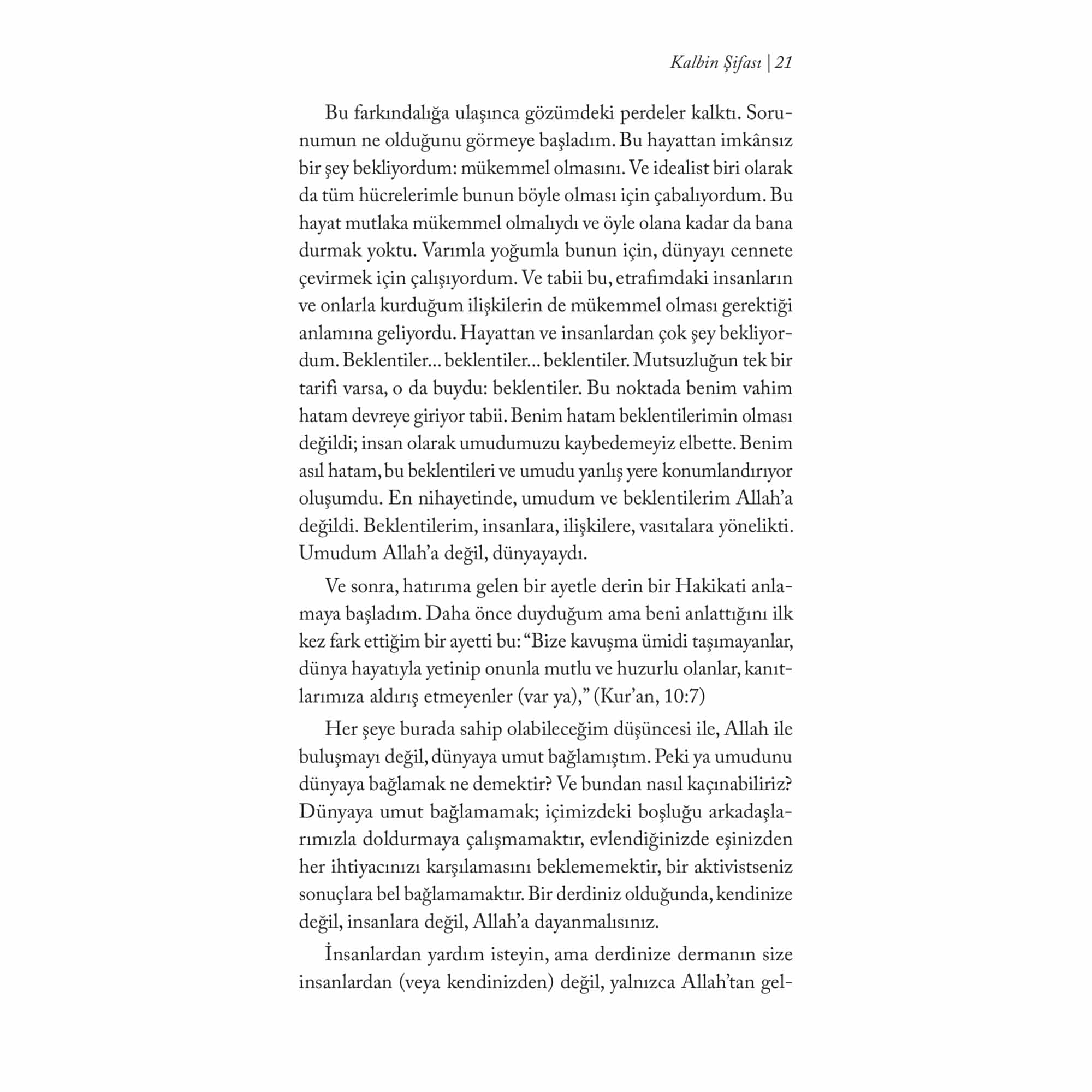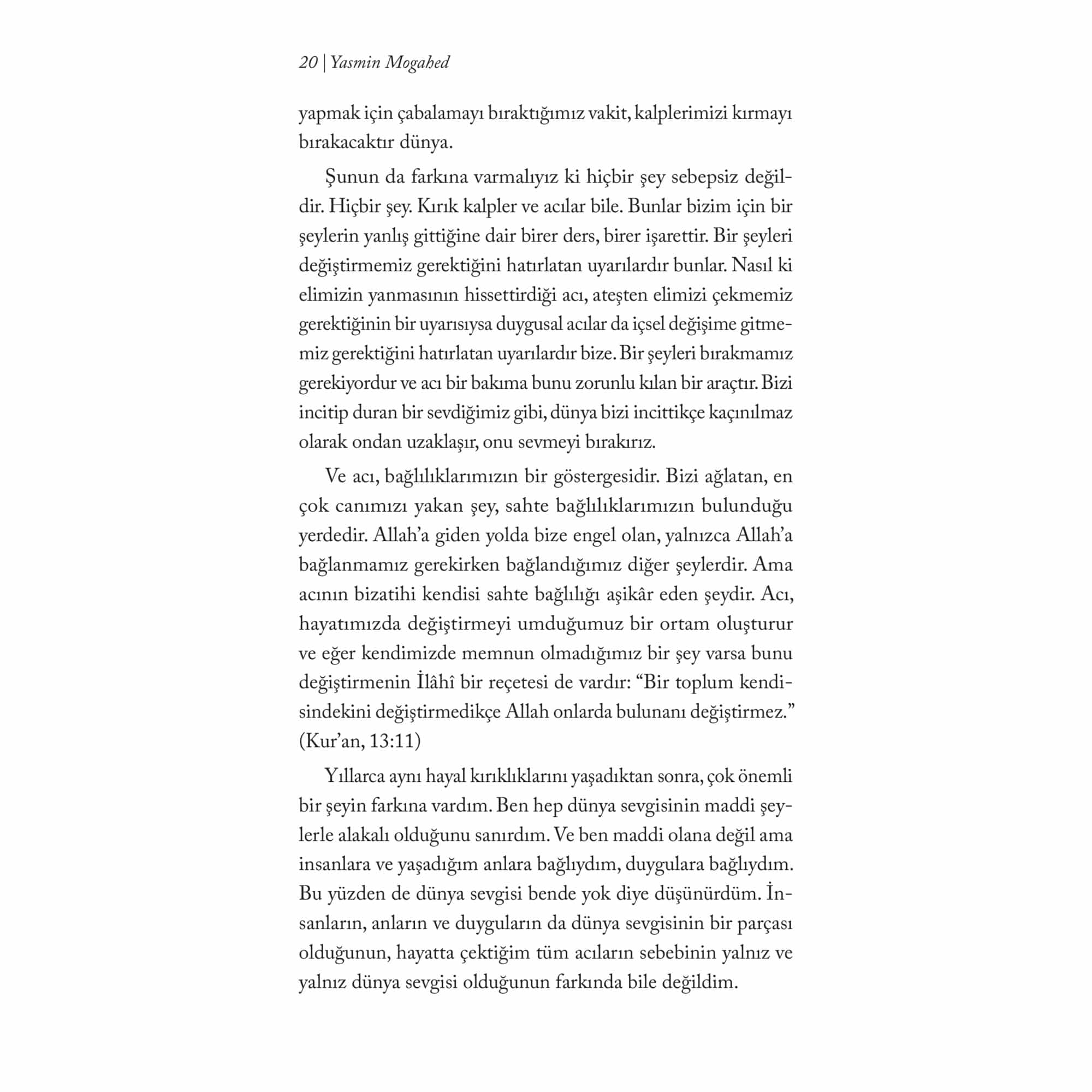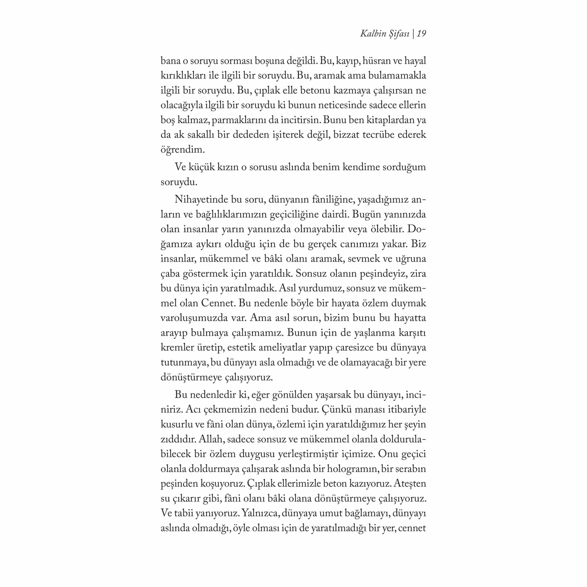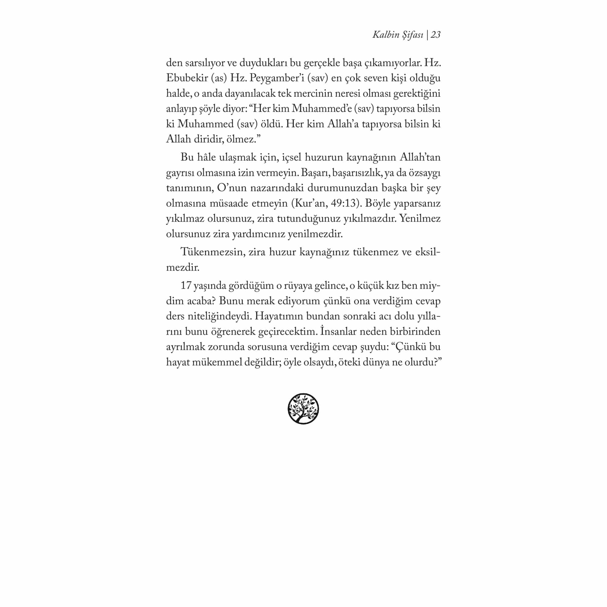 Dünyaca ünlü bir davetçi ve başta gençler olmak üzere çok geniş bir kitleye manevi ve ruhsal gelişimi İslam perspektifinden anlatan bir konuşmacı olan Yasmin Mogahed Kalbin Şifası’nda hayatın zincirlerinden kurtulmaya dair içgörüler kazandıran bir bakış açısı sunuyor. Kalbimizi bağladığımız “şeyler”, insanın maneviyatını sabote eder boyuta geçen aşk duygusu, hayatın getirdiği imtihanlar, Yaratıcımızla kurduğumuz ilişki, kadınlara kültürel olarak yüklenen ekstra zorluklar gibi temalar üzerinden bir farkındalık oluşturuyor. Kalbin Şifası yalnızca bir kişisel gelişim kitabı değil, aynı zamanda kalbin yolculuğuna dair bir rehber. Hayatı bir okyanusa benzeten Mogahed, kalbinizi bu okyanusun derinliklerine batmaktan nasıl koruyacağınızı ve batarsanız ne yapmanız gerektiğini anlatıyor. Kurtuluş, umut ve yenilenmeden bahsediyor. Her kalp iyileşebilir ve yaşadığımız her an bizi, hayatımızı değiştirecek o dönüşe yaklaştırmak için yaratılmıştır. Kalbin Şifası işte o her şeyin durduğu ve bambaşka göründüğü ânı, kendi uyanışımızı bulma yolunu gösteriyor bize. İşte o zaman, daha iyi, daha doğru, daha hür bir insan olduğumuz hâlimize geri dönebiliriz. “Kalbin Şifası, İslam’ın manevi mesajını yansıtıyor: sade, derin ve yüceltici. Yasmin Mogahed kişisel ve samimi yolculuğu boyunca okurunu çok özel bir şekilde beraberinde götürüyor: kalpten kalbe hitap ediyor, aklı tatmin ediyor. Kitap, elde ettiği başarıyı sonuna kadar hak ediyor. Bu kitap her birimizin Bir Olan’a ve kalbimize yaklaşmasına yardımcı oluyor. Kalbin Şifası, madde ve mânânın sevgi ve huzur yoluyla uzlaşısını anlatıyor. Hepimizin buna ihtiyacı var.” Tarık Ramazan