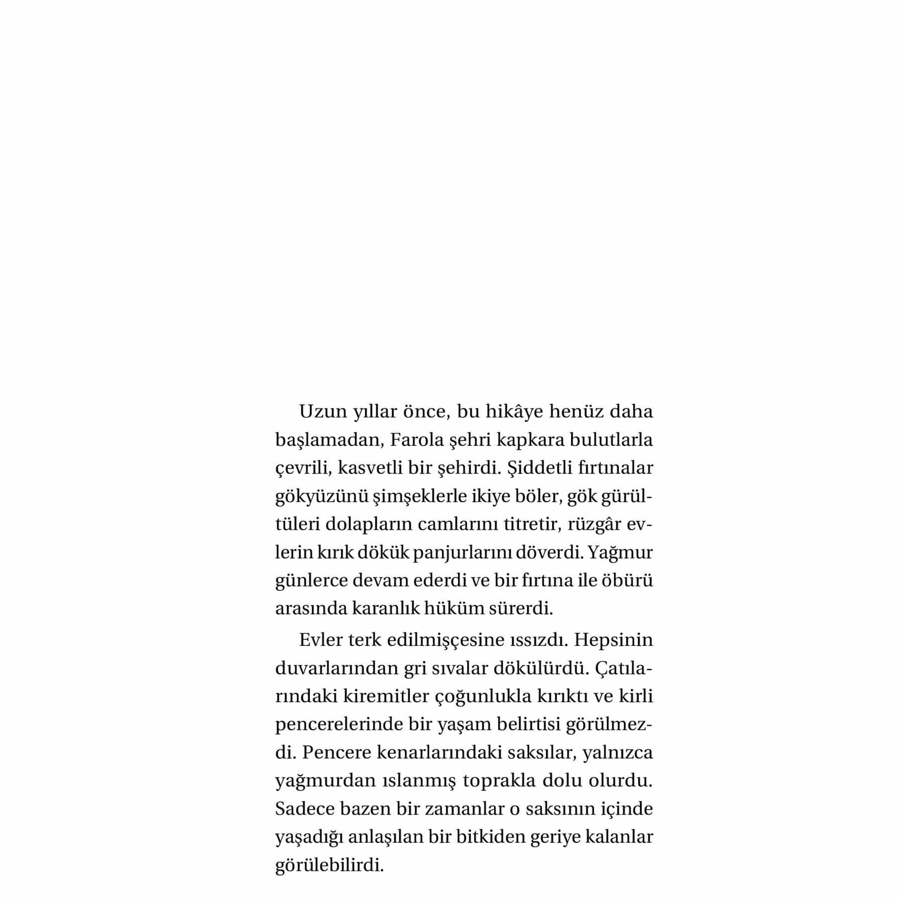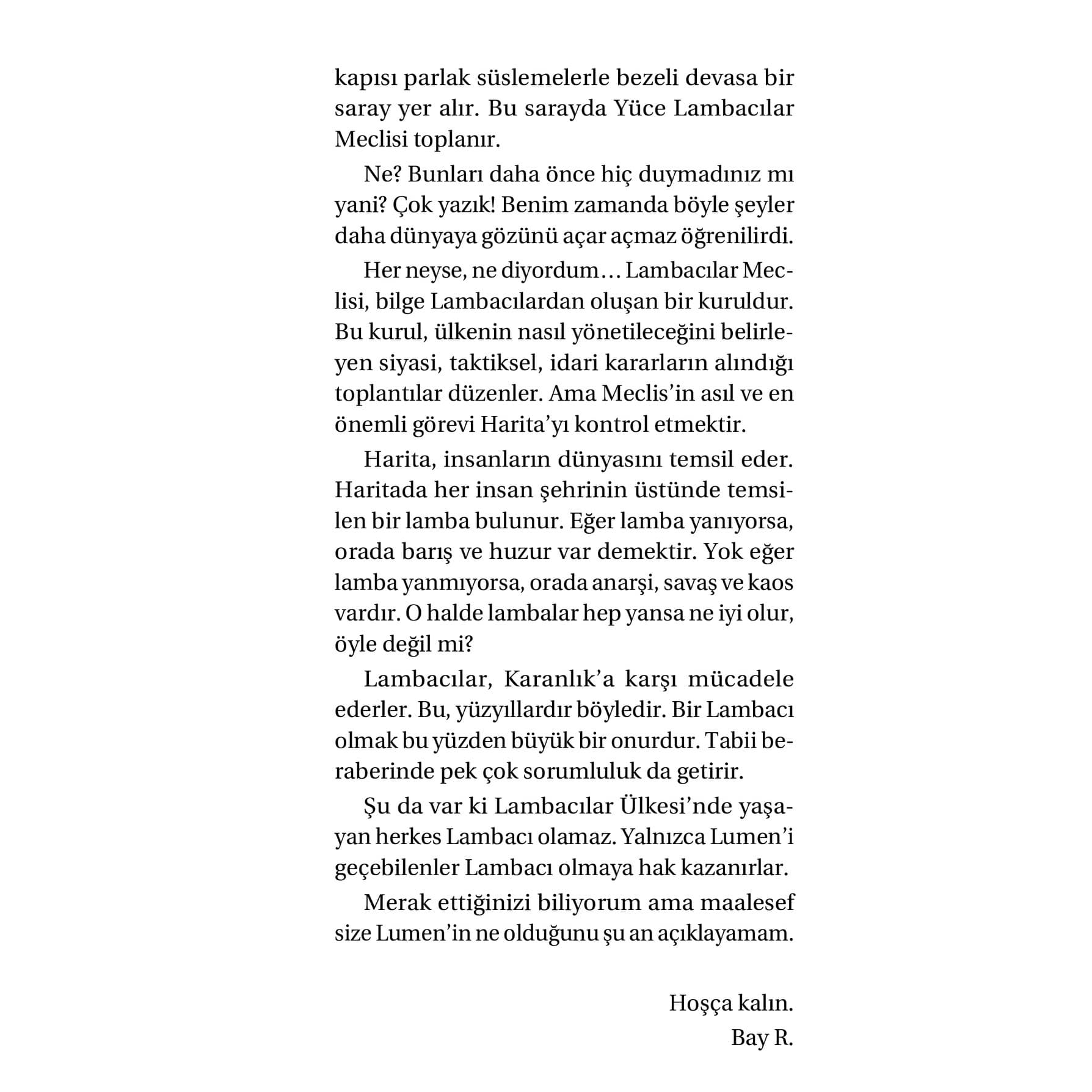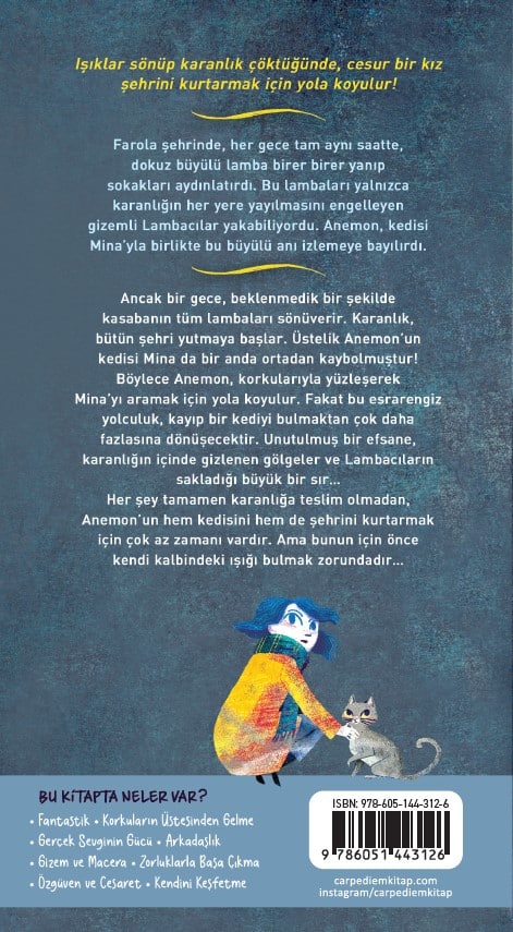 Farola şehrinde, her gece tam aynı saatte, dokuz büyülü lamba birer birer yanıp sokakları aydınlatırdı. Bu lambaları yalnızca karanlığın her yere yayılmasını engelleyen gizemli Lambacılar yakabiliyordu. Anemon, kedisi Mina’yla birlikte bu büyülü anı izlemeye bayılırdı. *** Ancak bir gece, beklenmedik bir şekilde kasabanın tüm lambaları sönüverir. Karanlık, bütün şehri yutmaya başlar. Üstelik Anemon’un kedisi Mina da bir anda ortadan kaybolmuştur! Böylece Anemon, korkularıyla yüzleşerek Mina’yı aramak için yola koyulur. Fakat bu esrarengiz yolculuk, kayıp bir kediyi bulmaktan çok daha fazlasına dönüşecektir. Unutulmuş bir efsane, karanlığın içinde gizlenen gölgeler ve Lambacıların sakladığı büyük bir sır… Her şey tamamen karanlığa teslim olmadan, Anemon’un hem kedisini hem de şehrini kurtarmak için çok az zamanı vardır. Ama bunun için önce kendi kalbindeki ışığı bulmak zorundadır…