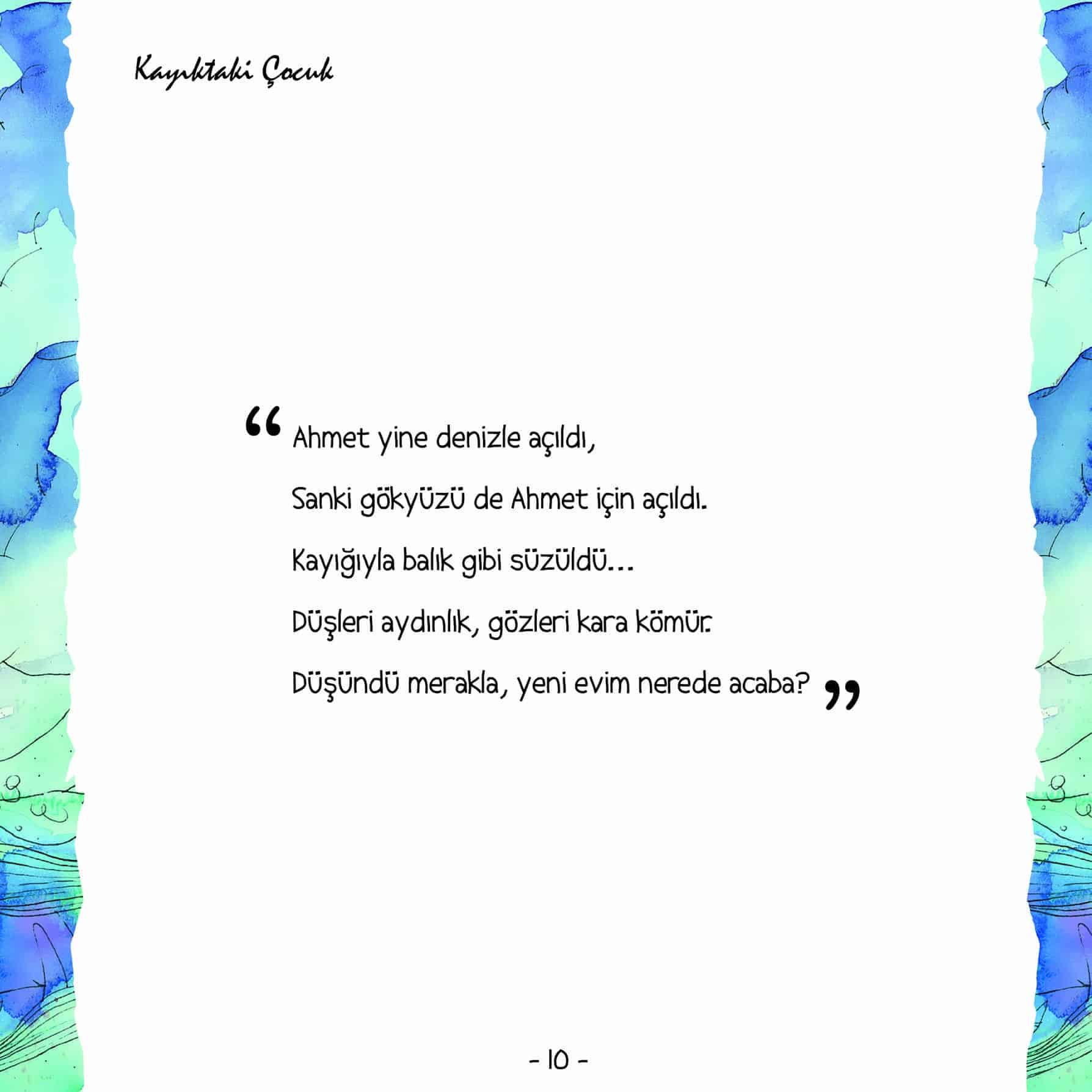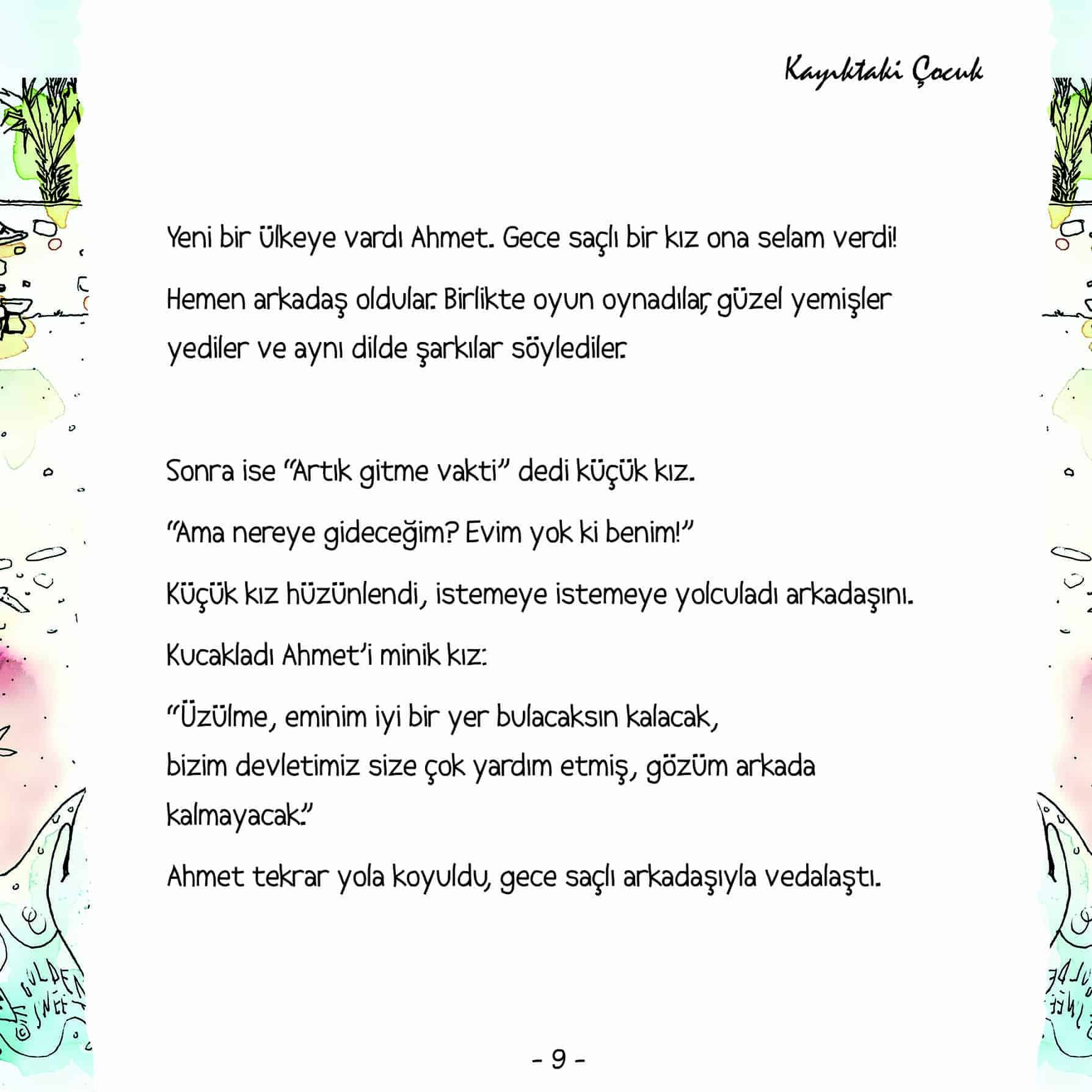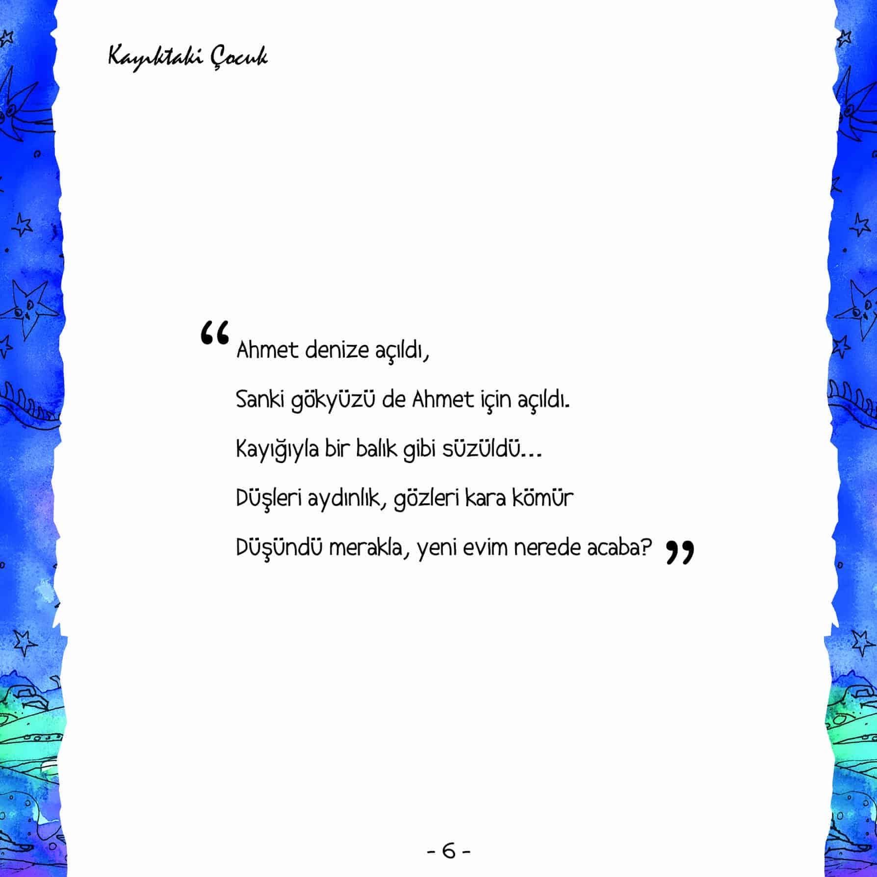 Kayıktaki Çocuk kitabı sizi Suriyeli küçük Ahmet’le birlikte okyanusları aşmaya çağırıyor. Ahmet küçük teknesiyle çıktığı yolculukta, çeşitli ülkelerde kendisi için sıcak bir yuva arıyor. Gittiği her ülkede başka çocuklarla tanışan Ahmet, gerek imkansızlıklar gerekse kanunlar nedeniyle arayışına devam etmek zorunda kalıyor. Fakat beklenmeyen bir misafir, Ahmet'i dünya çocuklarıyla buluşturuyor ve tüm dünya çocukları Ahmet'e yardım etmek için birlik oluyor.
