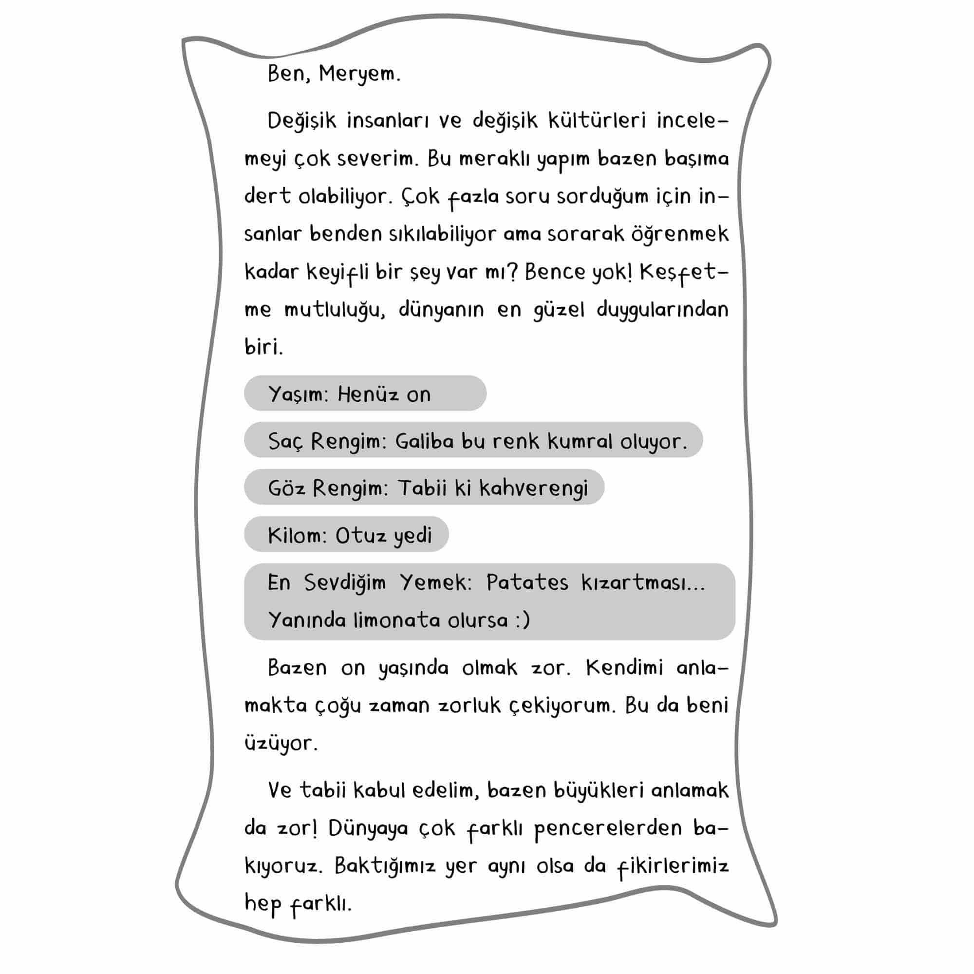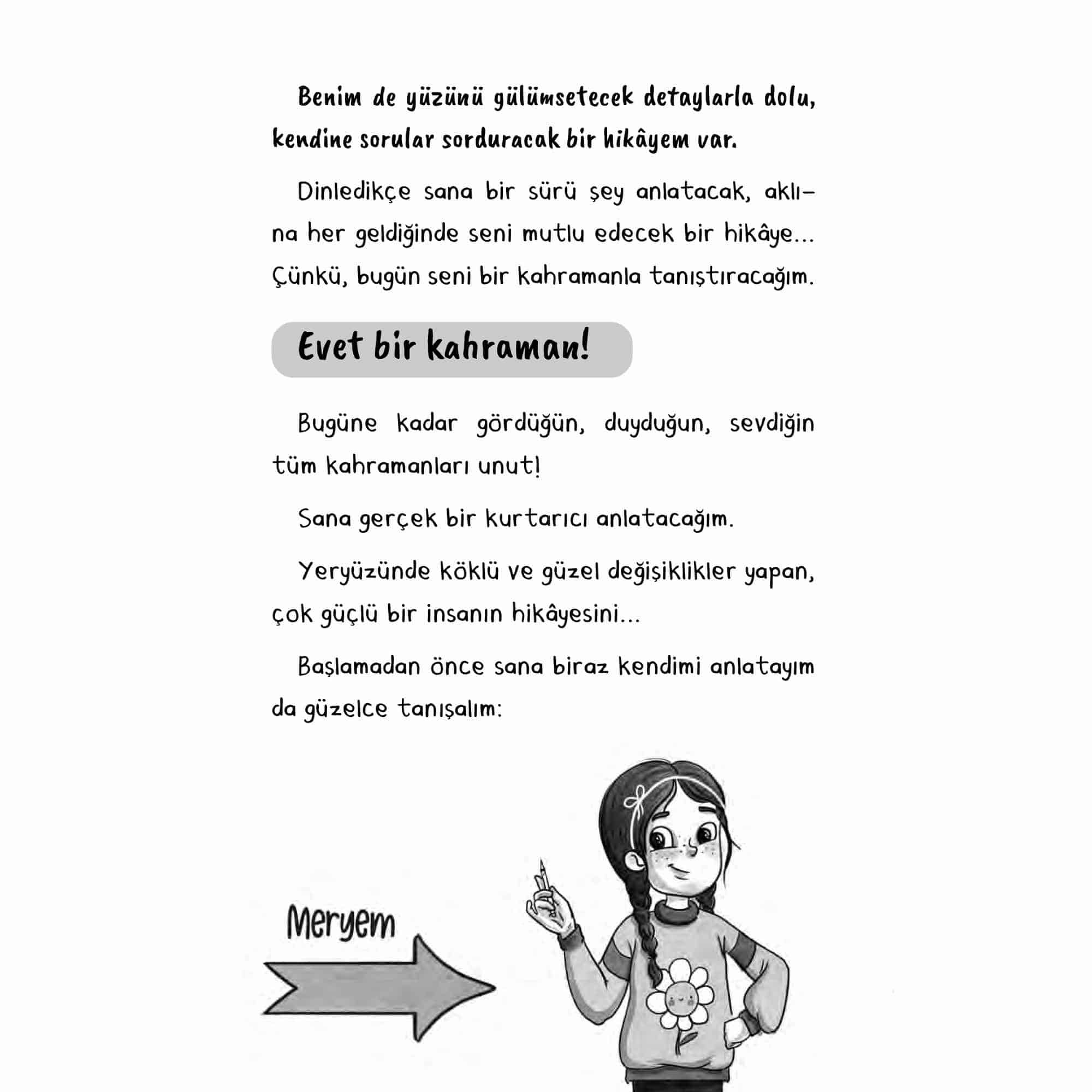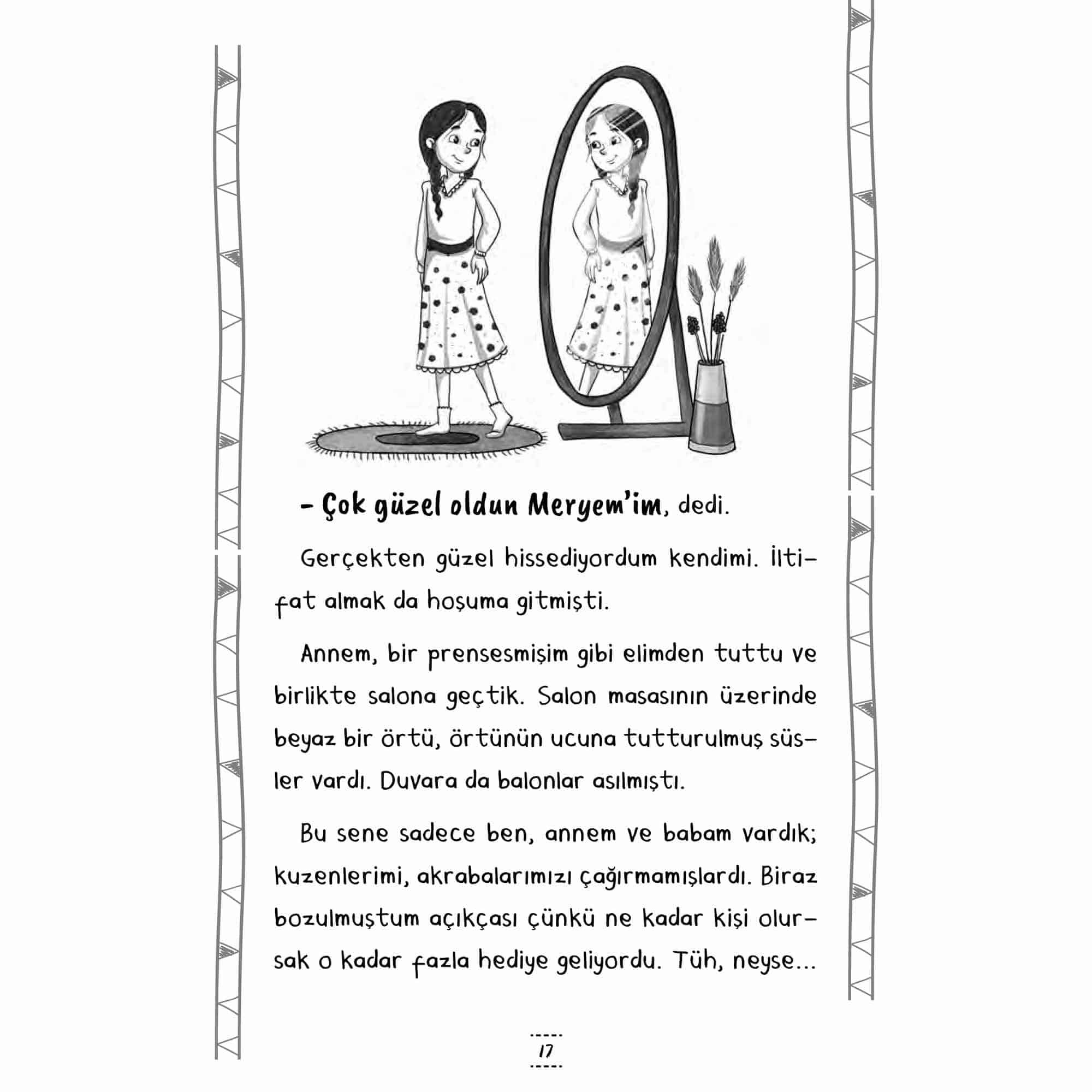 Artık zaman, bir önceki gün değildi. Meryem, huzurlu bir hayata giden yolun işaretlerini o gece bulmuştu. Komik, gizemli, meraklı ve biraz da heyecanlı Meryem’in hayatında bir sayfa kapanıyor bir sayfa açılıyordu. Elbette ki “pıt” diye değişmedi her şey. Öncesi ve sonrasıyla bir zincirin halkaları ardı ardına eklenerek gelişti. Şimdi biz, Meryem’in; Meryem rüyasında bulduğu “Peygamberimizin mesajının” peşinde…