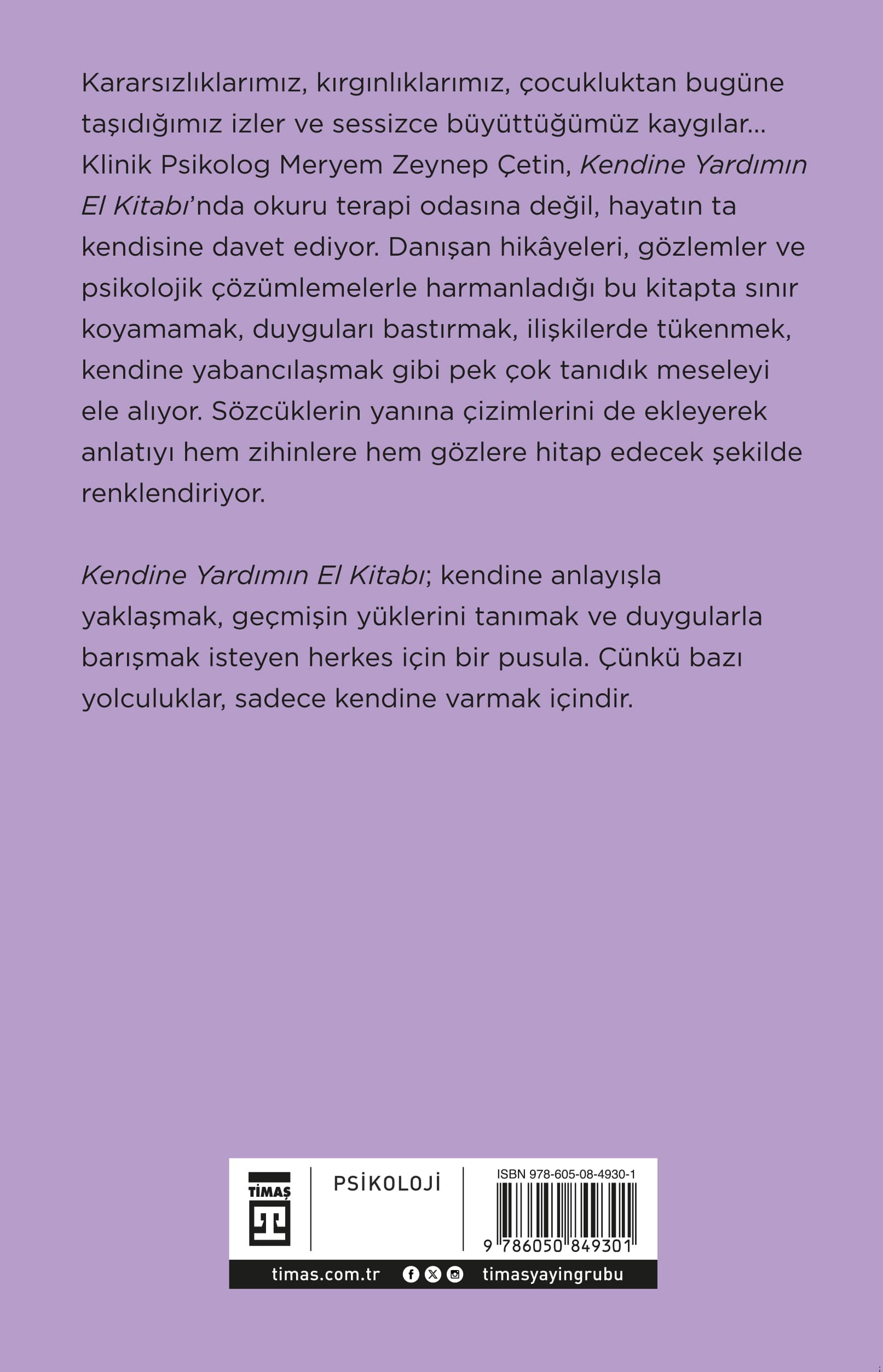 Kararsızlıklarımız, kırgınlıklarımız, çocukluktan bugüne taşıdığımız izler ve sessizce büyüttüğümüz kaygılar... Klinik Psikolog Meryem Zeynep Çetin, Kendine Yardımın El Kitabı’nda okuru terapi odasına değil, hayatın ta kendisine davet ediyor. Danışan hikâyeleri, gözlemler ve psikolojik çözümlemelerle harmanladığı bu kitapta sınır koyamamak, duyguları bastırmak, ilişkilerde tükenmek, kendine yabancılaşmak gibi pek çok tanıdık meseleyi ele alıyor. Sözcüklerin yanına çizimlerini de ekleyerek anlatıyı hem zihinlere hem gözlere hitap edecek şekilde renklendiriyor. Kendine Yardımın El Kitabı; kendine anlayışla yaklaşmak, geçmişin yüklerini tanımak ve duygularla barışmak isteyen herkes için bir pusula. Çünkü bazı yolculuklar, sadece kendine varmak içindir.
