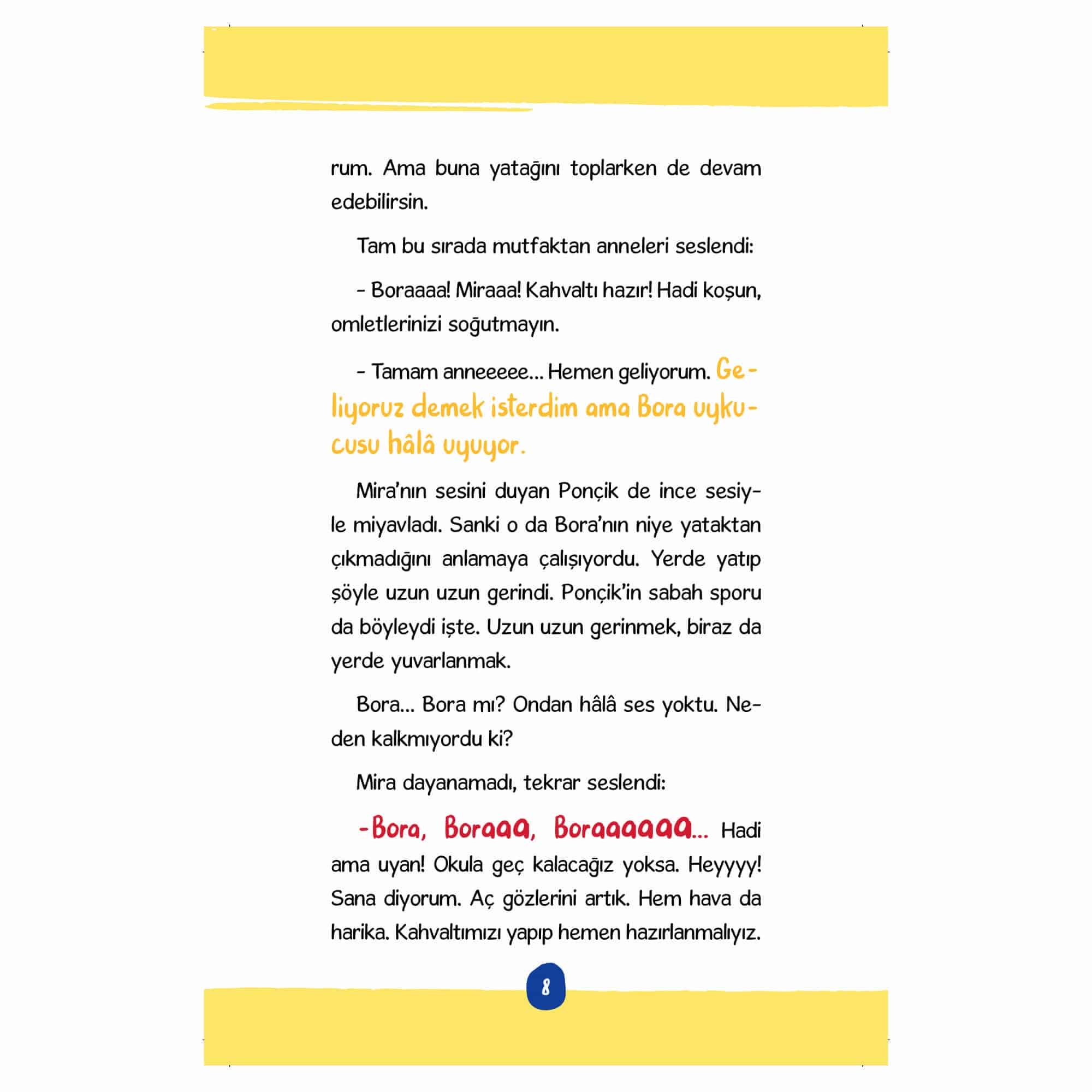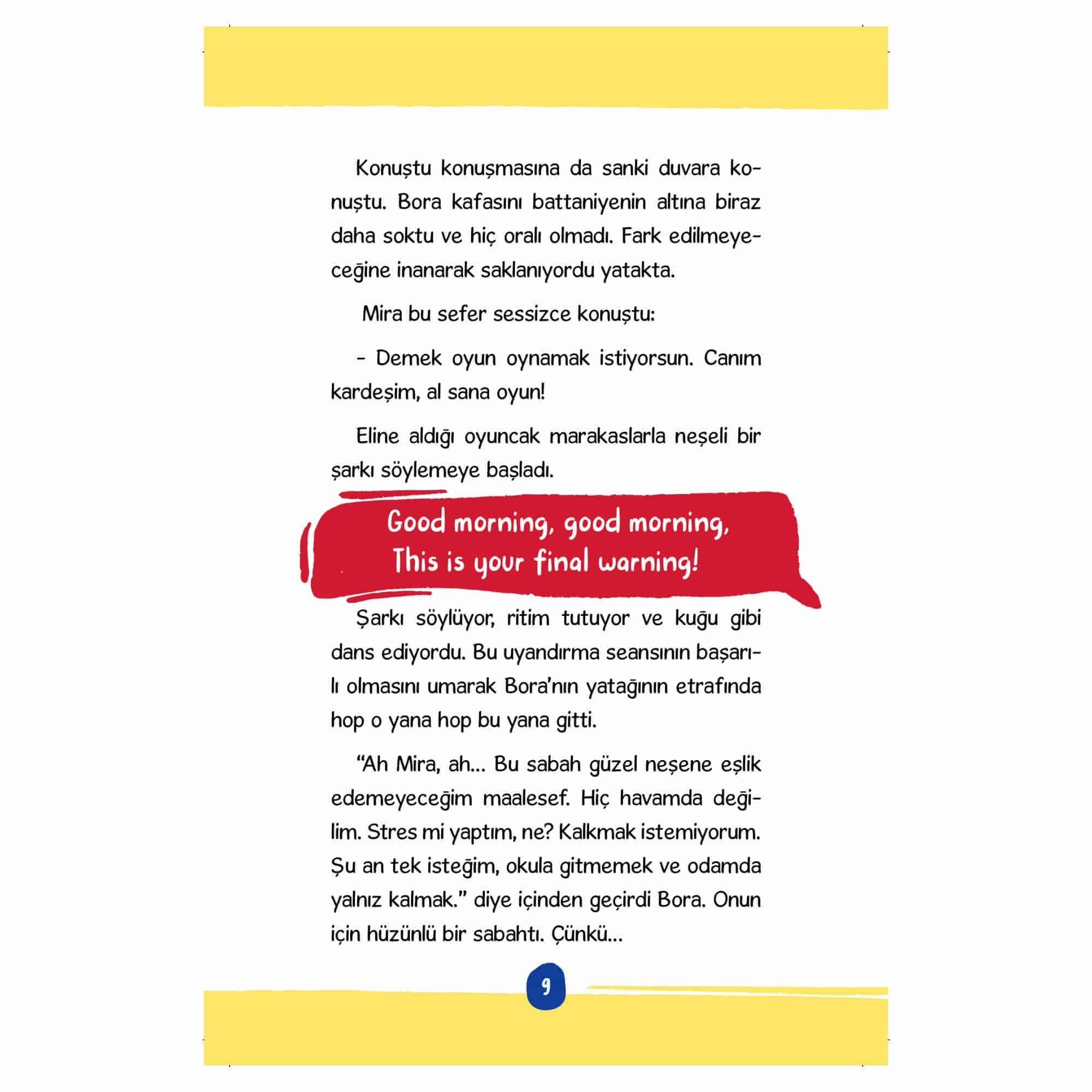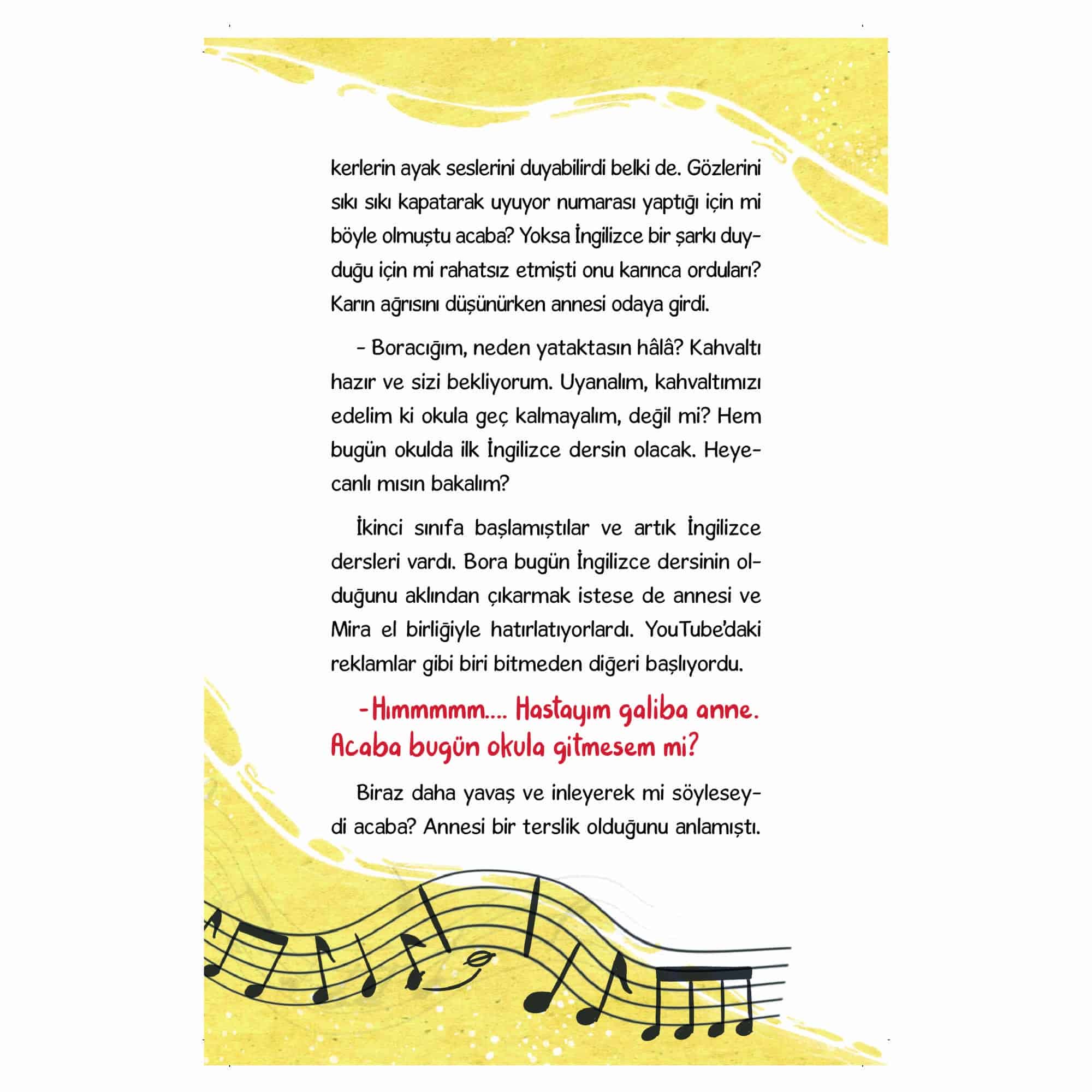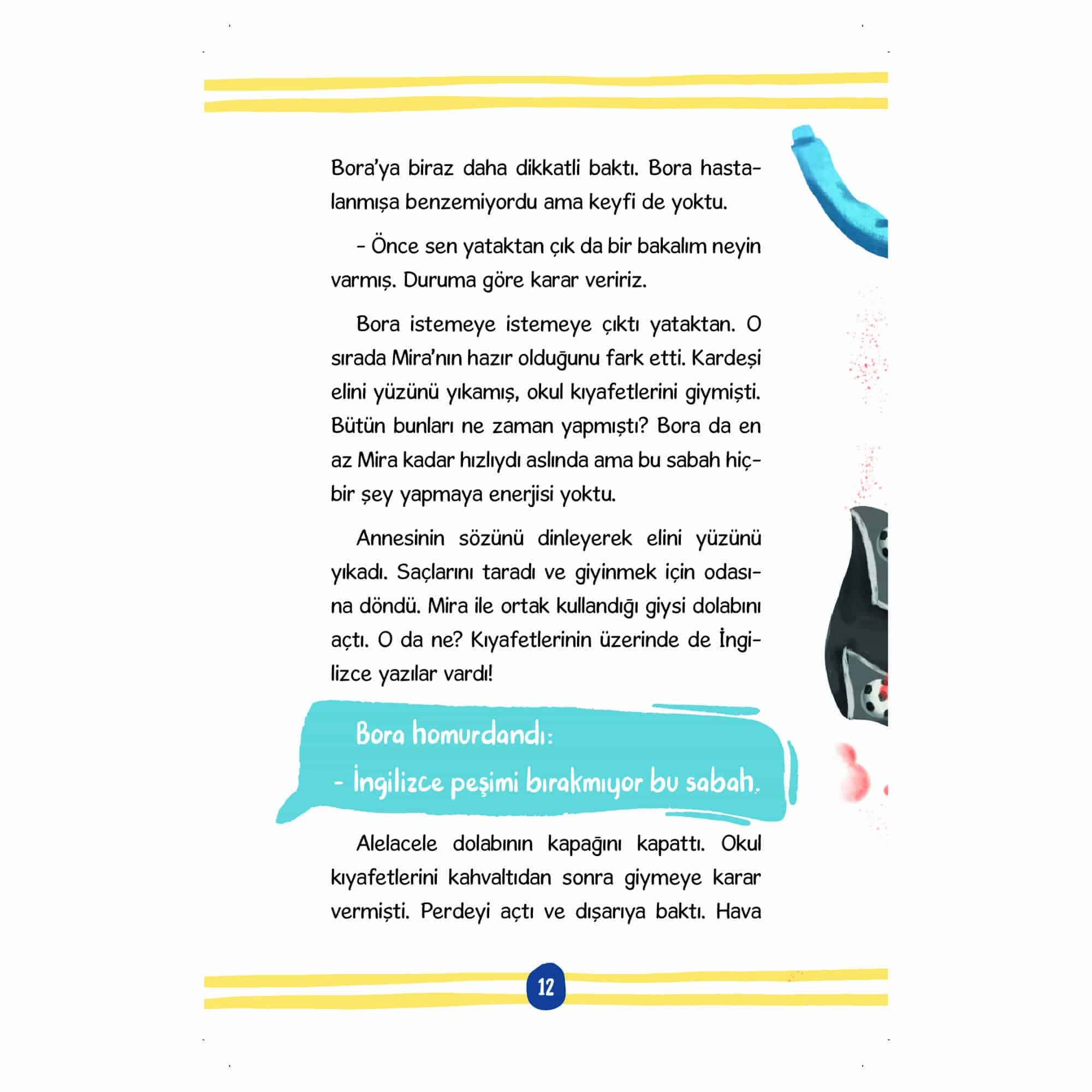 Uluslararası Ödüle Sahip Öğretmen Sinem Kolçak Arman'dan Eğlenceli Bir Macera!Bu hayattaki en büyük korkunuz nedir? Bora, ilk kez göreceği İngilizce dersinden çok korkuyor. Ya yeni öğretmeni Türkçe bilmiyorsa? Ya herkes öğretmeni anlarken kendisi anlayamazsa? Hii! Ya derste tuvaleti gelirse ve öğretmene söyleyemezse? Ne yapar o zaman? Aksi gibi İngilizce kelimeler de peşini bırakmıyor bir türlü! Masadaki tuzluğun üstünde, dolaptaki tişörtün yazısında, yoldaki tabelalarda… Her yerde ama her yerde takip ediyorlar Bora’yı. Kardeşi Mira ise Bora’nın aksine bu durumdan çok memnun.Bora, korkularını yenip İngilizceyi sevebilecek mi? Hadi, yeni bir dil öğrenmenin keyfine varalım!