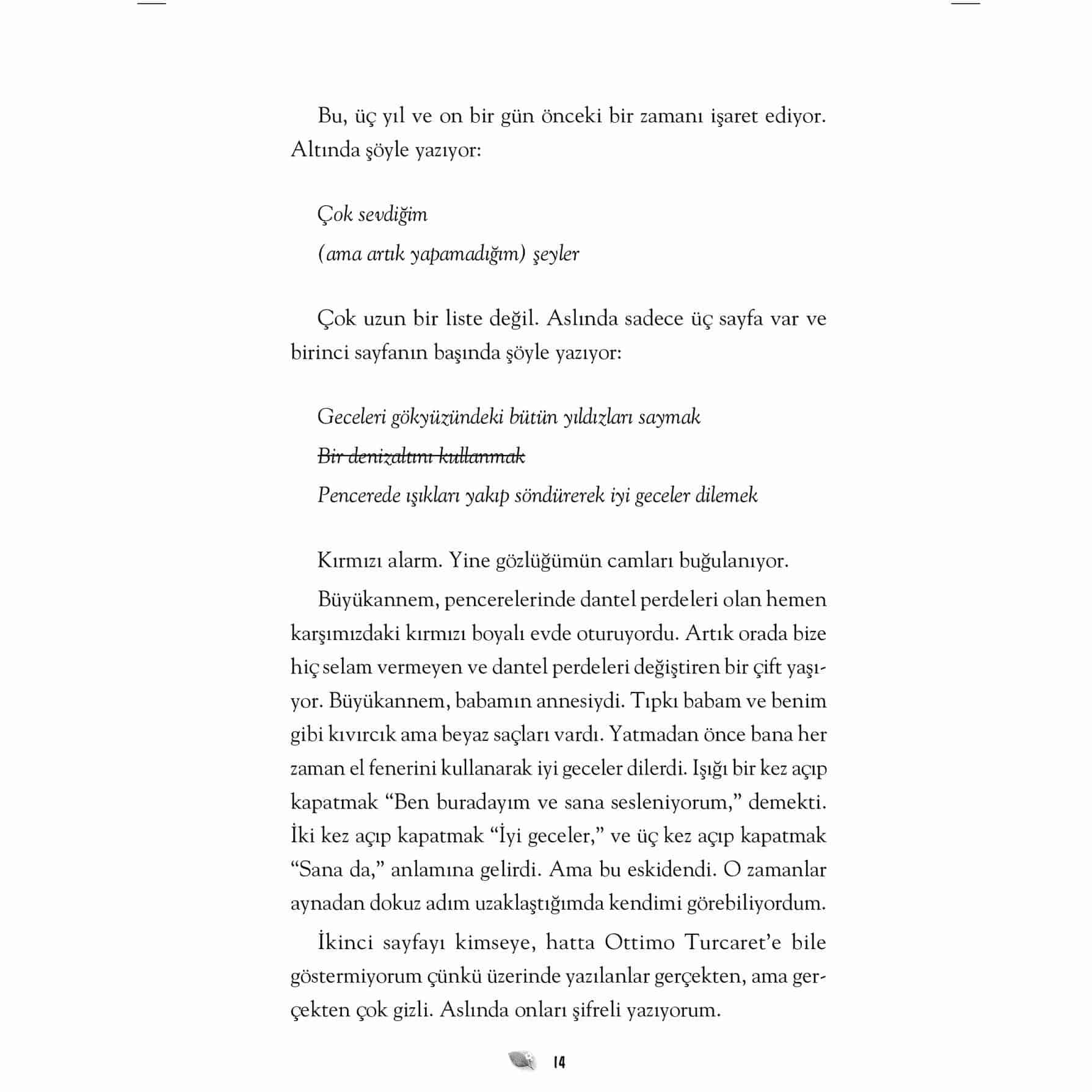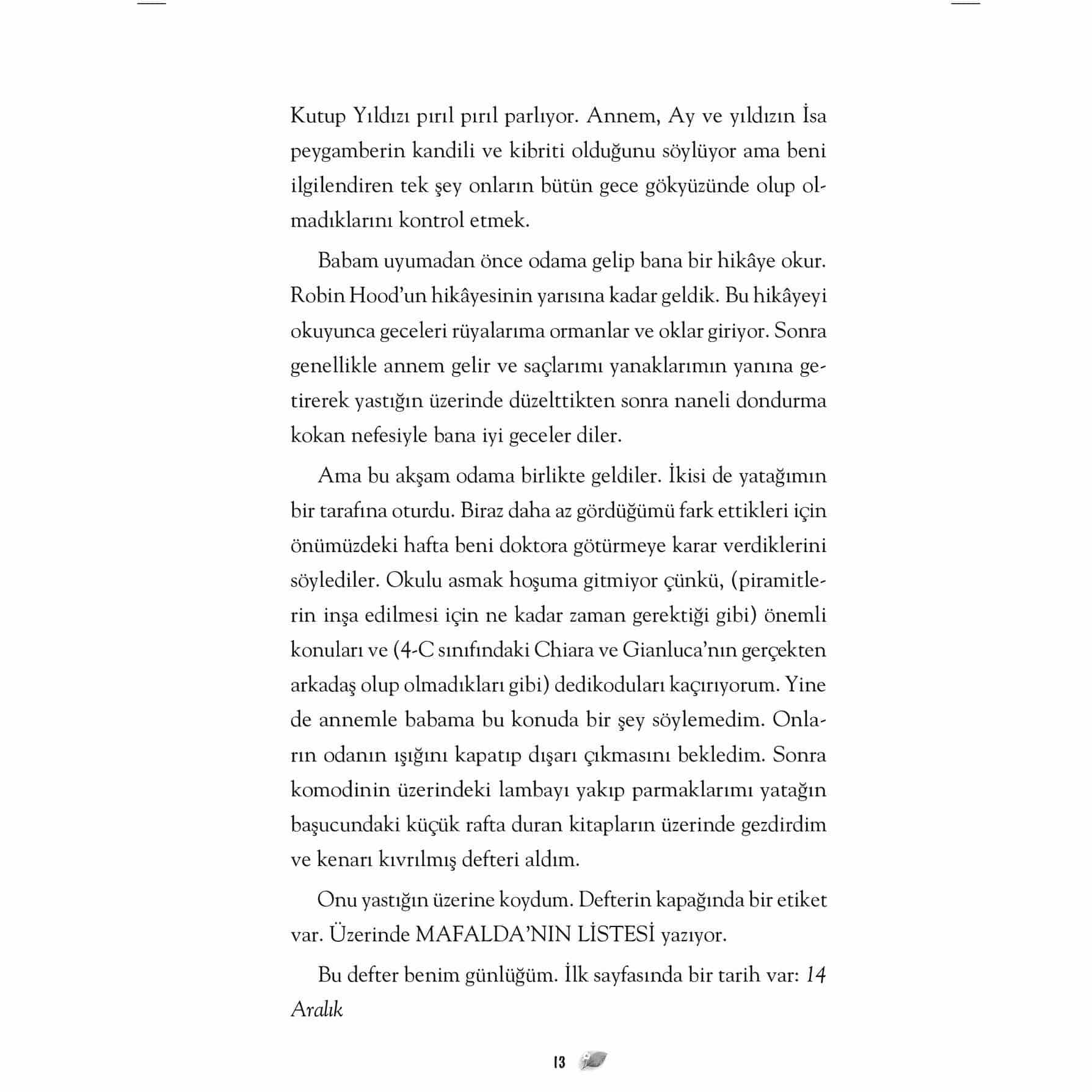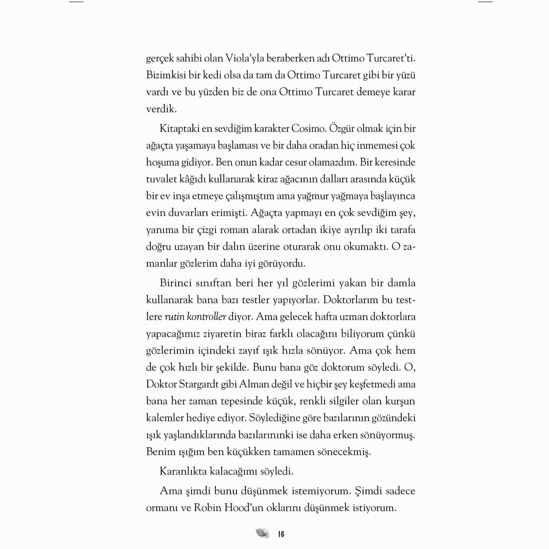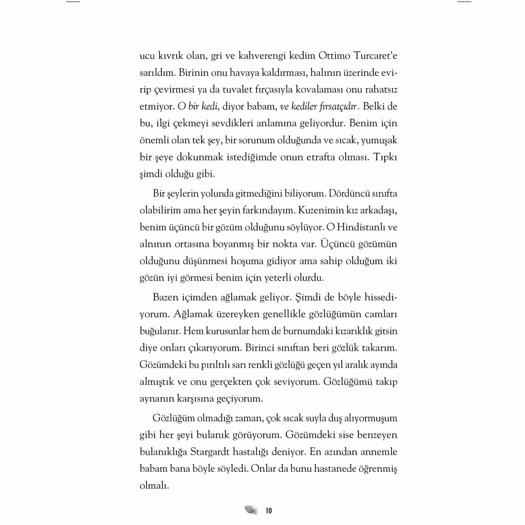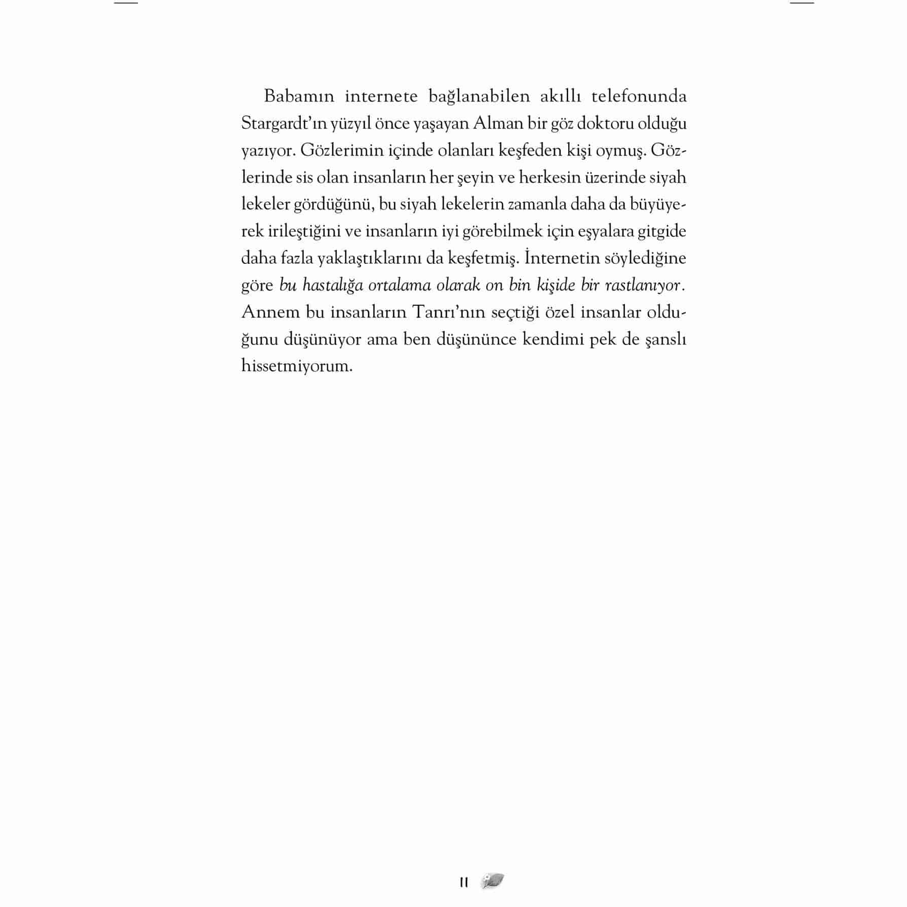 Durup kiraz ağacını selamlıyorum. Babamla birlikte her gün geçtiğimiz sokaktan bakınca onu uzaktan -ama sadece uzaktan- görebiliyorum. Aslında karşımda gördüğüm şey renkli bir leke ama ben onun ağaç olduğunu, yani hayallerimdeki gibi iyi yürekli bir devin saçları olduğunu biliyorum. Tamamen bulanık, ama orada. *** Yazarın kendi yaşam hikâyesinden esinlenerek, küçük bir kızın görme yetisini kaybetmesiyle ilgili kaleme alınmış olan bu roman her yaştan okur için Küçük Prens, İçimdeki Müzik gibi kitapların hayranları için çok özel bir yeri olacak… Mafalda, dokuz yaşında bir kız çocuğu ve bildiği bir şey var: Gelecek altı ay içinde, görme yetisini tamamen kaybedecek. Mafalda, görünürdeki bu karanlık gelecekte yolunu bulabilecek, okula gidebilecek, futbol oynayabilecek ve kendisine bakabilecek mi? Ailesi ve arkadaşlarının yardımıyla Mafalda, kendisi için önemli olan şeyler keşfetmeye çalışır. Görme yetisini kaybetse de yapabileceği şeylerin listesini çıkarır…İlham veren bir cesaret ve kararlılık hikâyesi.