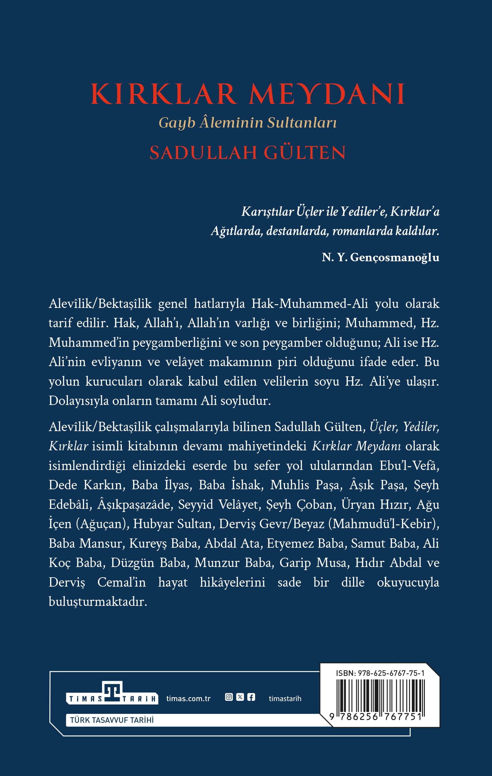 Karıştılar Üçler ile Yediler’e, Kırklar’a Ağıtlarda, destanlarda, romanlarda kaldılar. N. Y. Gençosmanoğlu Alevîlik/Bektaşîlik genel hatlarıyla Hak-Muhammed-Ali yolu olarak tarif edilir. Hak, Allah’ı, Allah’ın varlığı ve birliğini; Muhammed, Hz. Muhammed’in peygamberliğini ve son peygamber olduğunu; Ali ise Hz. Ali’nin evliyanın ve velâyet makamının piri olduğunu ifade eder. Bu yolun kurucuları olarak kabul edilen velilerin soyu Hz. Ali’ye ulaşır. Dolayısıyla onların tamamı Ali soyludur. Fakat pek çoğunun hayat hikâyesi menkıbeler, destanlar ve efsanelerle örtülüdür. Alevîlik/Bektaşîlik çalışmalarıyla bilinen Sadullah Gülten, Üçler, Yediler, Kırklar isimli kitabının devamı mahiyetindeki Kırklar Meydanı isimli eserde bu sefer yol ulularından Ebu’l-Vefâ, Dede Karkın, Baba İlyas, Baba İshak, Muhlis Paşa, Âşık Paşa, Şeyh Edebâli, Âşıkpaşazâde, Seyyid Velâyet, Şeyh Çoban, Üryan Hızır, Ağu İçen (Ağuçan), Hubyar Sultan, Derviş Gevr/Beyaz (Mahmudü’l-Kebir), Baba Mansur, Kureyş Baba, Abdal Ata, Etyemez Baba, Samut Baba, Ali Koç Baba, Düzgün Baba, Munzur Baba, Garip Musa, Hıdır Abdal ve Derviş Cemal’in hayat hikâyelerini sade bir dille okuyucuyla buluşturmaktadır.