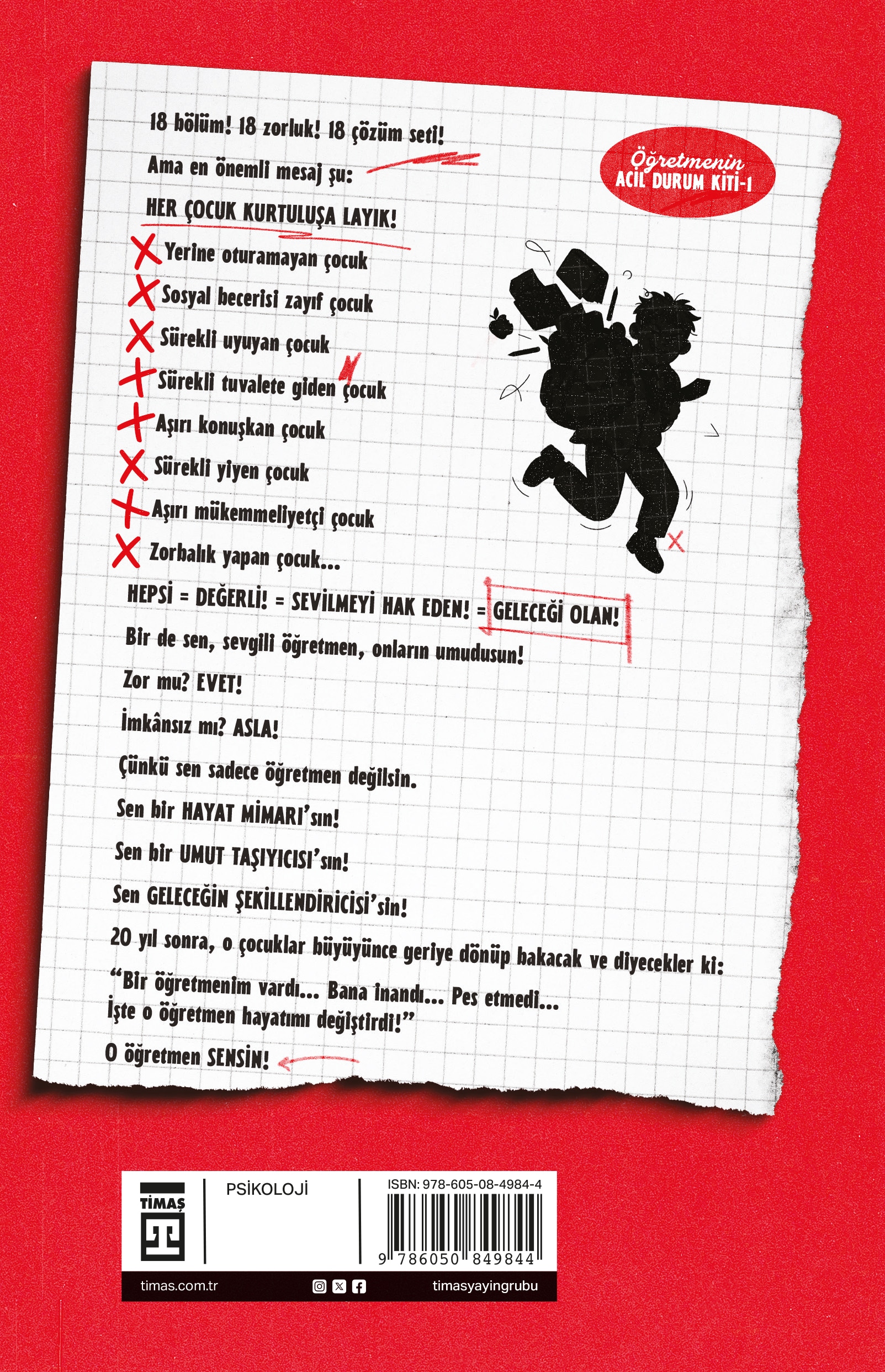 18 bölüm! 18 zorluk! 18 çözüm seti! Ama en önemli mesaj şu: HER ÇOCUK KURTULUŞA LAYIK! • Yerine oturamayan çocuk • Sosyal becerisi zayıf çocuk • Sürekli uyuyan çocuk • Sürekli tuvalete giden çocuk • Aşırı konuşkan çocuk • Sürekli yiyen çocuk • Aşırı mükemmeliyetçi çocuk • Zorbalık yapan çocuk… HEPSİ = DEĞERLİ! = SEVİLMEYİ HAK EDEN! = GELECEĞİ OLAN! Bir de sen, sevgili öğretmen, onların umudusun! Zor mu? EVET! İmkânsız mı? ASLA! Çünkü sen sadece öğretmen değilsin. Sen bir HAYAT MİMARI’sın! Sen bir UMUT TAŞIYICISI’sın! Sen GELECEĞİN ŞEKİLLENDİRİCİSİ’sin! 20 yıl sonra, o çocuklar büyüyünce geriye dönüp bakacak ve diyecekler ki: “Bir öğretmenim vardı… Bana inandı… Pes etmedi… İşte o öğretmen hayatımı değiştirdi!” O öğretmen SENSİN!