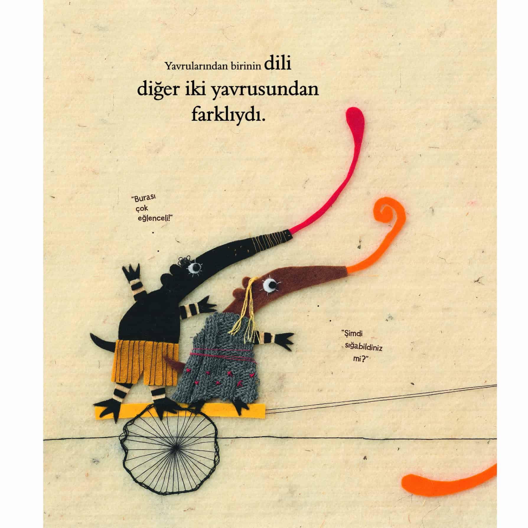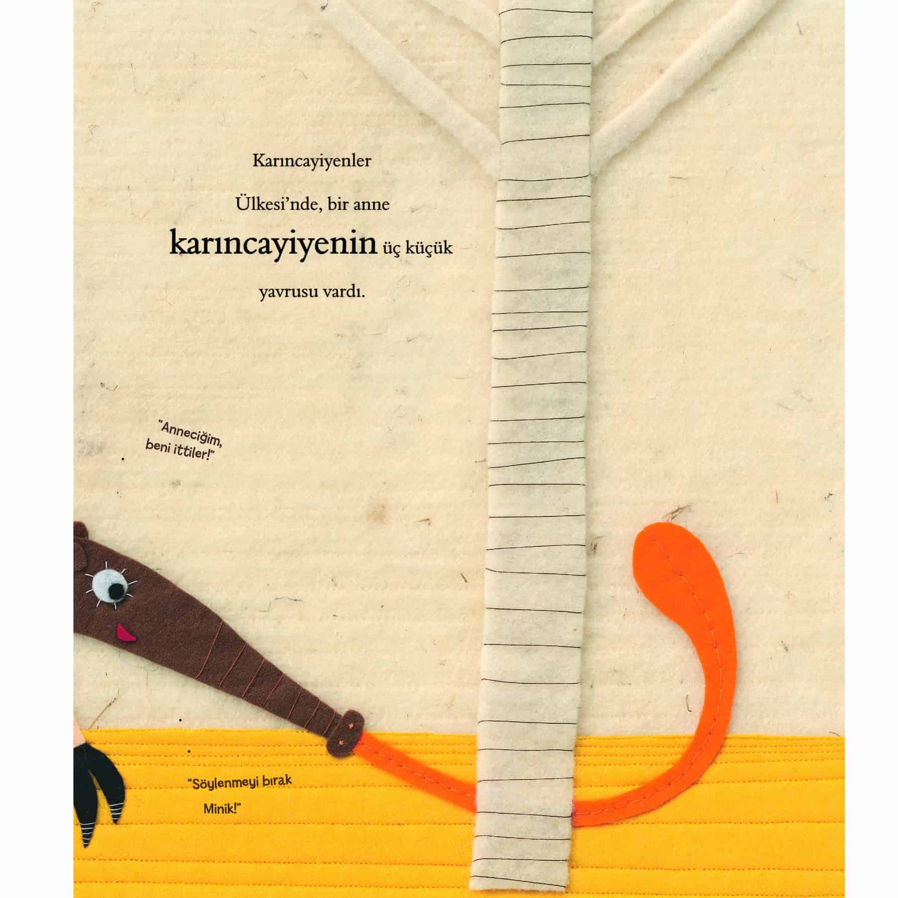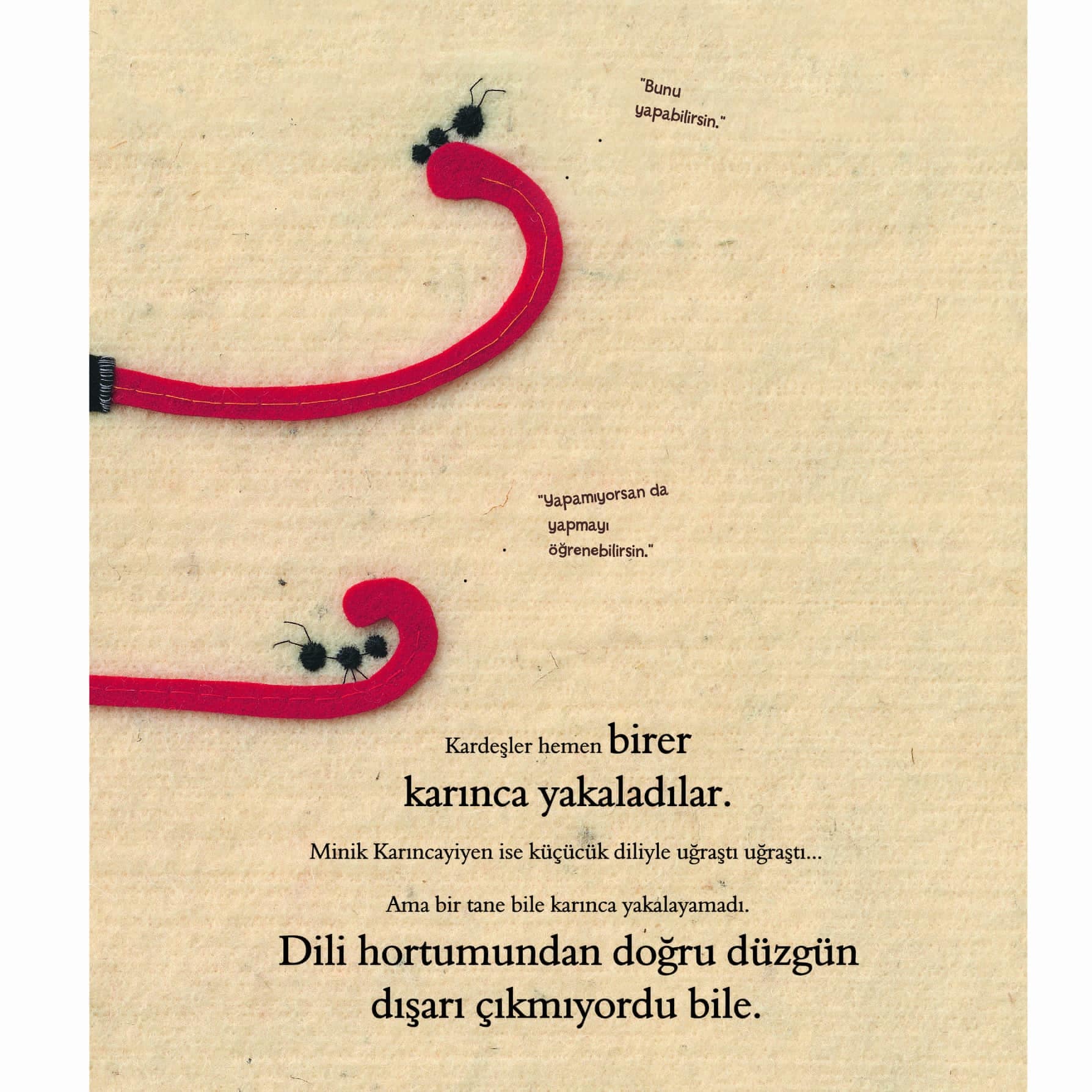 Manica Musil yine miniklerin kocaman kalbine dokunmayı başarıyor. Keçeden hazırladığı görsellerle, doğuştan "diğerleri gibi" olmayan bir karıncayiyenin verdiği mücadeleyi gözler önüne seriyor, eğer bakış açımızı değiştirirsek farklı olmanın avantajlarını da görebileceğimizi vurguluyor.