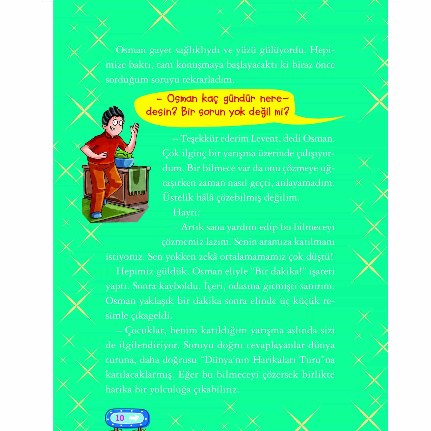 Komik, saf, deli dolu Levent ve tayfası, bir gün Osman’ın çözmeye çalıştığı bir bilmecenin peşine düşüyor. Hem de ne bilmece! Onları Türkiye’den Çin’e, yok yok, İtalya’ya, durun daha bitmedi, Mısır’a, hatta Hindistan’a sürüklüyor bilmeceler… Birlikte neredeyse tüm Türkiye’yi gezen tayfa, bu sefer dünyaya açılıyor. Tabii yine başlarını türlü belalara sokuyorlar, bir suçlunun peşinden koşuyorlar... Her şey dünyanın harikalarını korumak için! Kendilerini eğlenceli olduğu kadar heyecanlı, tehlikeli mi tehlikeli bir maceranın içinde buluyorlar. Dünya mirasını korumak, onlar için her şeyden önemli. Dünya harikalarının tarihini öğrenirken onları korumaya hazır mısın? Bambaşka bir Levent macerası seni bekliyor!