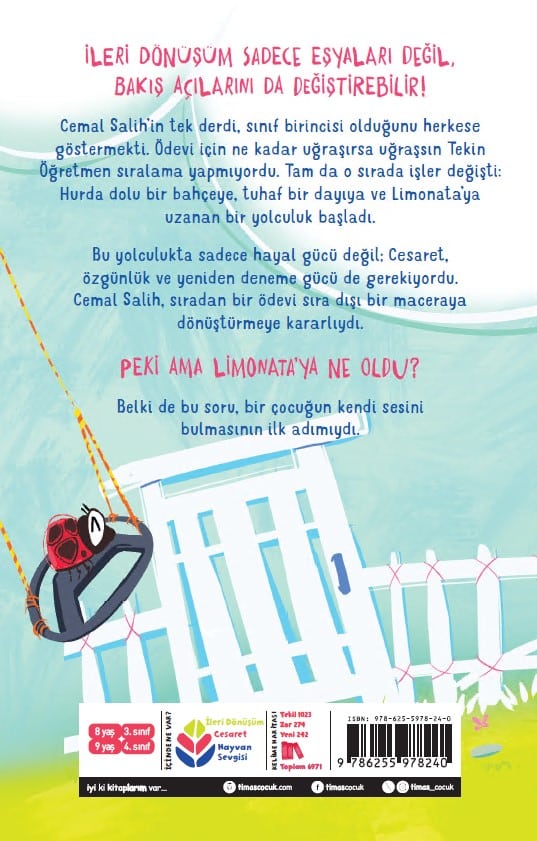 İleri dönüşüm sadece eşyaları değil, bakış açılarını da değiştirebilir! Cemal Salih’in tek derdi, sınıf birincisi olduğunu herkese göstermekti. Ödevi için ne kadar uğraşırsa uğraşsın Tekin Öğretmen sıralama yapmıyordu. Tam da o sırada işler değişti: Hurda dolu bir bahçeye, tuhaf bir dayıya ve Limonata’ya uzanan bir yolculuk başladı. Bu yolculukta sadece hayal gücü değil: Cesaret, özgünlük ve yeniden deneme gücü de gerekiyordu. Cemal Salih, sıradan bir ödevi sıra dışı bir maceraya dönüştürmeye kararlıydı. Peki ama Limonata’ya ne oldu? Belki de bu soru, bir çocuğun kendi sesini bulmasının ilk adımıydı.
