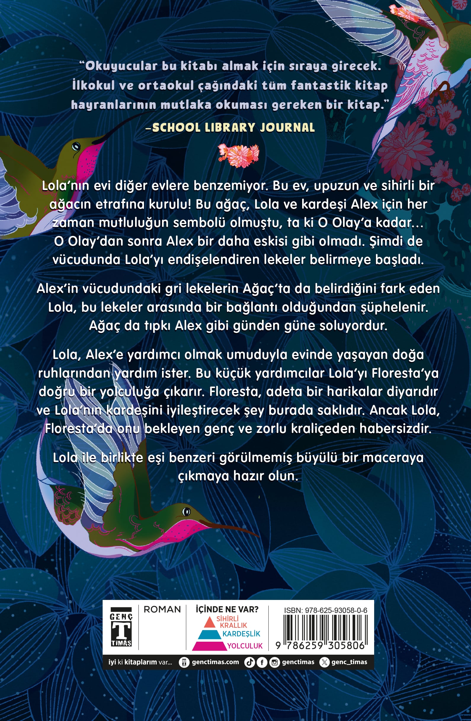 “Okurlar bu kitabı almak için sıraya girecek. İlkokul ve ortaokul çağındaki tüm fantastik kitap hayranlarının mutlaka okuması gereken bir kitap.” —School Library JournalLola’nın evi diğer evlere benzemiyor. Bu ev, upuzun ve sihirli bir ağacın etrafına kurulu! Bu ağaç, Lola ve kardeşi Alex için her zaman mutluluğun sembolü olmuştu, ta ki O Olay’a kadar… O Olay’dan sonra Alex bir daha eskisi gibi olmadı. Şimdi de vücudunda Lola’yı endişelendiren lekeler belirmeye başladı.Alex’in vücudundaki gri lekelerin Ağaç’ta da belirdiğini fark eden Lola, bu lekeler arasında bir bağlantı olduğundan şüphelenir. Ağaç da tıpkı Alex gibi günden güne soluyordur.Lola, Alex’e yardımcı olmak umuduyla evinde yaşayan doğa ruhlarından yardım ister. Bu küçük yardımcılar Lola’yı Floresta’ya doğru bir yolculuğa çıkarır. Floresta, bir harikalar diyarıdır ve Lola’nın kardeşini iyileştirecek şey burada saklıdır. Ancak Lola, Floresta’da onu bekleyen genç ve zorlu kraliçeden habersizdir.Lola ile birlikte eşi benzeri görülmemiş büyülü bir maceraya çıkmaya hazır olun.