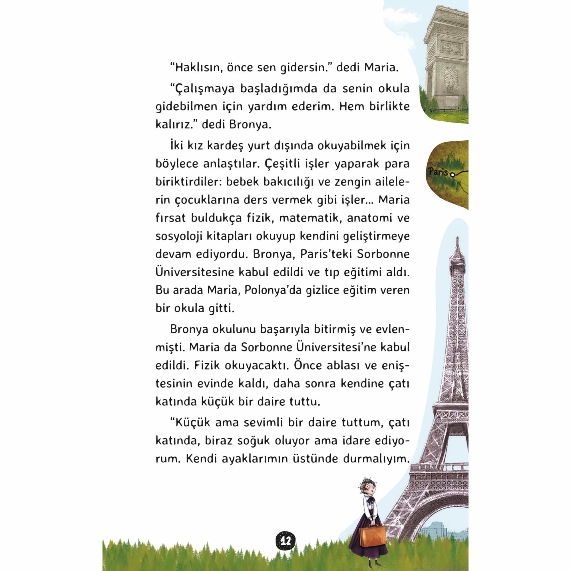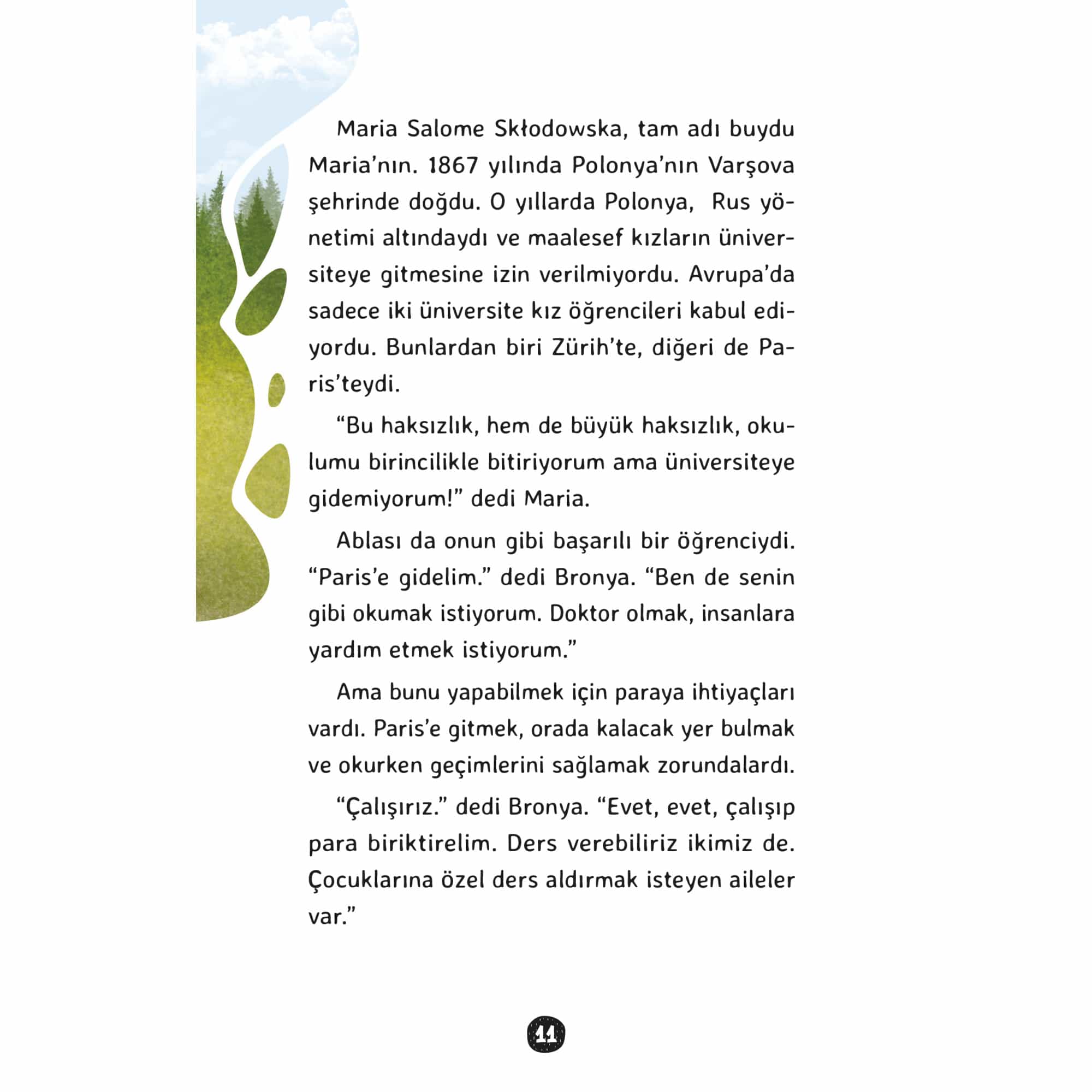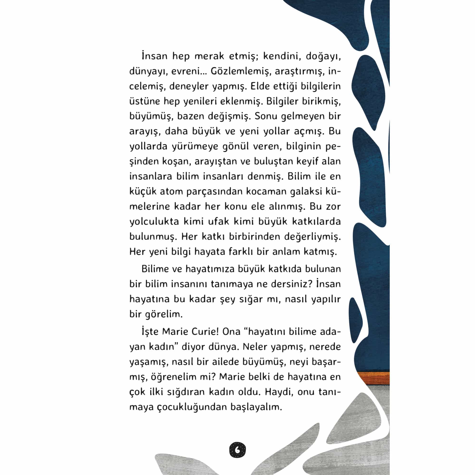 Polonya'da kız çocuklarının üniversiteye alınmaması önüne çıkan ilk engeldi. Bilime merakı, kendine olan güveni, çalışma azmi ve kararlılığı sayesinde önüne çıkan tüm engelleri bir bir aştı. Paris'te devam ettiği eğitim ve çalışma hayatında ilkleri başardı. Yaptığı keşifler tüm dünyanın onu tanımasını sağladı. Nobel Ödülü’nü alan ilk kadın bilim insanı oldu!Çalışmaktan ve araştırmaktan asla vazgeçmeyen, hayatını bilime adayan, onlarca kadına güç veren bir bilim insanı, Marie Curie.
