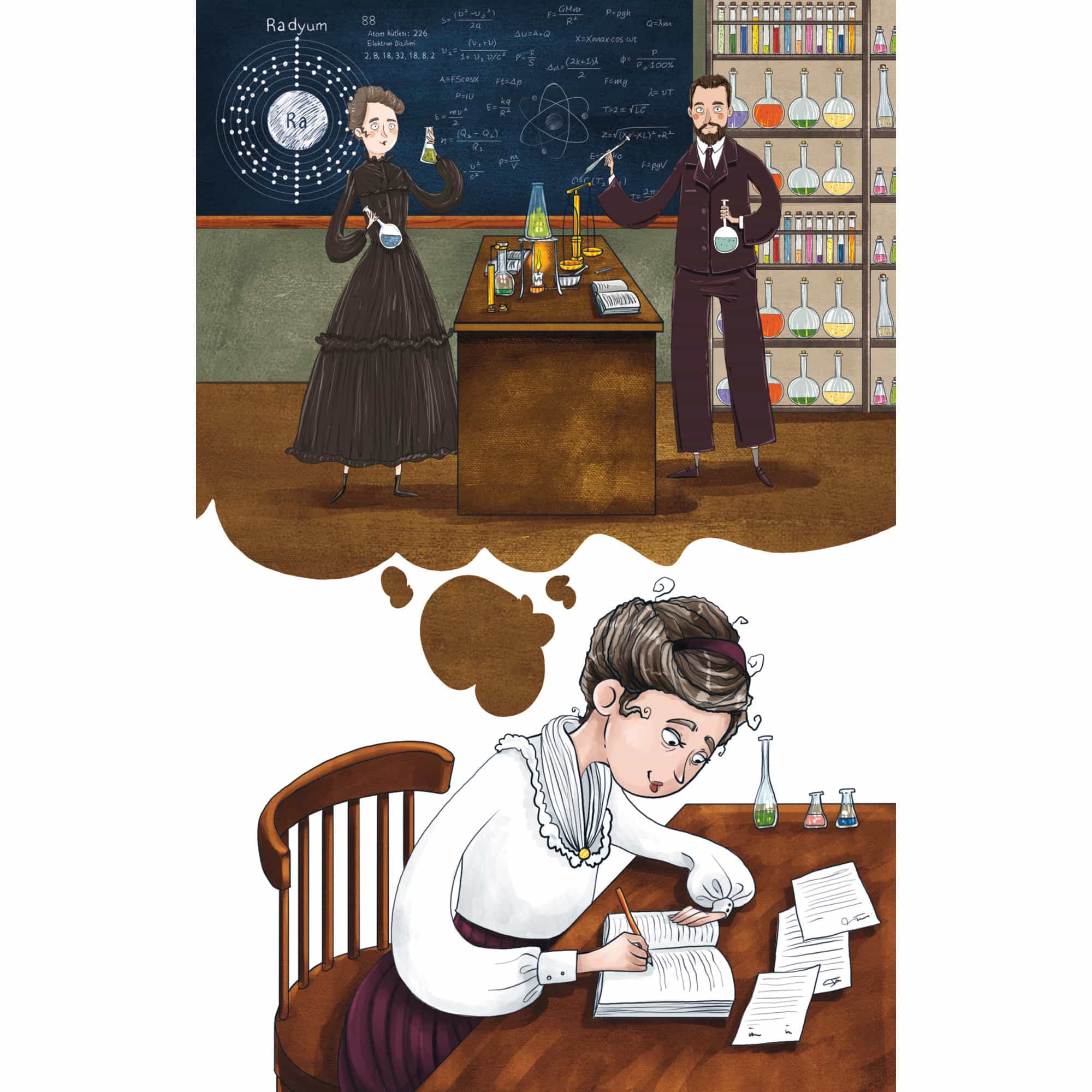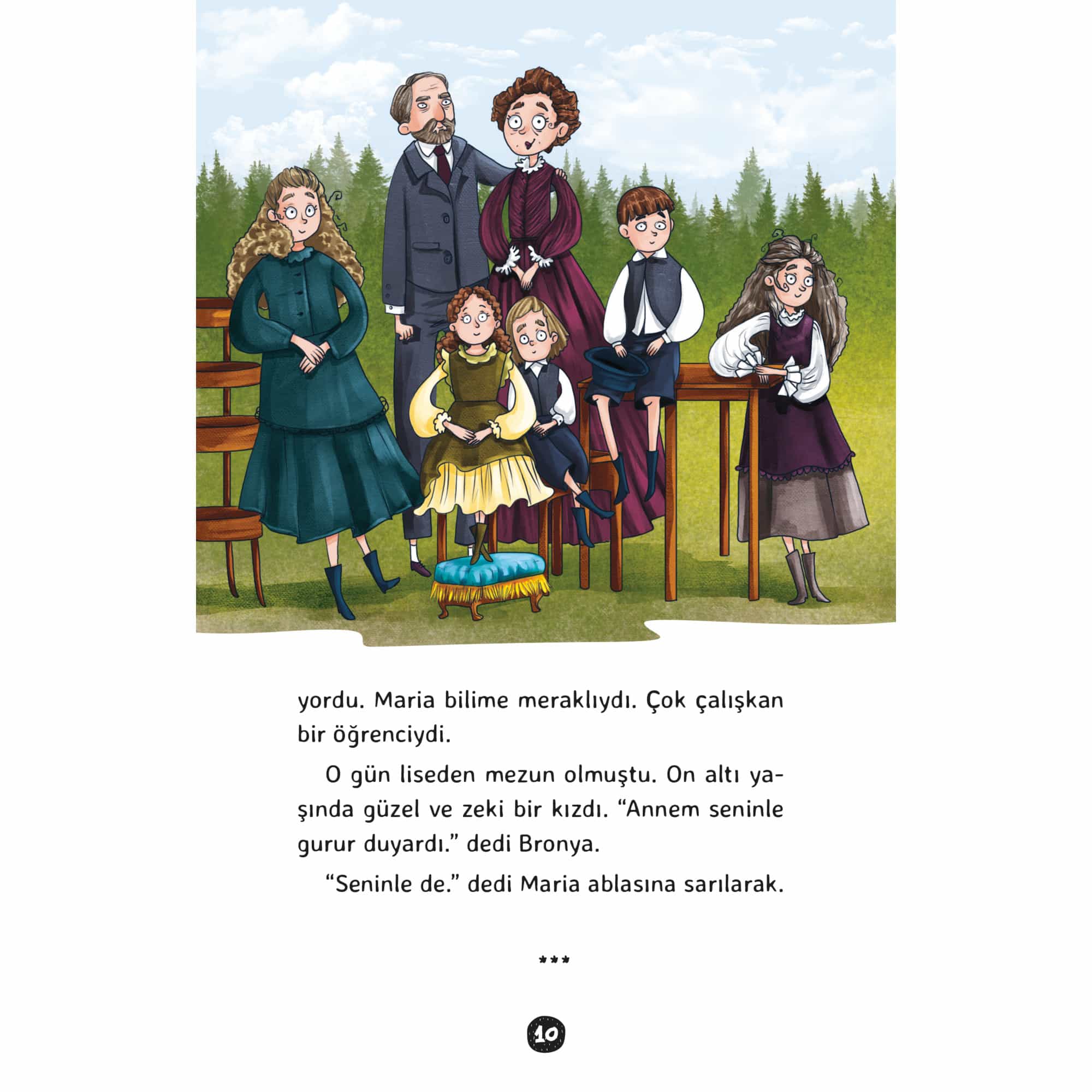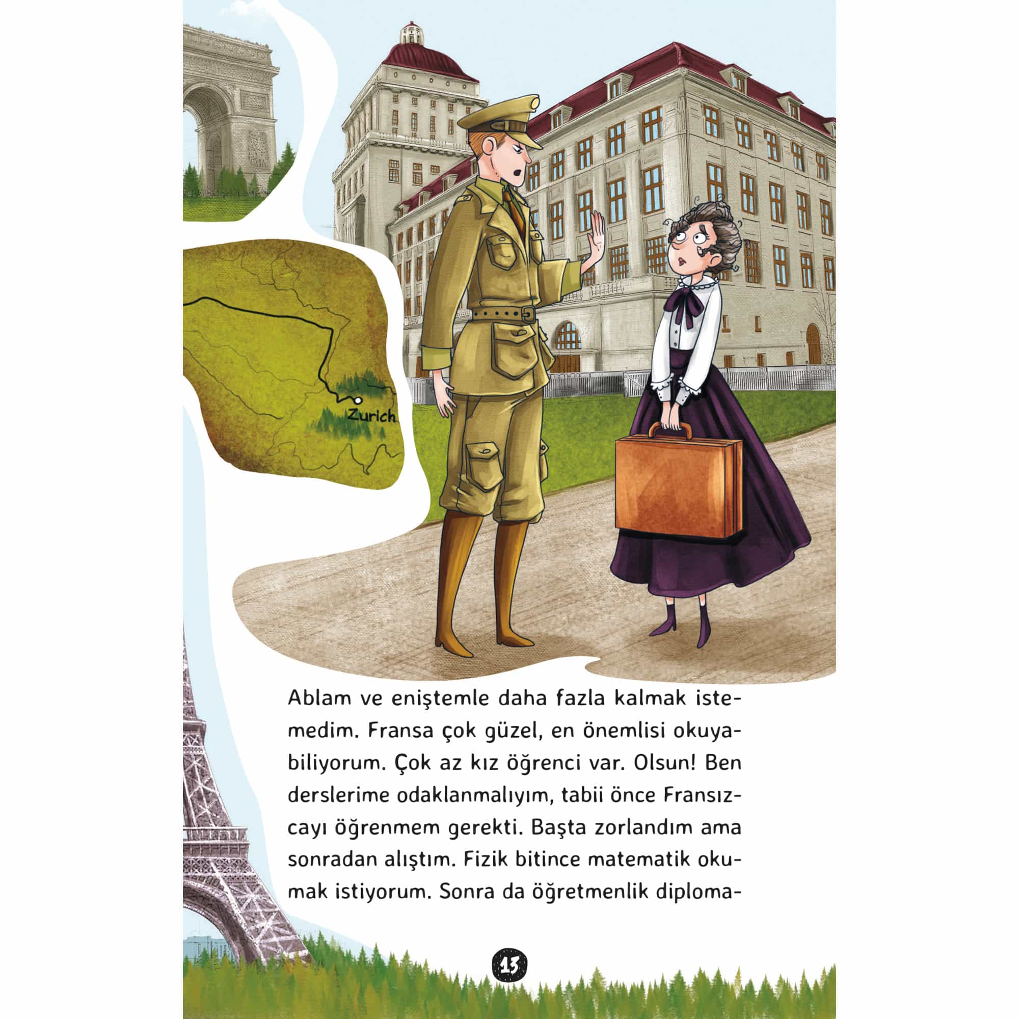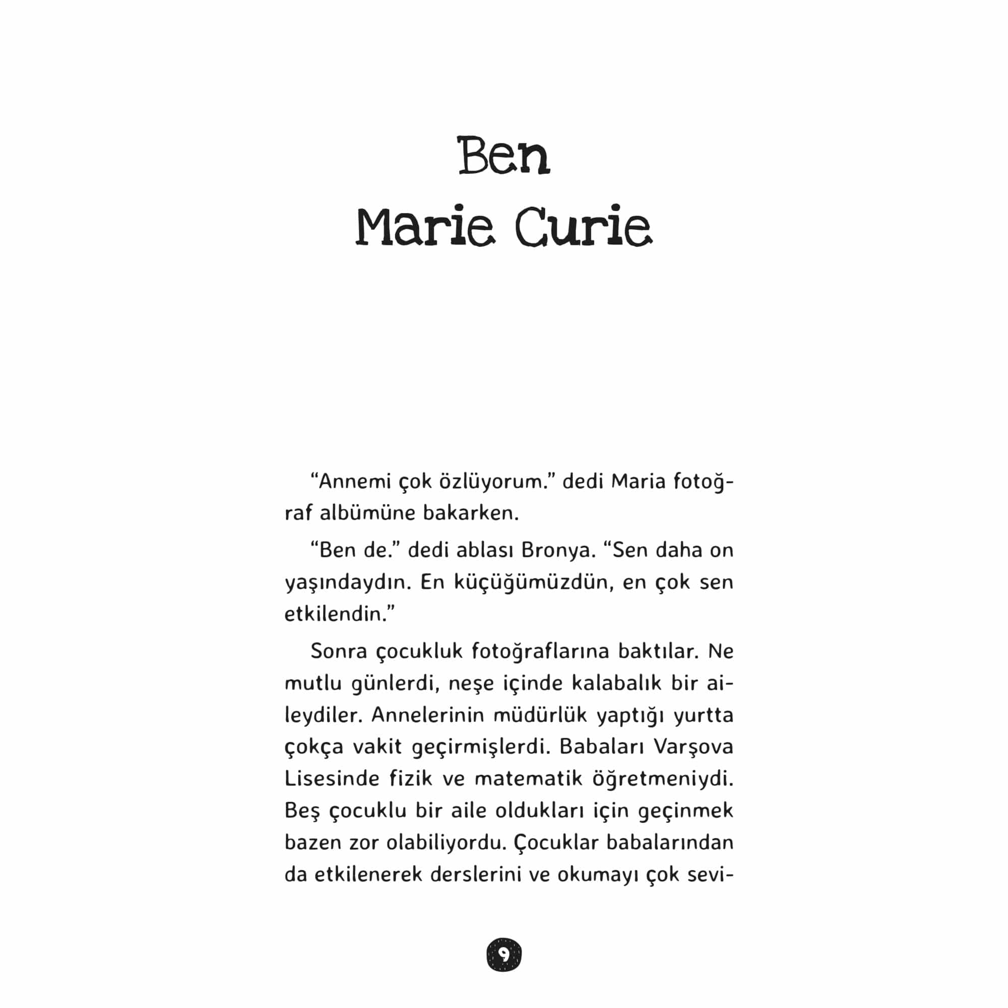 Polonya'da kız çocuklarının üniversiteye alınmaması önüne çıkan ilk engeldi. Bilime merakı, kendine olan güveni, çalışma azmi ve kararlılığı sayesinde önüne çıkan tüm engelleri bir bir aştı. Paris'te devam ettiği eğitim ve çalışma hayatında ilkleri başardı. Yaptığı keşifler tüm dünyanın onu tanımasını sağladı. Nobel Ödülü’nü alan ilk kadın bilim insanı oldu!Çalışmaktan ve araştırmaktan asla vazgeçmeyen, hayatını bilime adayan, onlarca kadına güç veren bir bilim insanı, Marie Curie.
