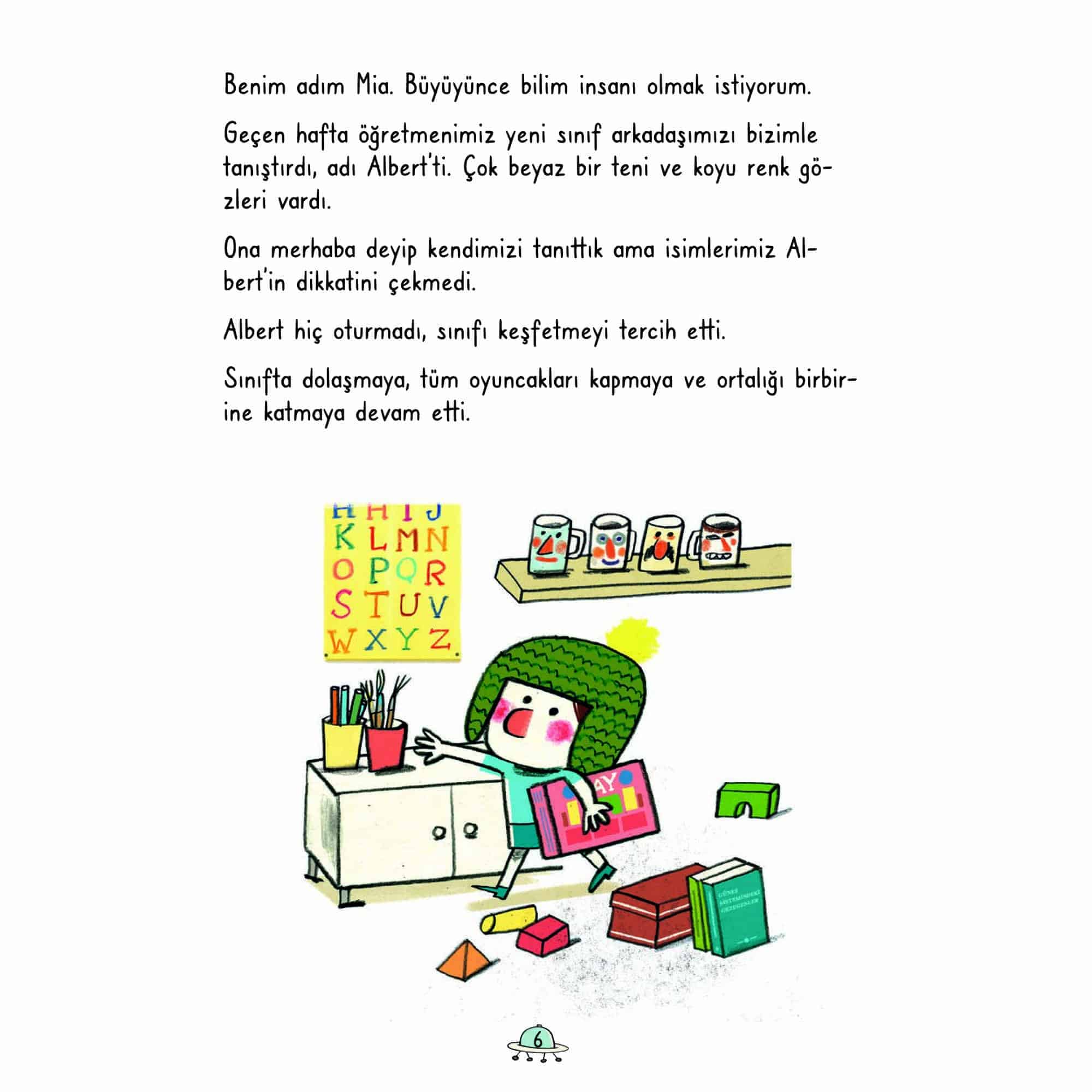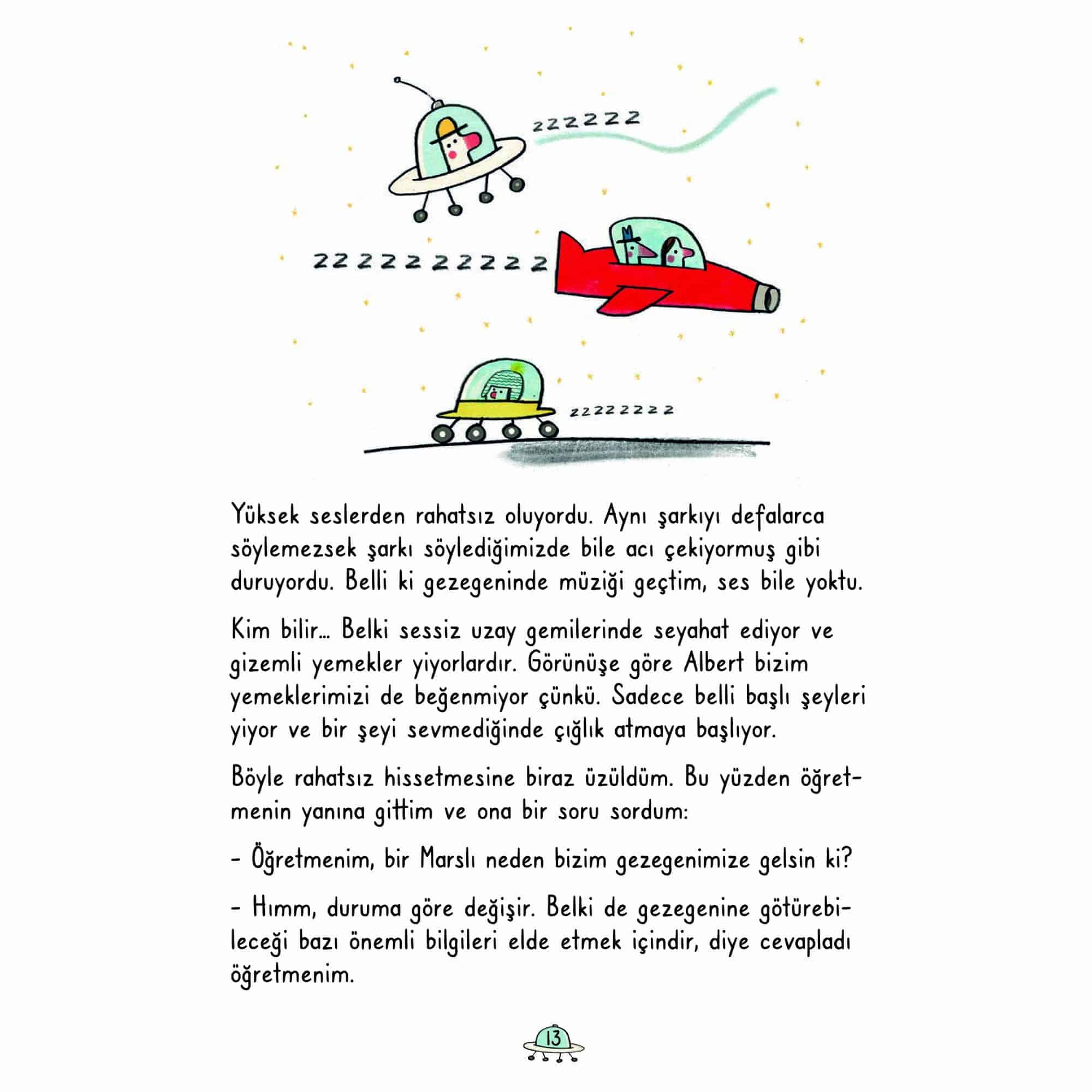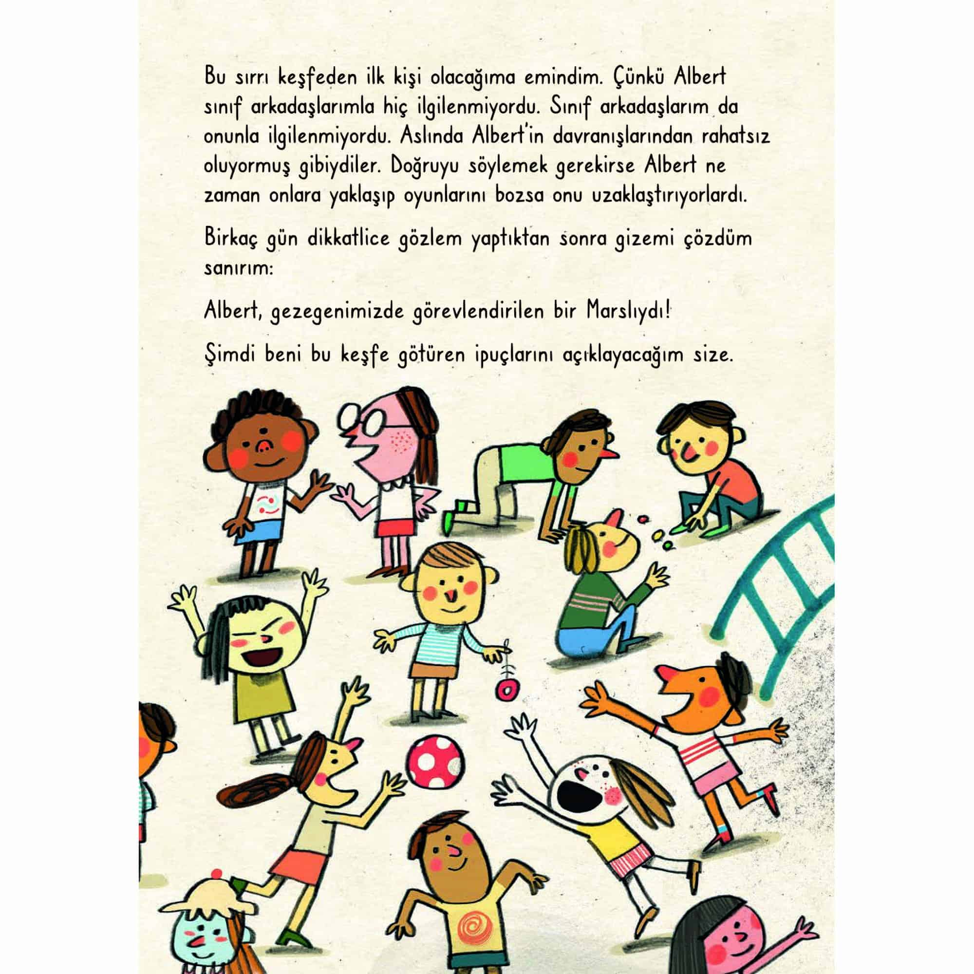 Mia, meraklı ve cesur bir çocuktur, bilim sevgisiyle doludur. Okula yeni başlayan arkadaşı Albert ise diğerlerinden farklıdır ve bu hemen Mia’nın dikkatini çeker. Kimseyi dinlemeyen ve kendi hâlinde olan Albert Marslı olabilir mi diye düşünür. Albert hakkındaki gerçeği keşfetmeye kararlı olan Mia, harekete geçer ve kalpleri ısıtacak bir dostluk kurulur. Otizm ve empati üzerine yazılmış eşsiz bir öykü.