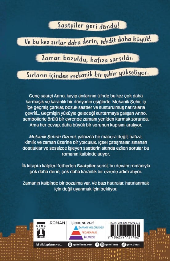 Genç saatçi Anno, kayıp anılarının izinde bu kez çok daha karmaşık ve karanlık bir dünyanın eşiğinde. Mekanik Şehir, iç içe geçmiş çarklar, bozuk saatler ve susturulmuş hatıralarla çevrili... Geçmişin yüküyle geleceği kurtarmaya çalışan Anno, sembollerle örülü bir evrende zamanı yeniden kurmak zorunda. Ama her cevap, daha büyük bir sorunun kapısını aralıyor. Mekanik Şehrin Gizemi, yalnızca bir macera değil; hafıza, kimlik ve zaman üzerine bir yolculuk. İçsel çatışmalar, sınanan dostluklar ve sessizce işleyen saatlerin altında ezilen sorular bu romanın kalbinde atıyor. İlk kitapta kalpleri fetheden Saatçiler serisi, bu devam romanıyla çok daha derin, çok daha karanlık bir evrene adım atıyor. Zamanın kalbinde bir bozulma var. Ve bazı hatıralar, hatırlanmak için değil uyanmak için bekliyor.