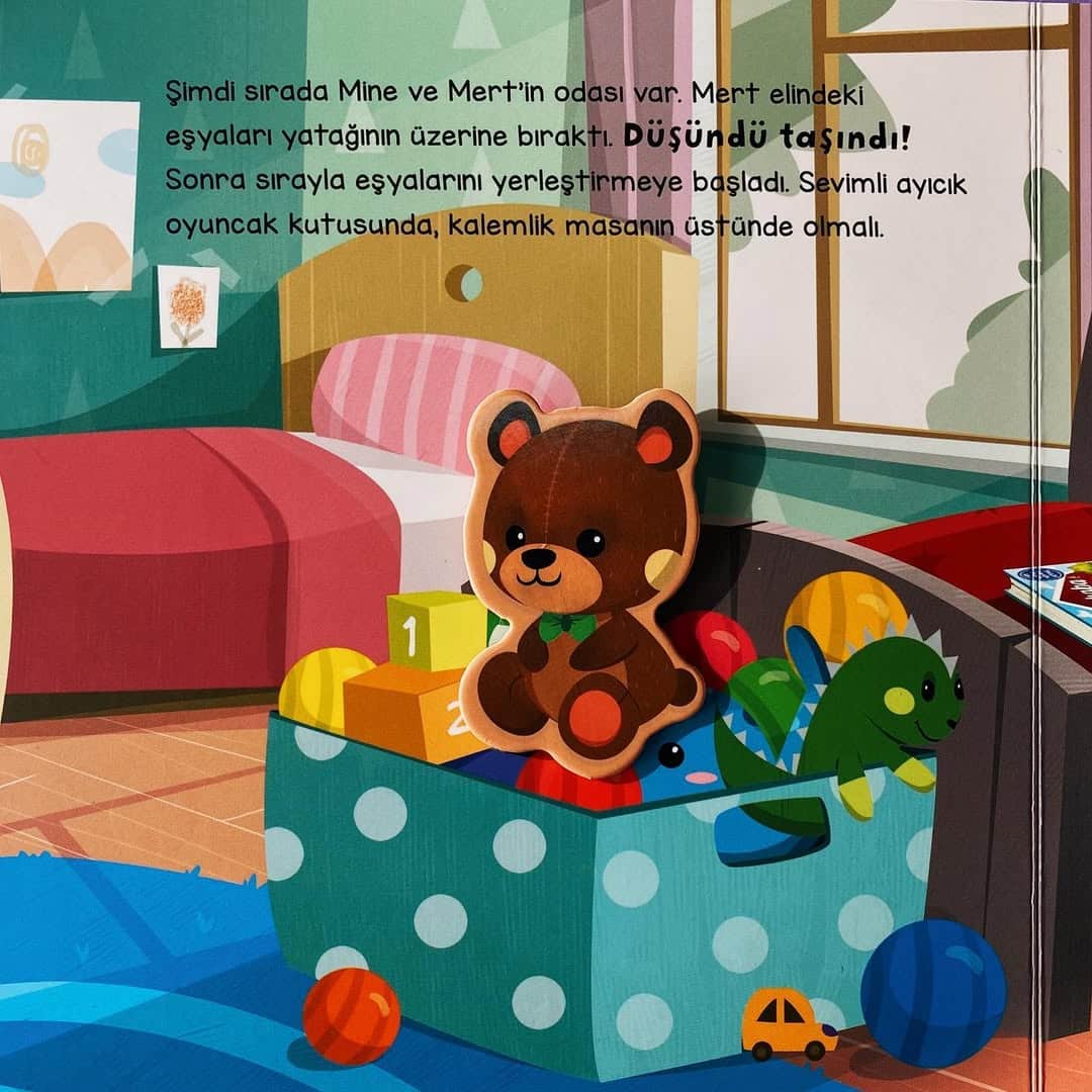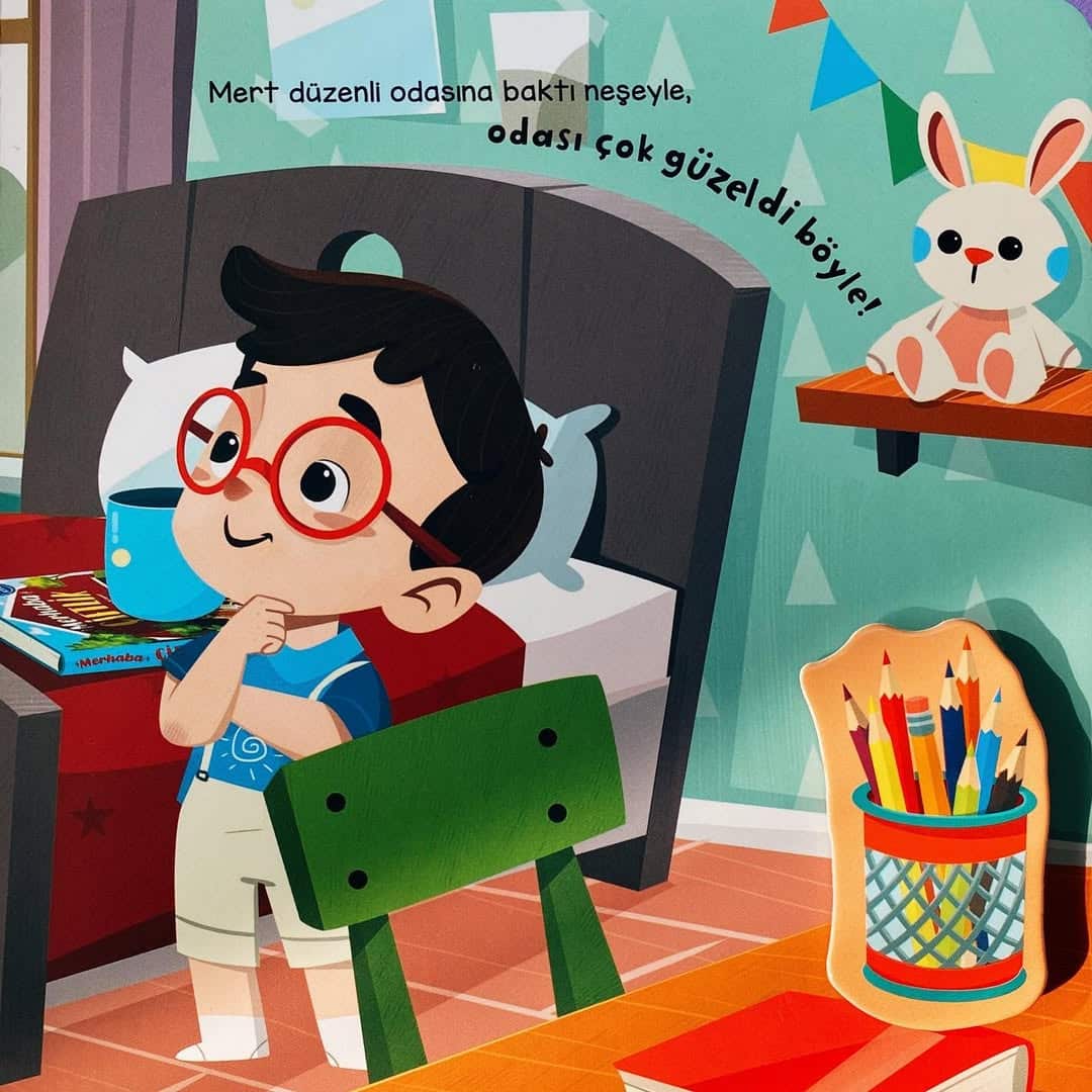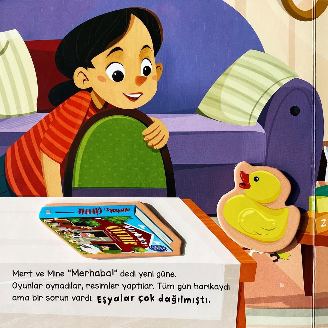 "Mert ve Mine "Merhaba!" dedi yeni güne. Oyunlar oynadılar,resimler yaptılar. Tüm gün harikaydı ama bir sorun vardı. Eşyalar çok dağılmıştı." Mert dağılan eşyaları kendi yerleştirmek istiyor.Sizce yardıma ihtiyacı olacak mı?Haydi birlikte öğrenelim.Dağılan eşyaları metne göre yerlerine yerleştir,sorumluluk alıp düzneli olmanın mutluluğunu keşfet!