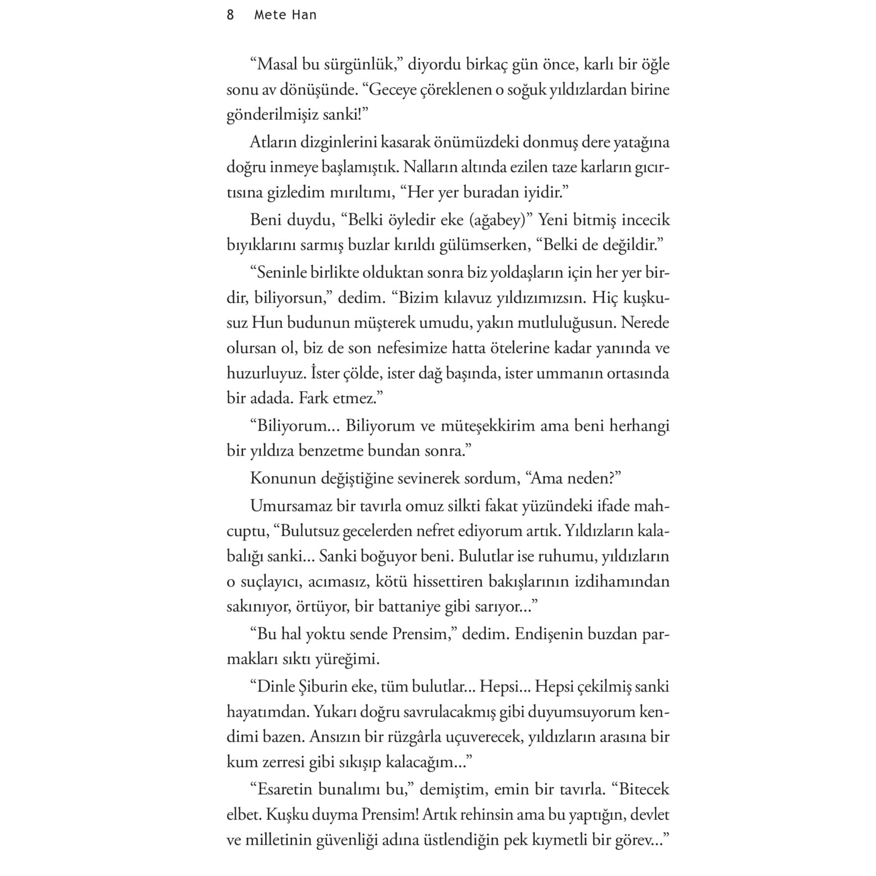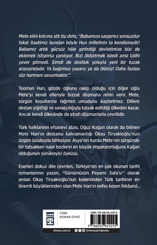 Mete elini kılıcına attı bu defa, “Babamıza saygımız sonsuzdur fakat itaatimiz bundan böyle Hun milletinin ta kendisinedir! Babamız artık güçsüz hâle getirdiği devletimize bizi de eklemek istiyorsa yanılıyor. Bizi öldürtmek istedi ama talihi yaver gitmedi. Şimdi de dostluk yoluyla yeni bir tuzak arayışındadır. Ya bağımsız yaşarız ya da ölürüz! Daha fazlası söz harmanı savurmaktır.” Teoman Han, gözde oğluna rakip olduğu için diğer oğlu Mete’yi kendi elleriyle bizzat düşmana rehin verir. Mete, sürgün koşullarına rağmen umudunu kaybetmez. Dillere destan yiğitliği ve savaşçılığıyla tutsak edildiği ülkeden kaçar. Ancak kendi ülkesinde de etrafı düşmanlarla çevrilidir. Türk halklarının efsanevi atası, Oğuz Kağan olarak da bilinen Mete Han’ın destansı kahramanlığı Okay Tiryakioğlu’nun özgün üslubuyla birleşiyor. Asya’nın kurdu Mete’nin sürgünde bir tutsakken nasıl bozkırın en büyük imparatorluğuna Kağan olduğunun sürükleyici öyküsü. Eserleri dokuz dile çevrilen, Türkiye’nin en çok okunan tarihî romanlarının yazarı, “Günümüzün Peyami Safa’sı” olarak anılan Okay Tiryakioğlu’nun kaleminden Türk tarihinin en önemli büyüklerinden olan Mete Han’ın nefes kesen hikâyesi…