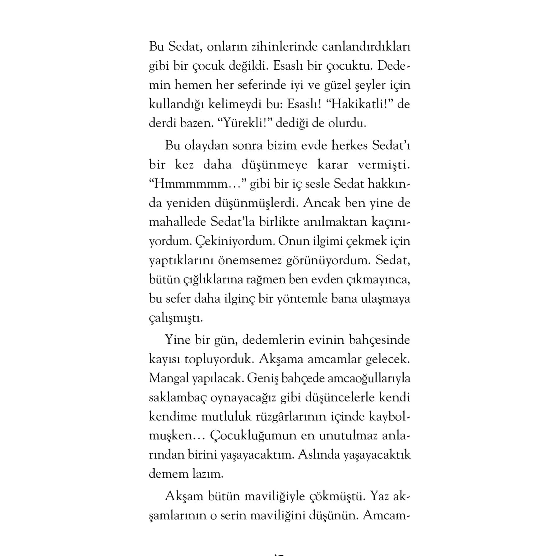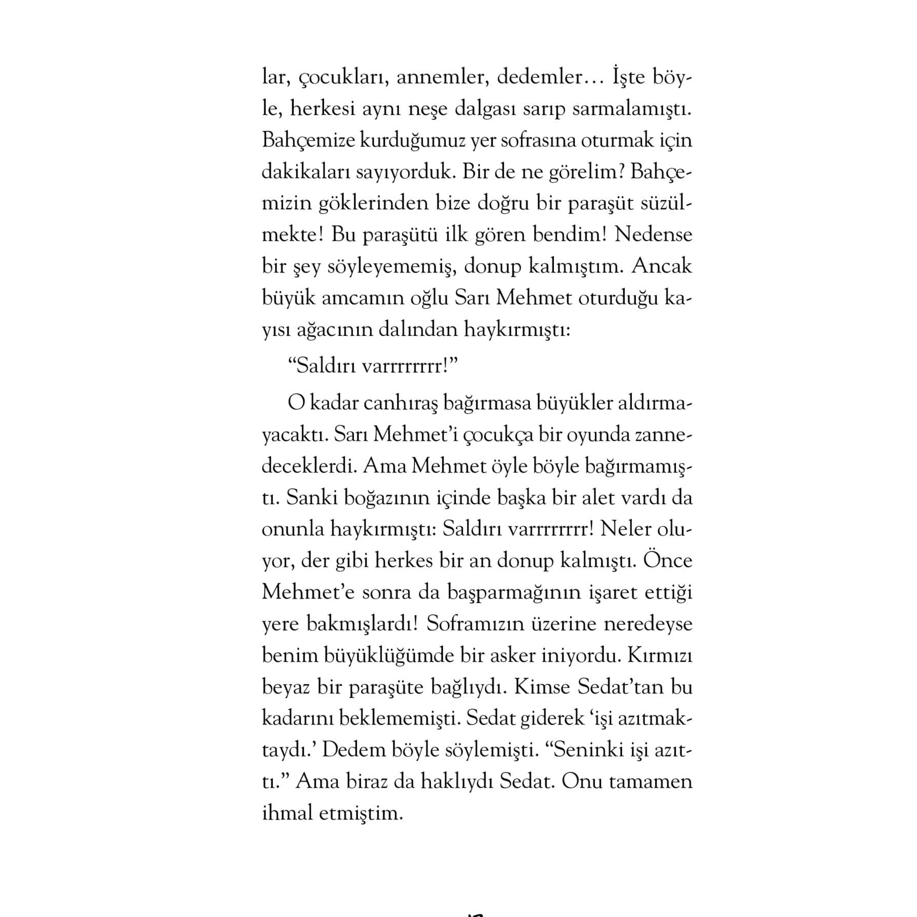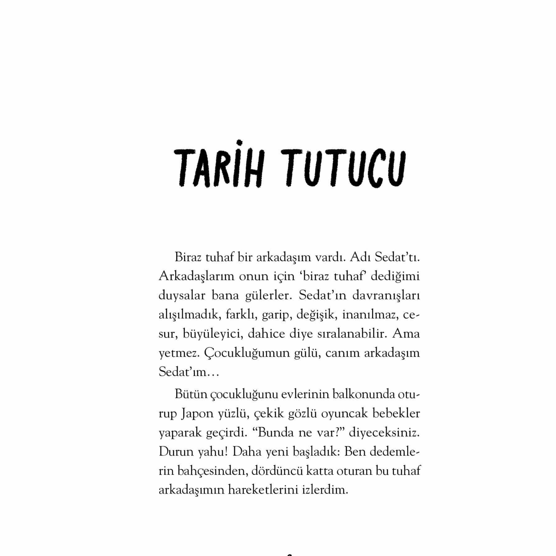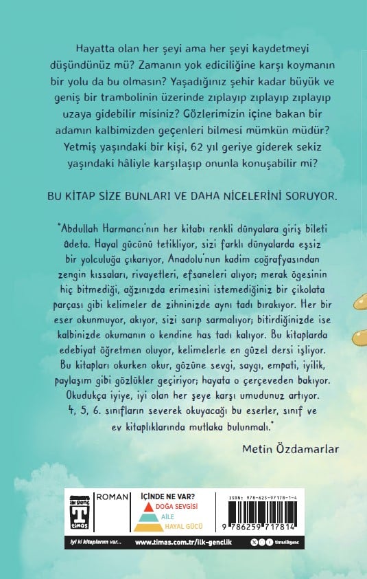 Hayatta olan her şeyi ama her şeyi kaydetmeyi düşündünüz mü? Zamanın yok ediciliğine karşı koymanın bir yolu da bu olmasın? Yaşadığınız şehir kadar büyük ve geniş bir trambolinin üzerinde zıplayıp zıplayıp zıplayıp uzaya gidebilir misiniz? Gözlerimizin içine bakan bir adamın kalbimizden geçenleri bilmesi mümkün müdür? Yetmiş yaşındaki bir kişi, 62 yıl geriye giderek sekiz yaşındaki hâliyle karşılaşıp onunla konuşabilir mi? Bu kitap size bunları ve daha nicelerini soruyor. “Abdullah Harmancı’nın her kitabı renkli dünyalara giriş bileti âdeta. Hayal gücünü tetikliyor, sizi farklı dünyalarda eşsiz bir yolculuğa çıkarıyor, Anadolu’nun kadim coğrafyasından zengin kıssaları, rivayetleri, efsaneleri alıyor; merak ögesinin hiç bitmediği, ağzınızda erimesini istemediğiniz bir çikolata parçası gibi kelimeler de zihninizde aynı tadı bırakıyor. Her bir eser okunmuyor, akıyor, sizi sarıp sarmalıyor, bitirdiğinizde ise kalbinizde okumanın o kendine has tadı kalıyor. Bu kitaplarda edebiyat, öğretmen oluyor, kelimelerle en güzel dersi işliyor. Bu kitapları okurken okur, gözüne sevgi, saygı, empati, iyilik, paylaşım gibi gözlükler geçiriyor; hayata o çerçeveden bakıyor. Okudukça iyiye, iyi olan her şeye karşı umudunuz artıyor. 4, 5, 6. sınıfların severek okuyacağı bu eserler, sınıf ve ev kitaplıklarında mutlaka bulunmalı.”