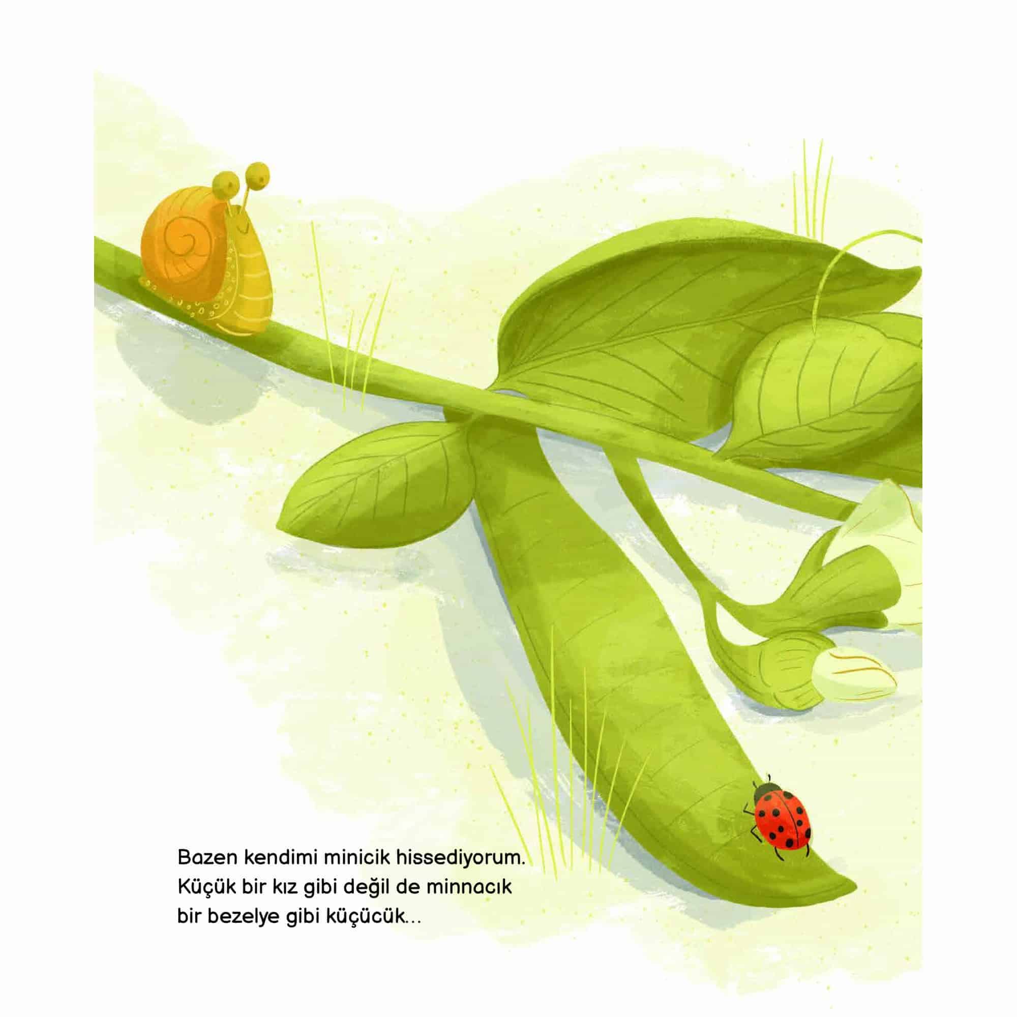 Siz de bazen kendinizi bu evrende minicik hissediyor musunuz? Öyküdeki kahramanımız olan küçük kız kendisini öyle hissediyor. Ağaçlara bakıyor, çevresine bakıyor ve “Ben ne kadar da miniciğim...” diyor. Ancak sonrasında kendisi fiziğiyle küçük olup yaptıkları iyilikler ve dokunuşlarla büyük işler başarmış insanları gözlemliyor. Öykümüzün sonunda minik kız artık çok büyük!