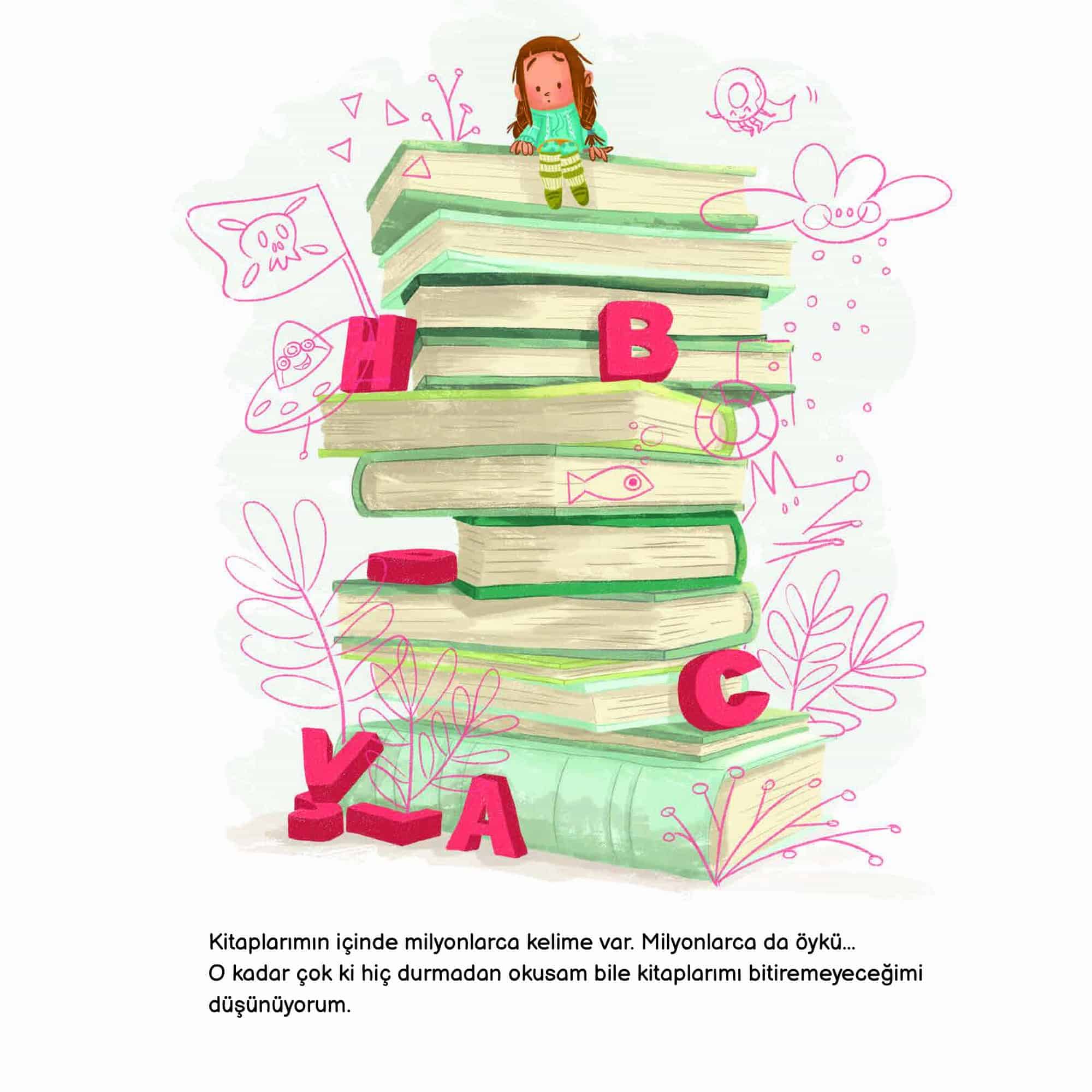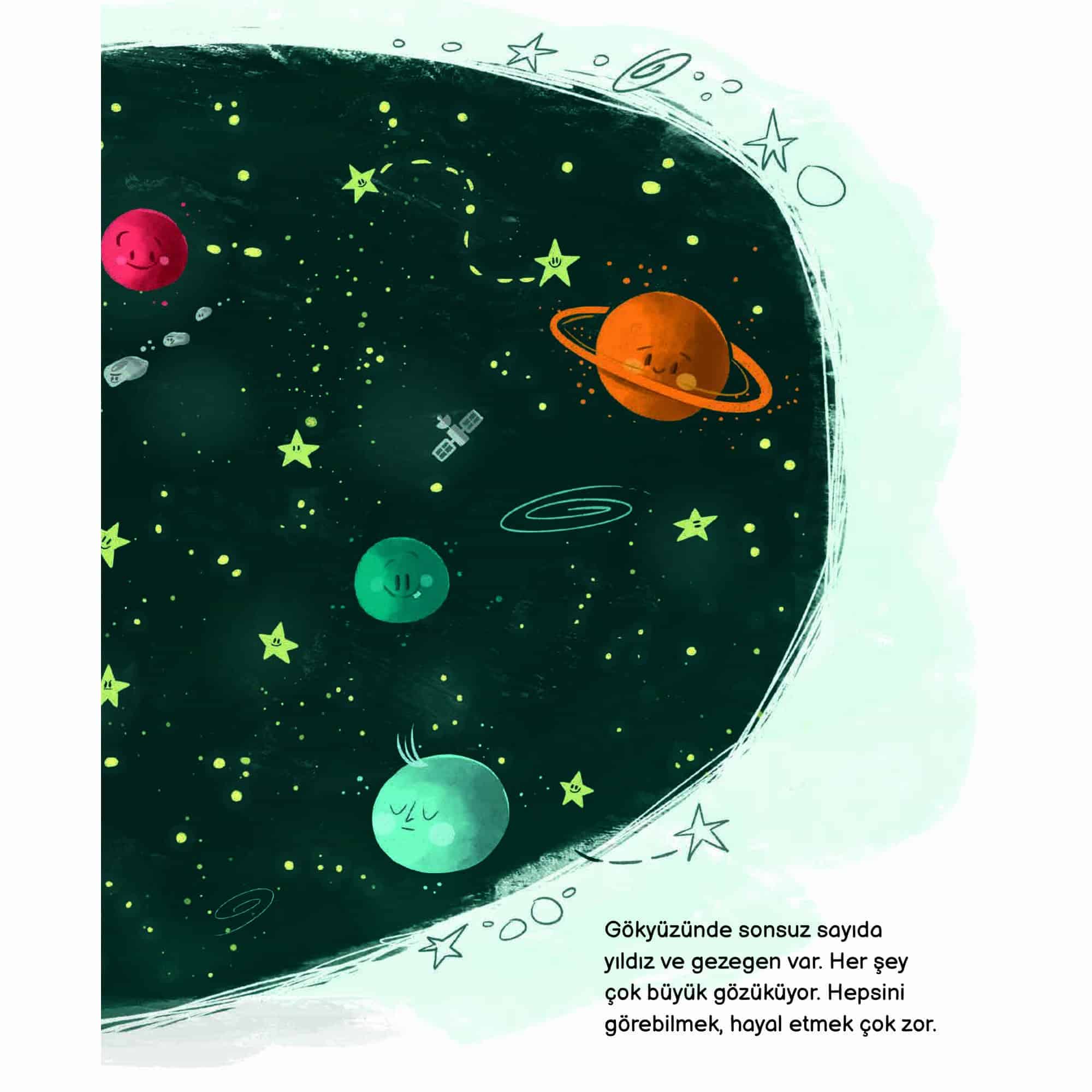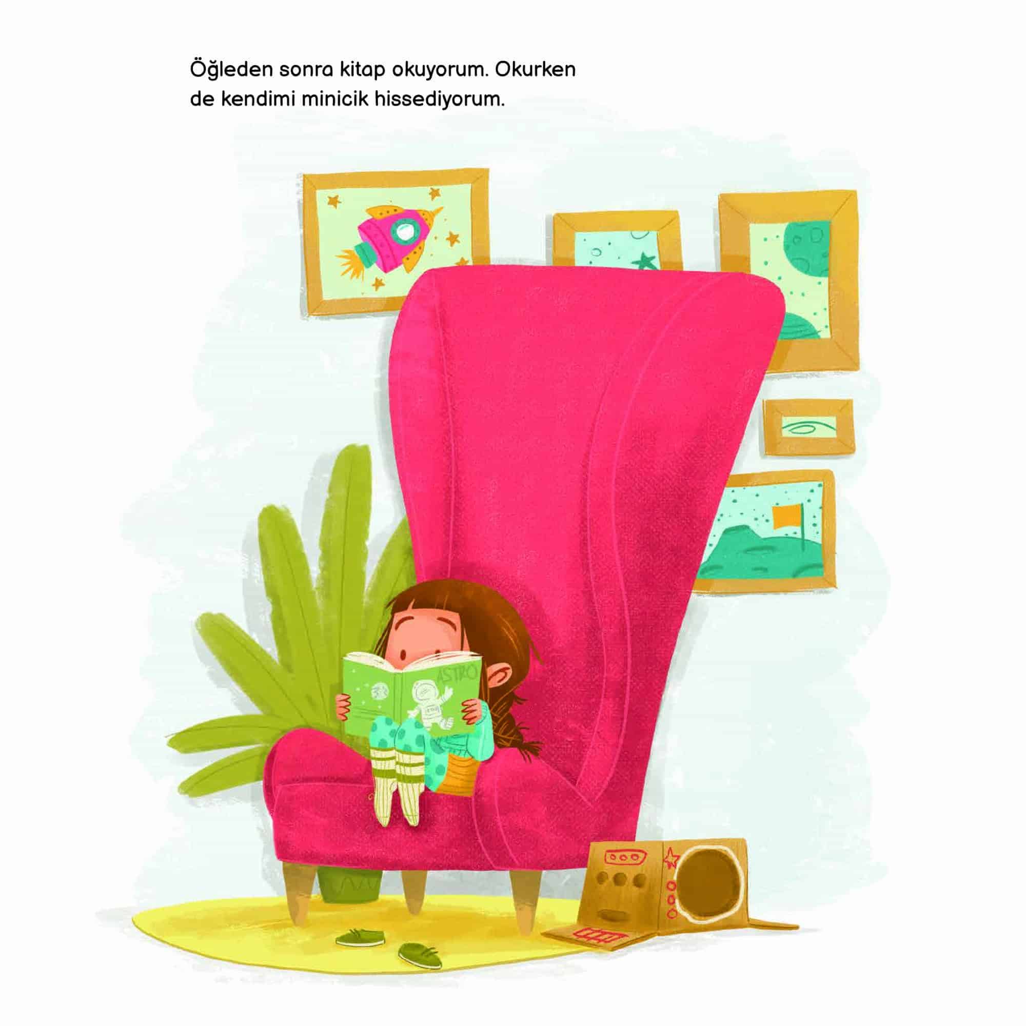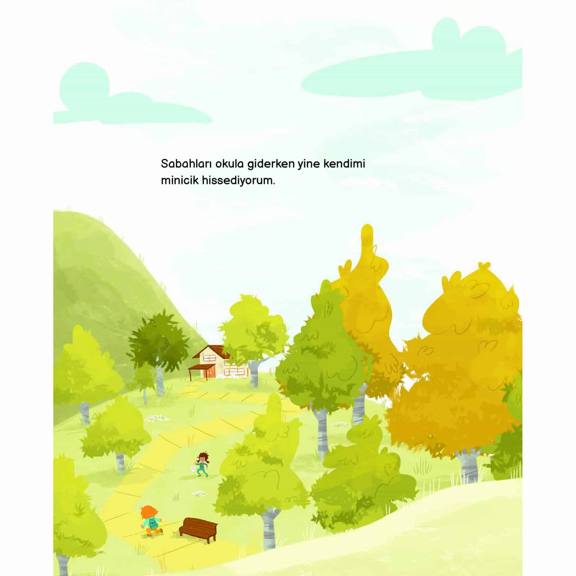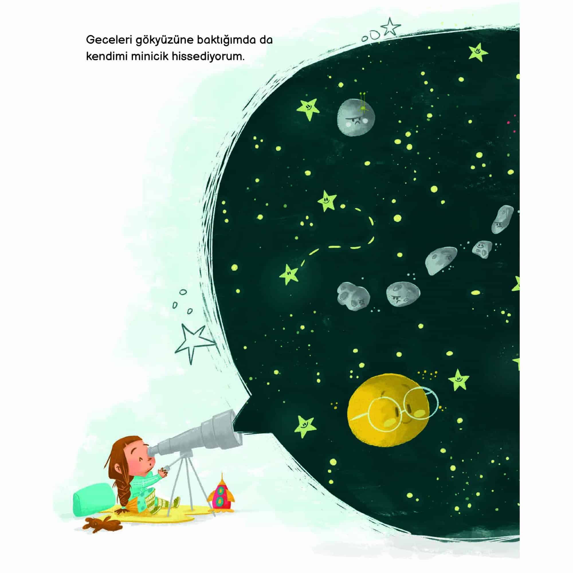 Siz de bazen kendinizi bu evrende minicik hissediyor musunuz? Öyküdeki kahramanımız küçük kız da kendisini öyle hissediyor. Ağaçlara bakıyor, çevresine bakıyor ve ben ne kadar da küçüğüm diyor. Ancak sonrasında kendisi fiziğiyle küçük olup, yaptıkları iyilikler ve dokunuşlarla büyük işler başarmış insanları gözlemliyor. Öykümüzün sonunda minik kız artık çok büyük!
