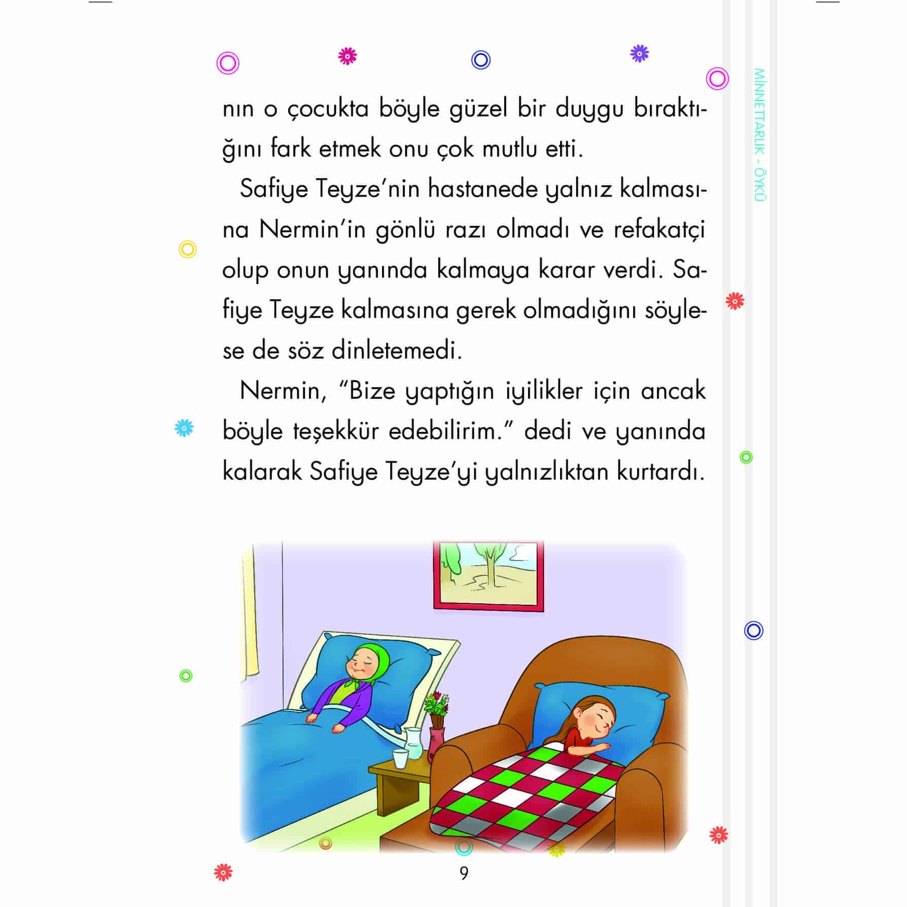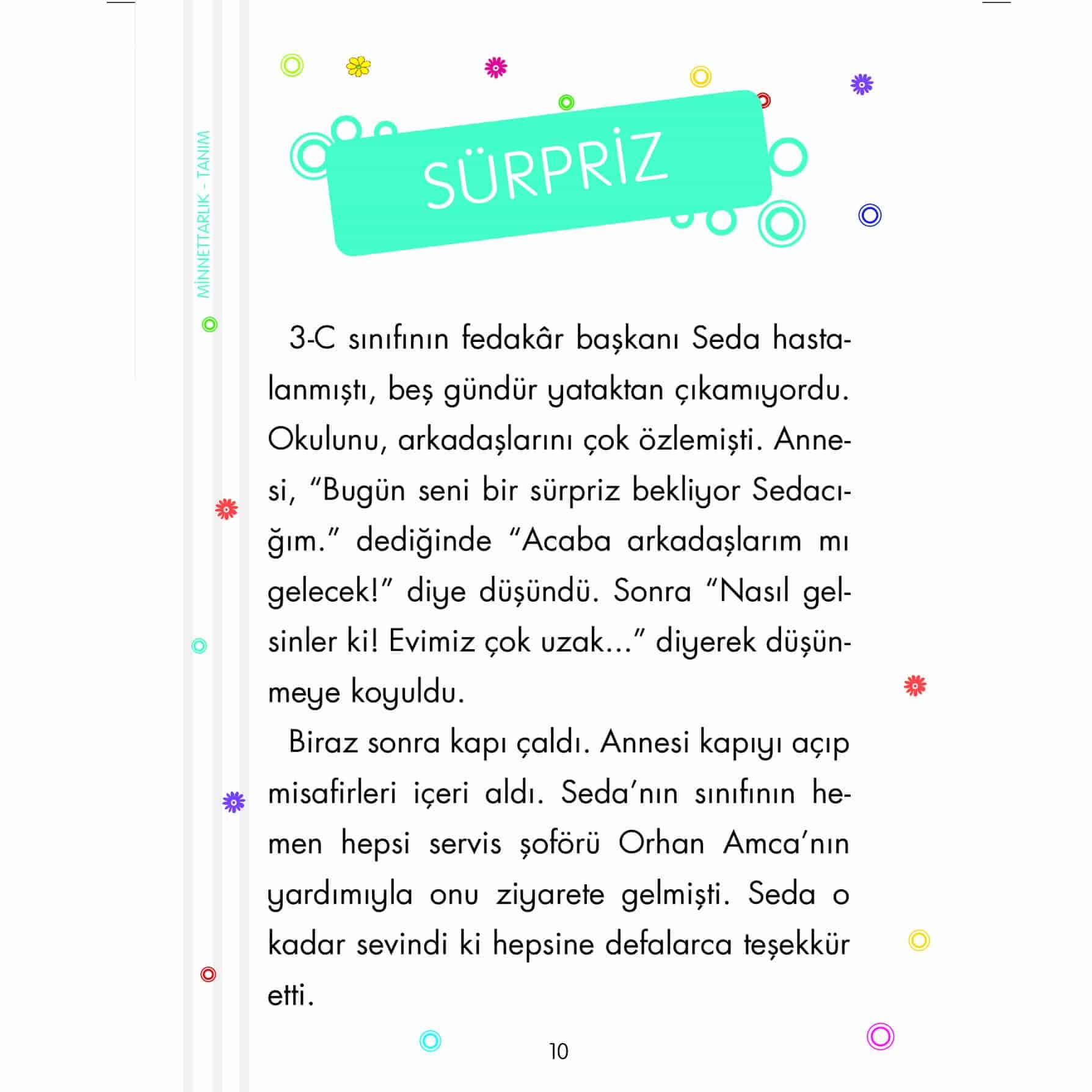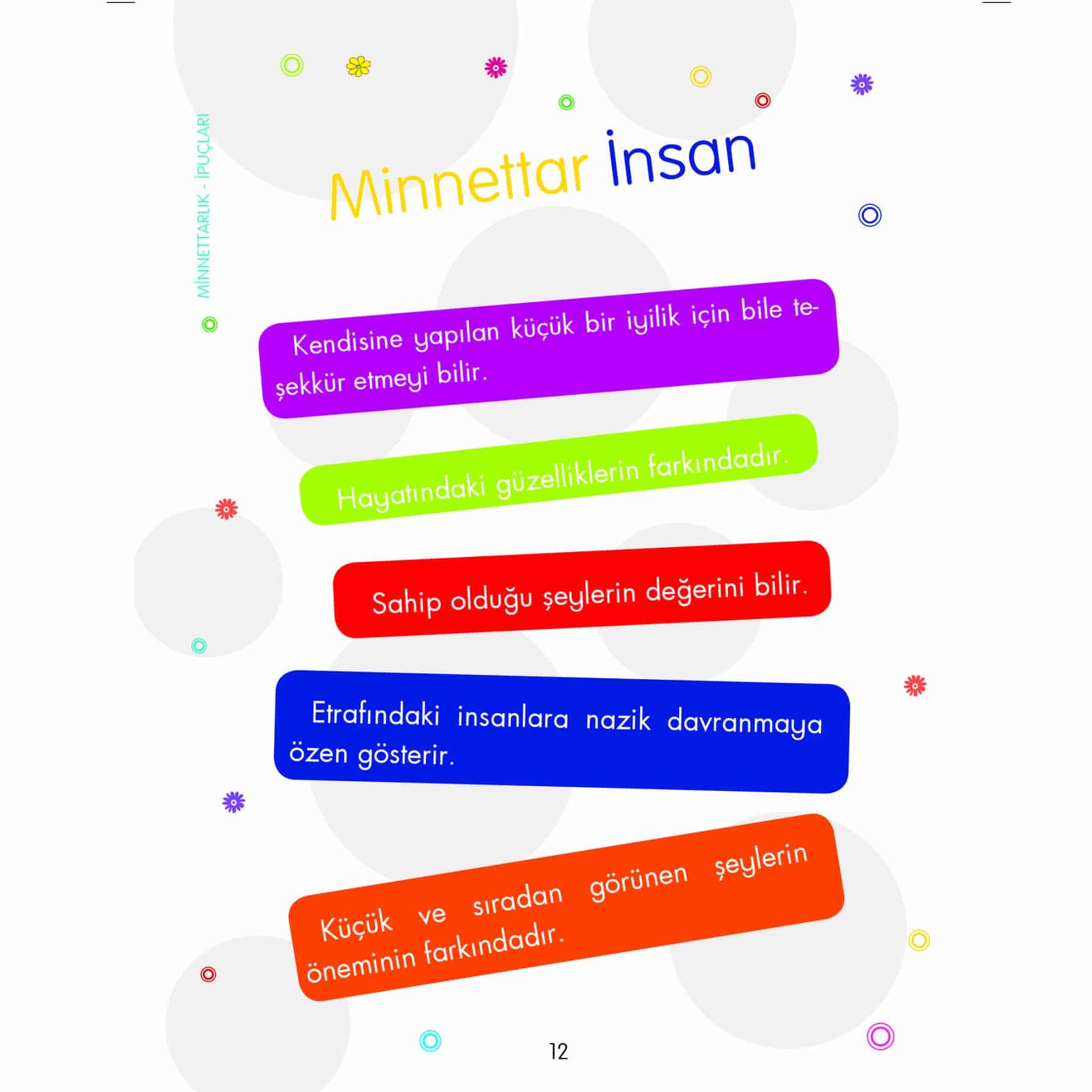 Beş yetkin yazar ve proje danışmanı tarafından hazırlanan kitapta, ‘minnet duyma’ davranışı günlük hayattan çeşitli hikâyelerle anlatılıyor. Çocukların anlayacağı sade ve nahif bir dille anlatılan hikâyelerin, özellikle küçük yaşta çocukların günlük yaşamlarında karşılaşma olasılığı yüksek olaylardan seçilmesi kitabın en büyük avantajı.
