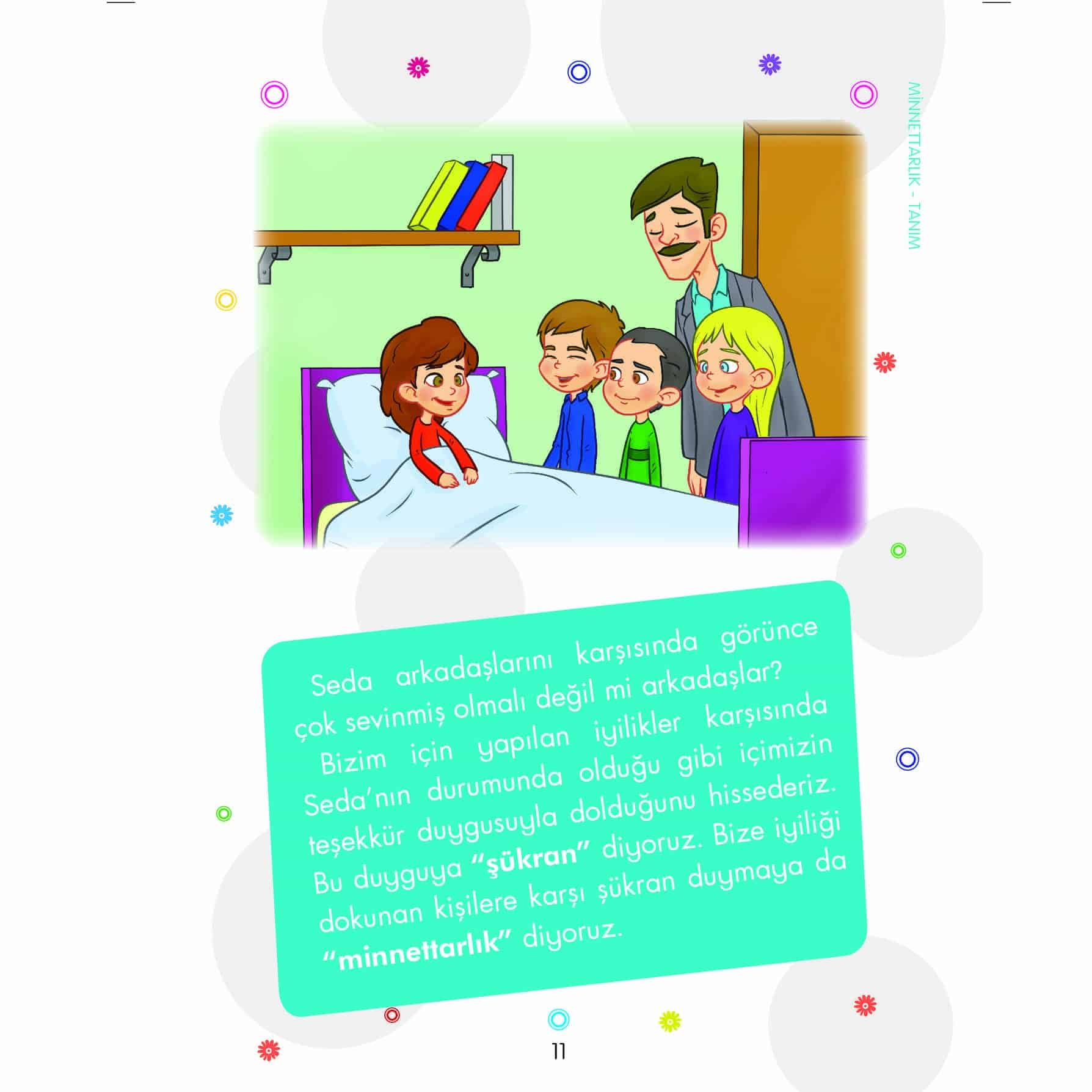 Erdemler serisinin ‘Minnet Duyuyorum’ başlığı, hayatın her anında karşılaşacağı olaylara tepki verirken, oyun oynarken, herhangi bir soruna çözüm ararken, insan ilişkilerinde, aile hayatında, okul yaşamında ve iş planlamasında minnettarlığın ne kadar önemli olduğuna dikkat çekiyor. Öykü ve hikâyelerle bu önemli kavram eğlenceli bir şekilde anlatılırken oyunlarla da minnettarlık kavramının içselleştirilmesi sağlanıyor.