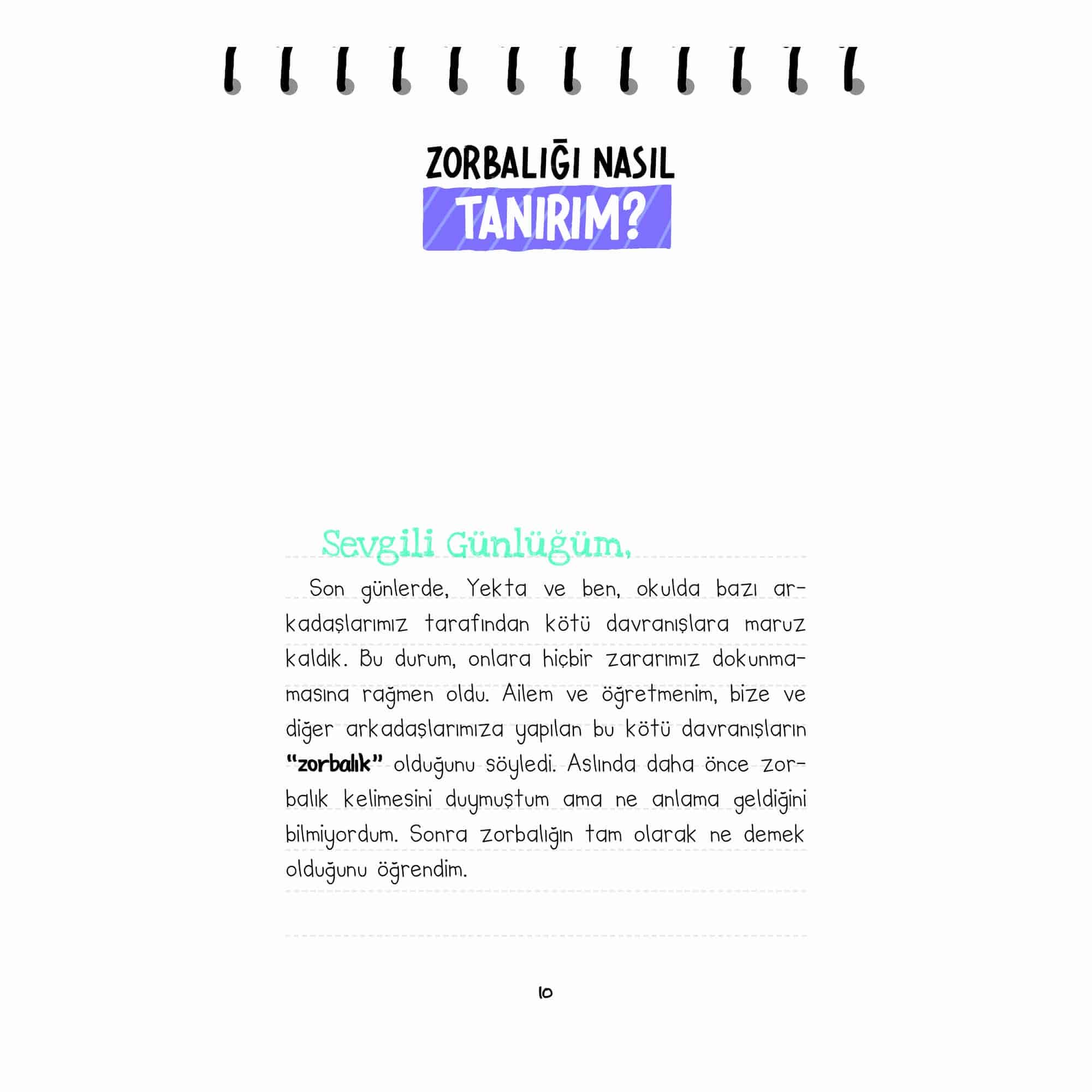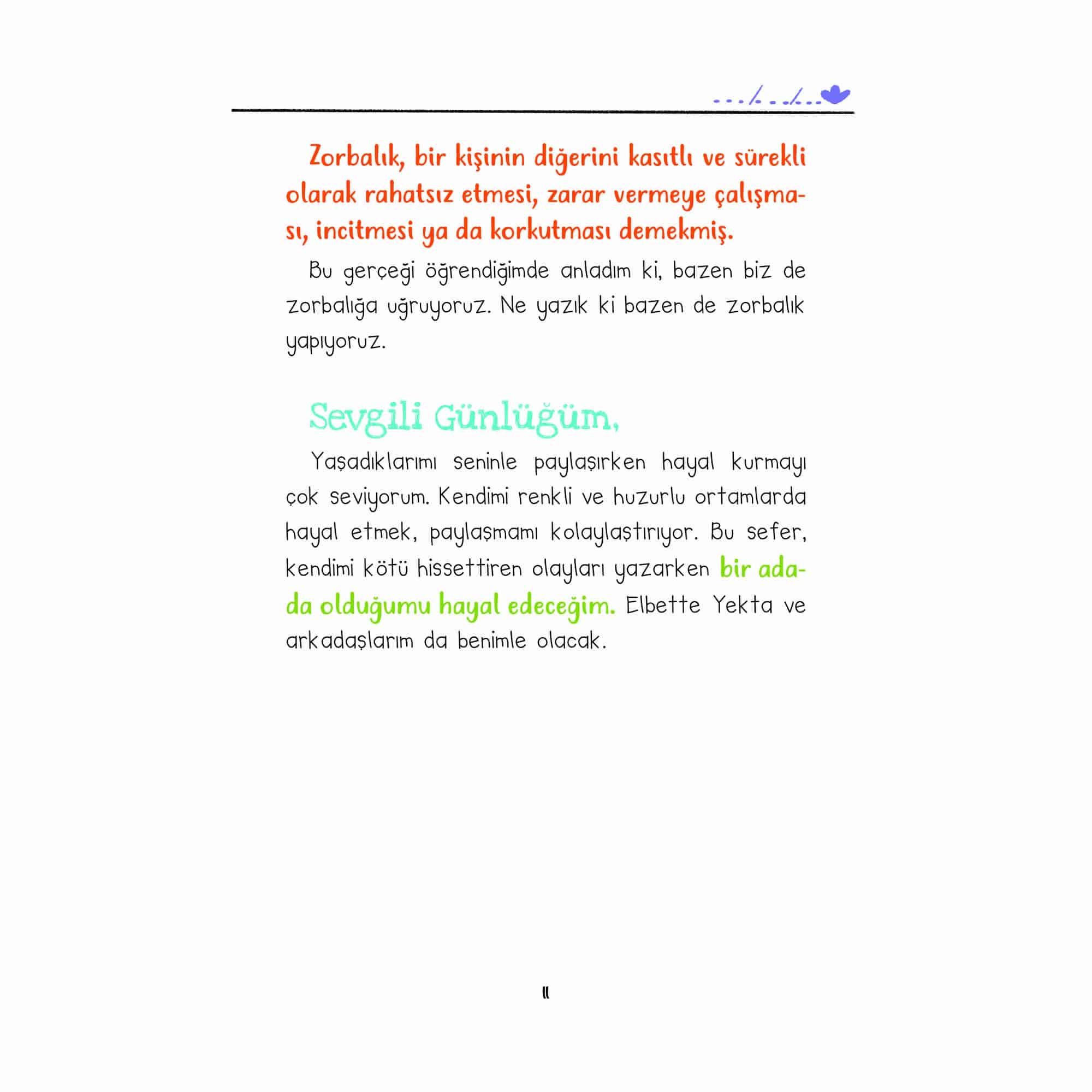 Bu kitap, çocukların zorbalıkla ilgili farkındalığını artırmaya, onlara zorbalıkla başa çıkma becerileri kazandırmaya ve kendilerini yalnız, güçsüz, korkak ve çaresiz hissettiklerinde rahatlamalarına yardımcı olmak için kaleme alındı. Bu kitapta, zorbalık nedir, ne tür zorbalıklar vardır, zorbalık nasıl anlaşılır ve zorbalıkla nasıl başa çıkılır gibi temel bilgiler de anlatılır. Bu kitaplar, çocukların kendilerini yalnız ve çaresiz hissetmelerini önlemeye yardımcı olur. Çocuklara, zorbalıkla başa çıkmanın birçok yolu olduğunu, kendilerini güçlü ve güvende hissetmeleri için yapabilecekleri birçok şey olduğunu gösterir. Rahatlama teknikleri sunar.