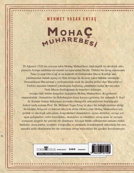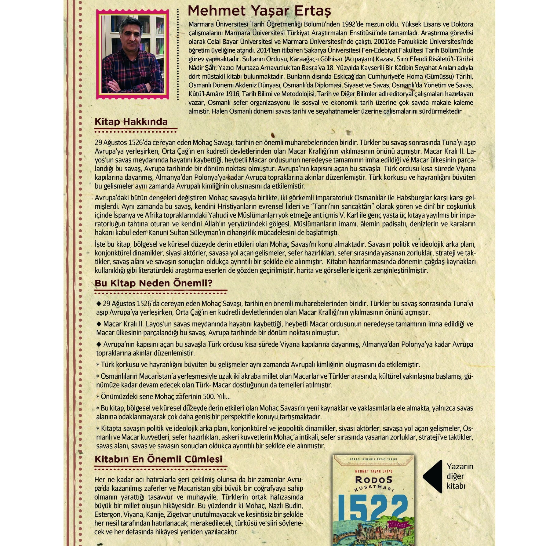* 29 Ağustos 1526’da cereyan eden Mohaç Savaşı, tarihin en önemli muharebelerinden biridir. Türkler bu savaş sonrasında Tuna’yı aşıp Avrupa’ya yerleşirken, Orta Çağ’ın en kudretli devletlerinden olan Macar Krallığı’nın yıkılmasının önünü açmıştır. Böylece hem Osmanlı hem de Avrupa tarihinde bir dönüm noktası olmuştur. * Türk korkusu ve hayranlığını büyüten bu gelişmeler aynı zamanda Avrupalı kimliğinin oluşmasını da etkilemiştir. * Osmanlıların Macaristan’a yerleşmesiyle uzak iki akraba millet olan Macarlar ve Türkler arasında, kültürel yakınlaşma başlamış, günümüze kadar devam edecek olan Türk- Macar dostluğunun da temelleri atılmıştır. * Önümüzdeki sene Mohaç zaferinin 500. yıldönümü, dolayısıyla konuyla alakalı Avrupa ve Türkiye'de birçok çalışma yapılacak. Bu kitapla gündemi önceden yakalamış olacağız. * Bu kitap, bölgesel ve küresel düzeyde derin etkileri olan Mohaç Savaşı’nı yeni kaynaklar ve yaklaşımlarla ele almakta, yalnızca savaş alanına odaklanmayarak çok daha geniş bir perspektifle konuyu tartışmaktadır. * Kitapta savaşın politik ve ideolojik arka planı, konjonktürel ve jeopolitik dinamikler, siyasi aktörler, savaşa yol açan gelişmeler, Osmanlı ve Macar kuvvetleri, sefer hazırlıkları, askeri kuvvetlerin Mohaç’a intikali, sefer sırasında yaşanan zorluklar, strateji ve taktikler, savaş alanı, savaş ve savaşın sonuçları oldukça ayrıntılı bir şekilde ele alınmıştır.