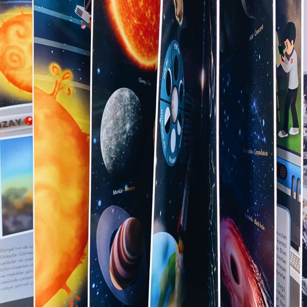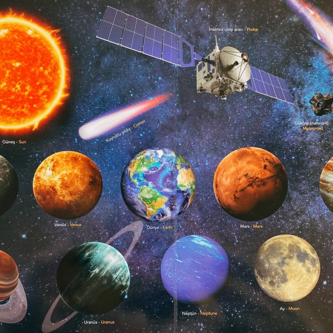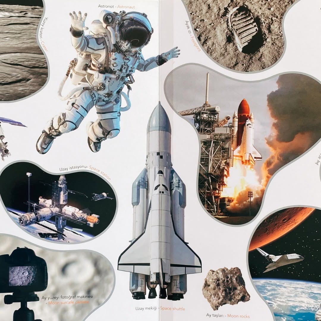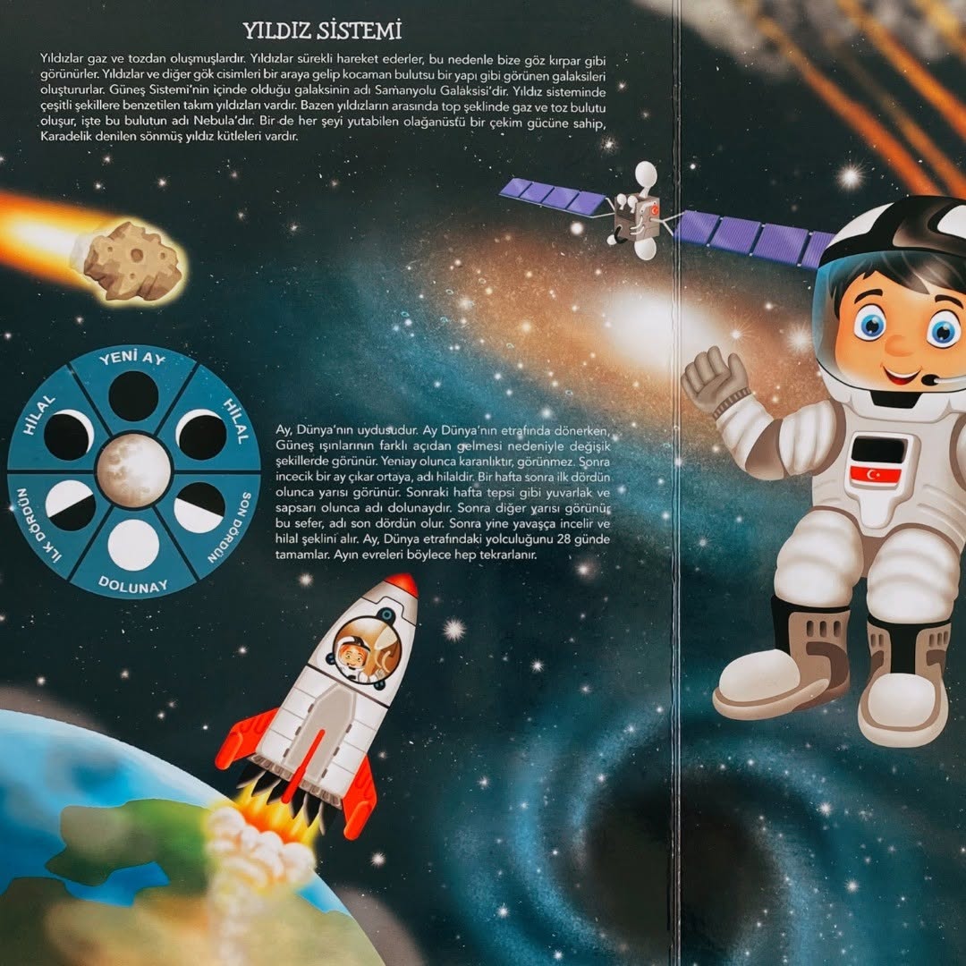 NE SORSAN BİLİR MİNİK Uzayı keşfetmek için bilim adamları yıllardır uzay istasyonları kurup, Uzaya uydular, roketler ve mekikler gönderirler. Güneş Sistemini, gezegenleri, yıldızları yakından tanımak ister misin? Peki yıldız sistemindeki birbirinden ilginç gök cisimlerinin isimlerini öğrenmek eğlenceli olmaz mı? Dünya’dan uzayı gözlemlemek, uzay üssünde çalışan bir bilim insanı olmak ve hatta astronot olup, uzaya gitmek ne kadar heyecan vericidir ne dersin? Bu soruların cevapları ve Uzayla ilgili görseller İngilizce karşılıklarıyla birlikte bu kitapta! İngilizce destekli- Resimli Çocuk Ansiklopedisi Okul öncesi müfredatına uygun olarak hazırlanmış NE SORSAN BİLİR MİNİK -İLK UZAY KİTABIM, • Çocukların sözcük dağarcığının gelişmesine • Görsel materyalleri okumasına • Nesne ve varlıkları gözlemleyerek öğrenmesine yardımcı oluyor. Uzayla ilgili bilgileri yaşam alanlarında, canlı ve renkli görsellerle anlatan resimli çocuk ansiklopedisi sayesinde çocuklar kitabı kendi başına inceleyebilir, resimlerle hikâye oluşturabilir, sözlük bölümündeki İngilizce destekli gerçek görseller sayesinde gerçek hayat ve yaşam alanları arasında bağ kurabilirler. Okul Öncesi Öğretmeni Ayşe Uzun