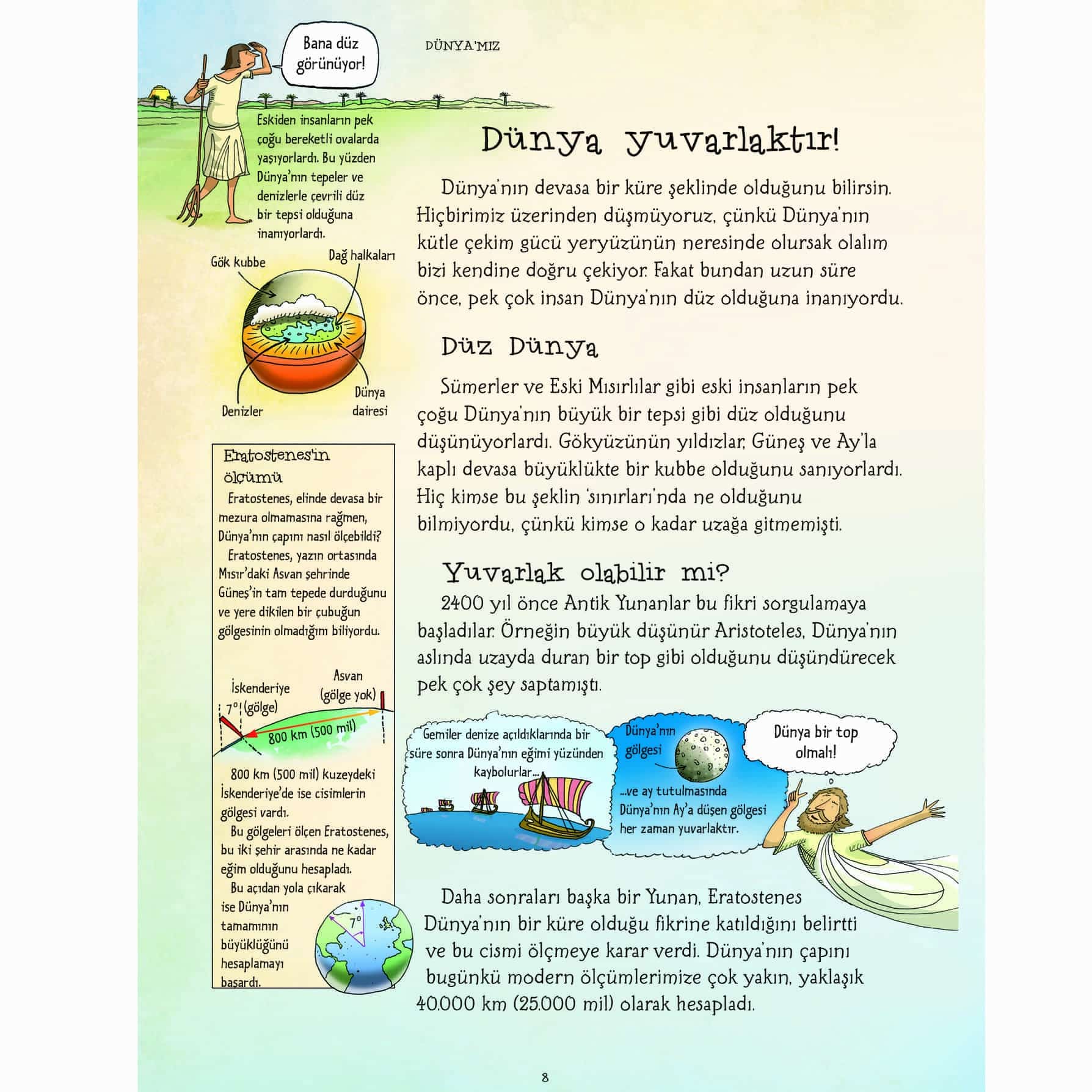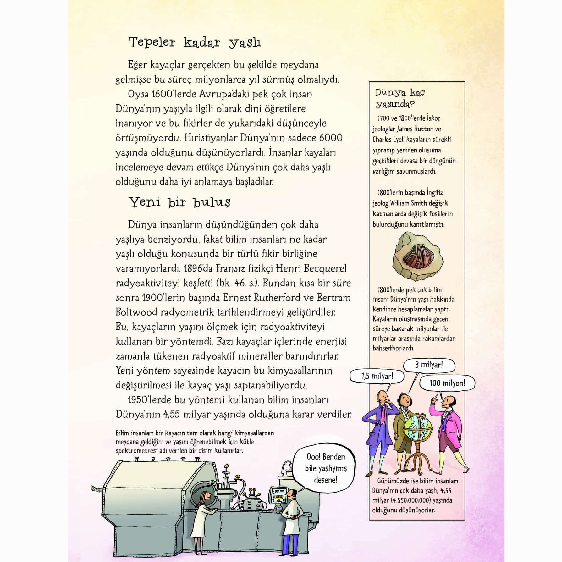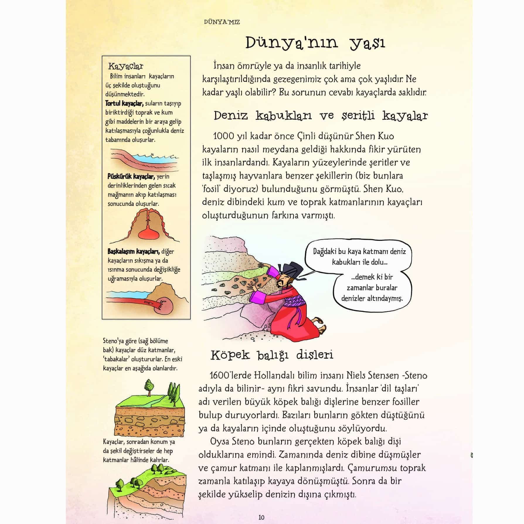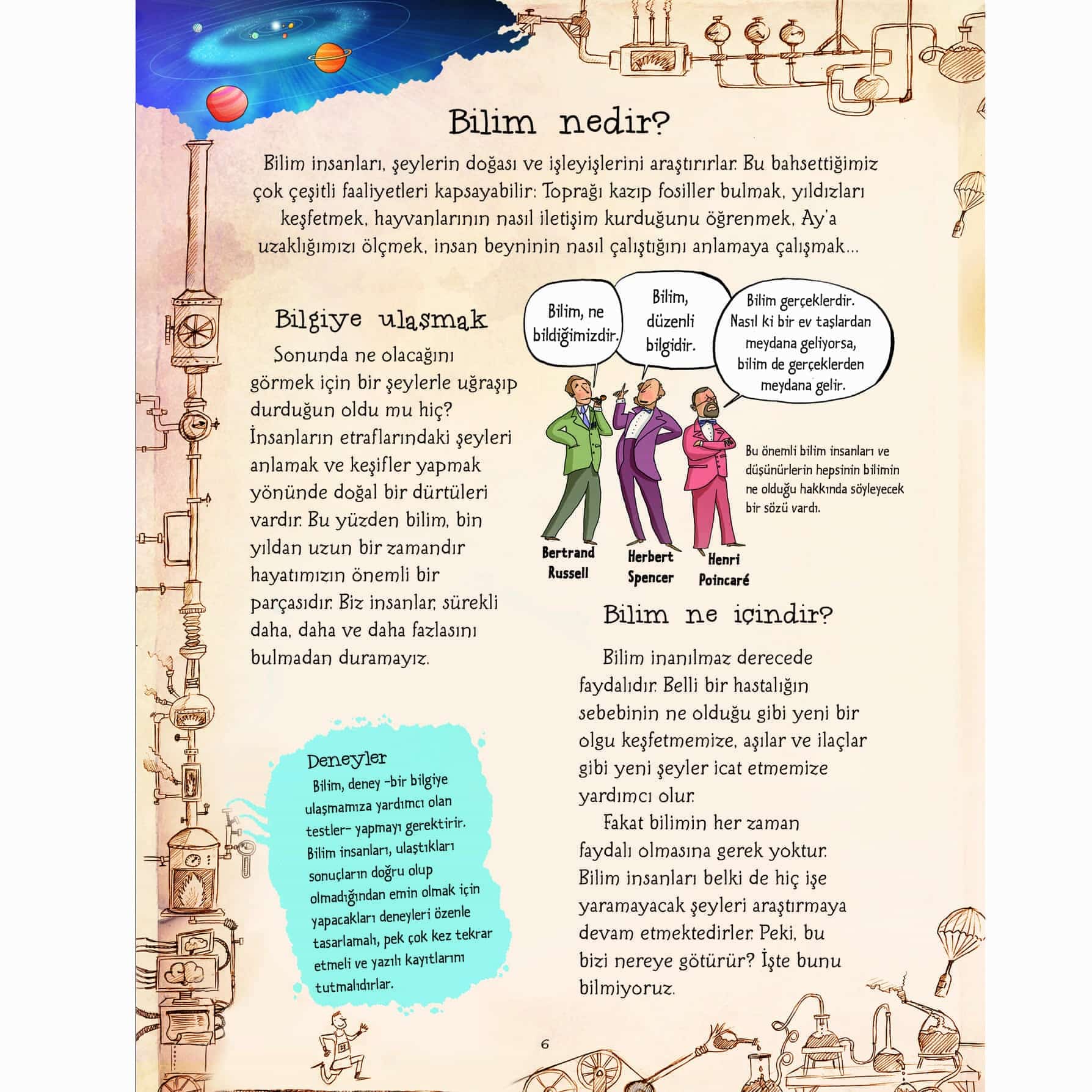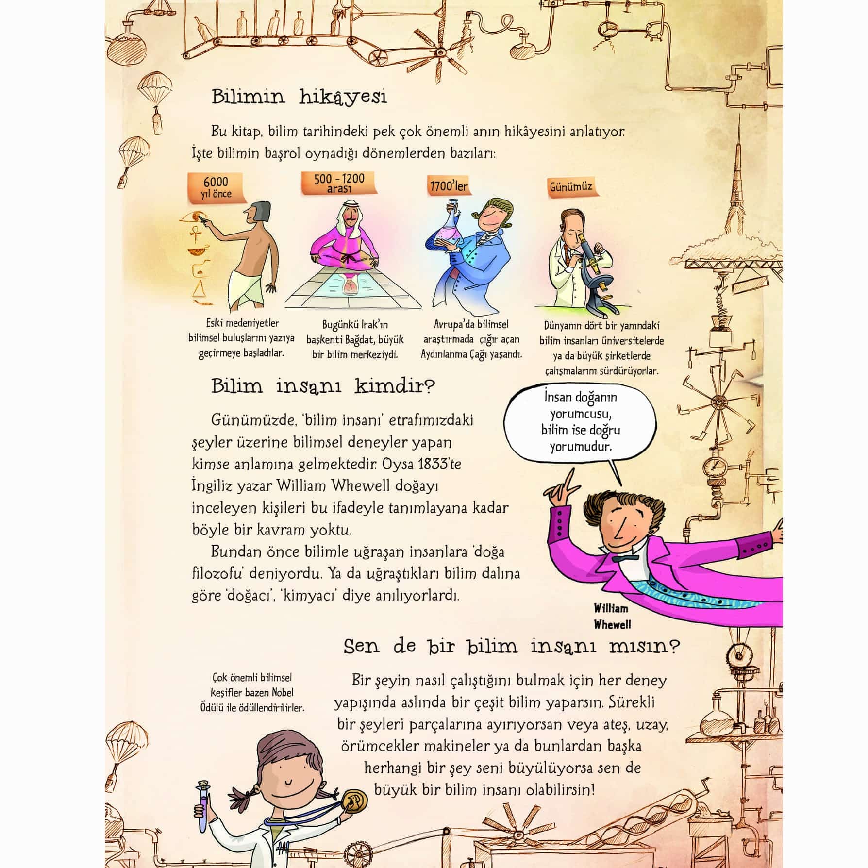 İnsanlık tarihinin başlangıcından beri insanlar dünyada olup bitenlerin nasıl gerçekleştiğini merak etmiştir. Binlerce yıldır biriken deneyler ve fikirler sayesinde biz birçok şeyi öğrendik. Bu kitap bilimsel keşiflerin arkasındaki parlak zekâlara bir yolculuk niteliğinde. Bu yolculukta kara delikleri, ayları, mıknatısları, mikroskobik yaratıkları, ışık ve ısı hakkındaki gerçekleri, etobur bitkileri, dna gerçeğini, hastalıkları, dinozorları, atomları, asteroitleri ve daha neler neler öğreneceksiniz!