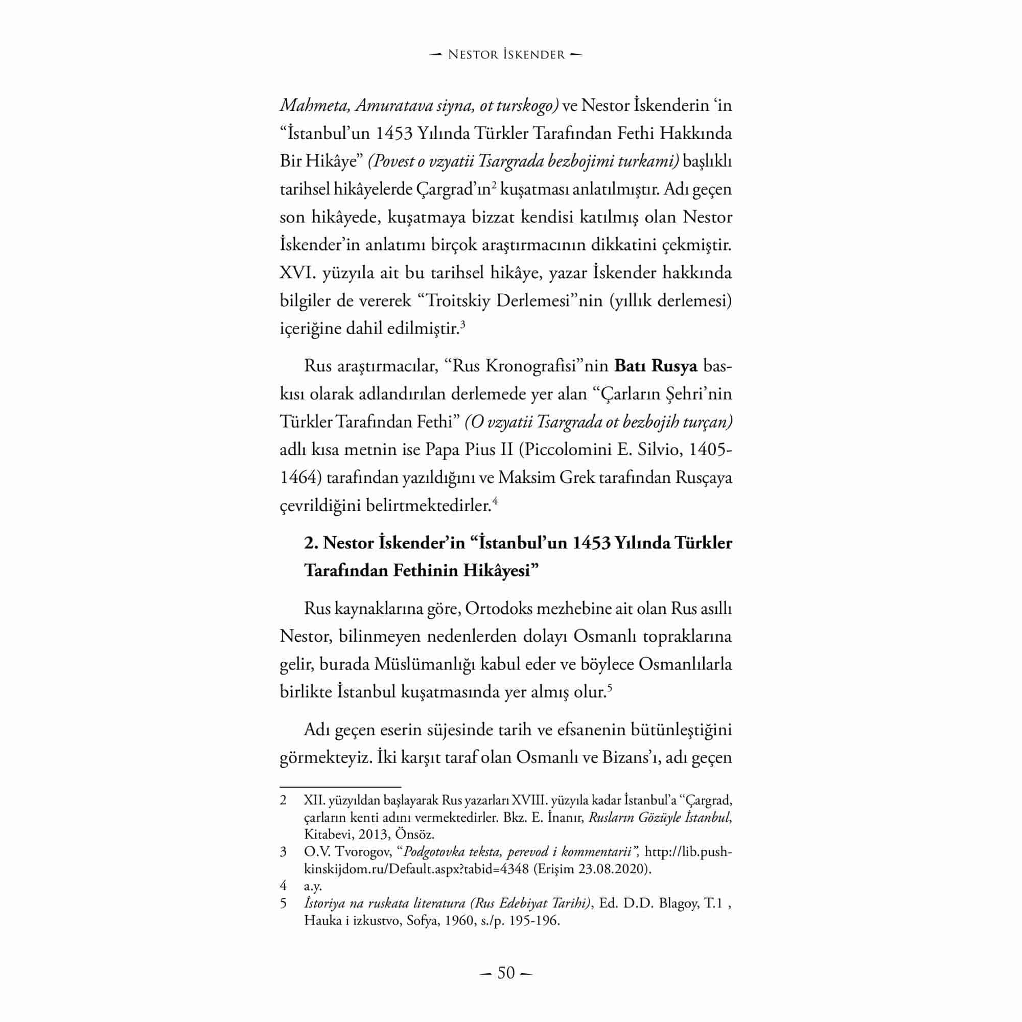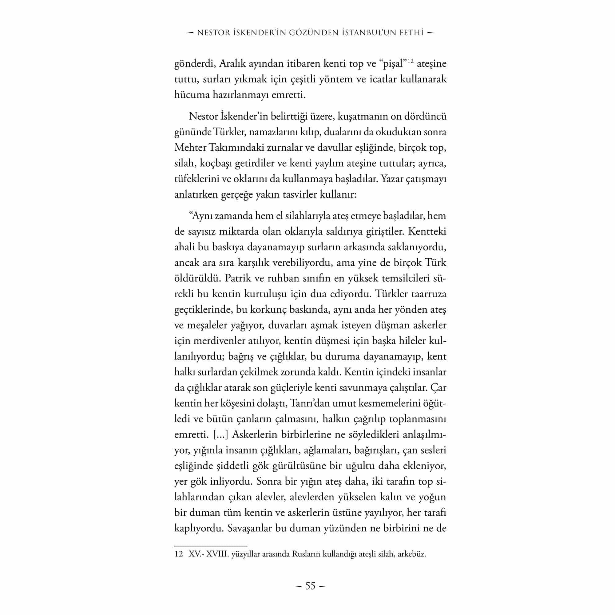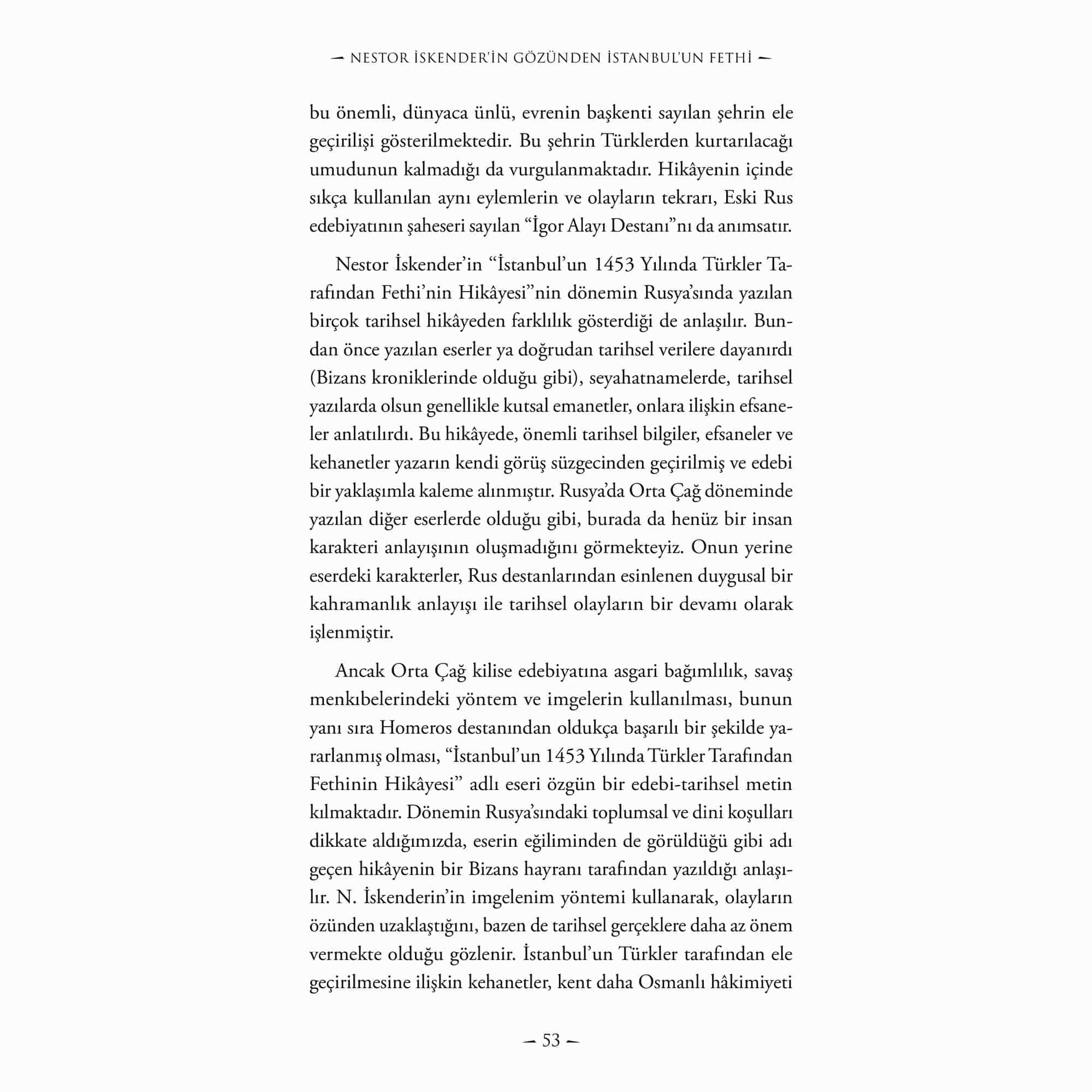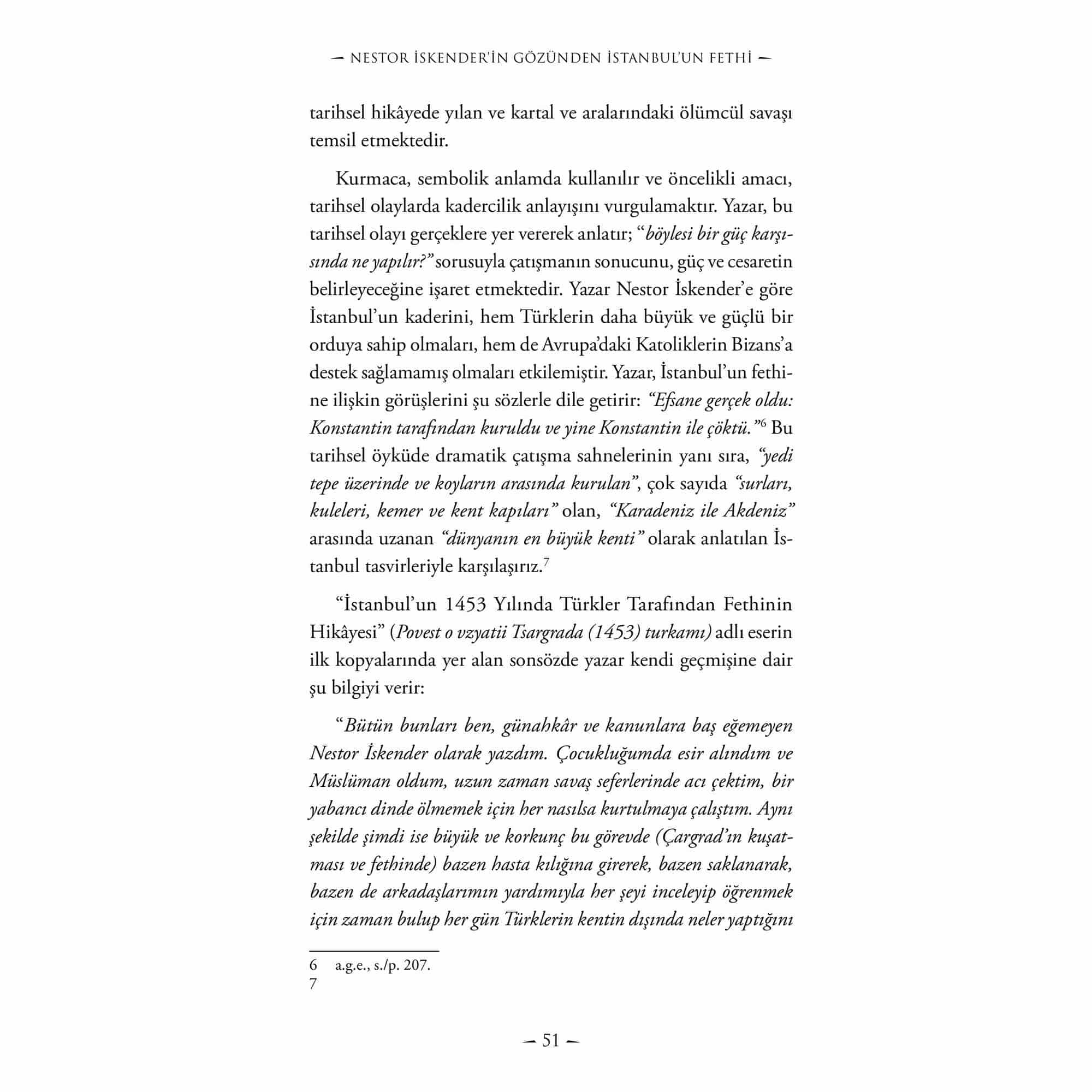 Nestor İskender Nestor İskender, Rus kaynaklarına göre 1453’te İstanbul Kuşatması’na şahit olmuş Slav kökenli bir Ortodoks Hristiyan’dır. Hayatı hakkında ise bize sadece, yaşadığı 15. yüzyılda kaleme aldıkları rehberlik eder. Araştırma ve incelemelere göre Nestor, Osmanlı topraklarına bilinmeyen nedenlerle gelmiş ve burada zorla Müslüman olmuştur. Güney Rusyalı olduğu tahmin edilen Nestor’un Fetih anlatısı ciddi derecede Bizans hayranlığı ve kilise taraftarlığı sergiler. Ona göre “kâfir” ve “tanrıtanımaz” Türklerin 1453 yılında başkent Konstantinapol’ü kuşatmaları Bizans’ta işlenen günahların kefareti, ilahi bir sonucudur. Zira “kötülükler ve kanunsuzluklar nice büyük tahtların yıkılmasına neden olmuştur.” Kehanetlerden, doğa üstü hadiselerden, kanlı yağmur damlalarından ve koruyucu meleklerden bahsedilen bu Fetih hatıratında tarih ile efsane, hayal ile gerçek, korku ile öfke iç içedir. İstanbul’un Fethi’ni bir gayrimüslimin dilinden ve süzgecinden aktaran bu özgün edebî-tarihsel hatırat, “anlatılmayan” unsurların da en az “anlatılan” unsurlar kadar bilgilendirici olabileceğini tarih okuruna ısrarla ve yeniden hatırlatmaktadır.