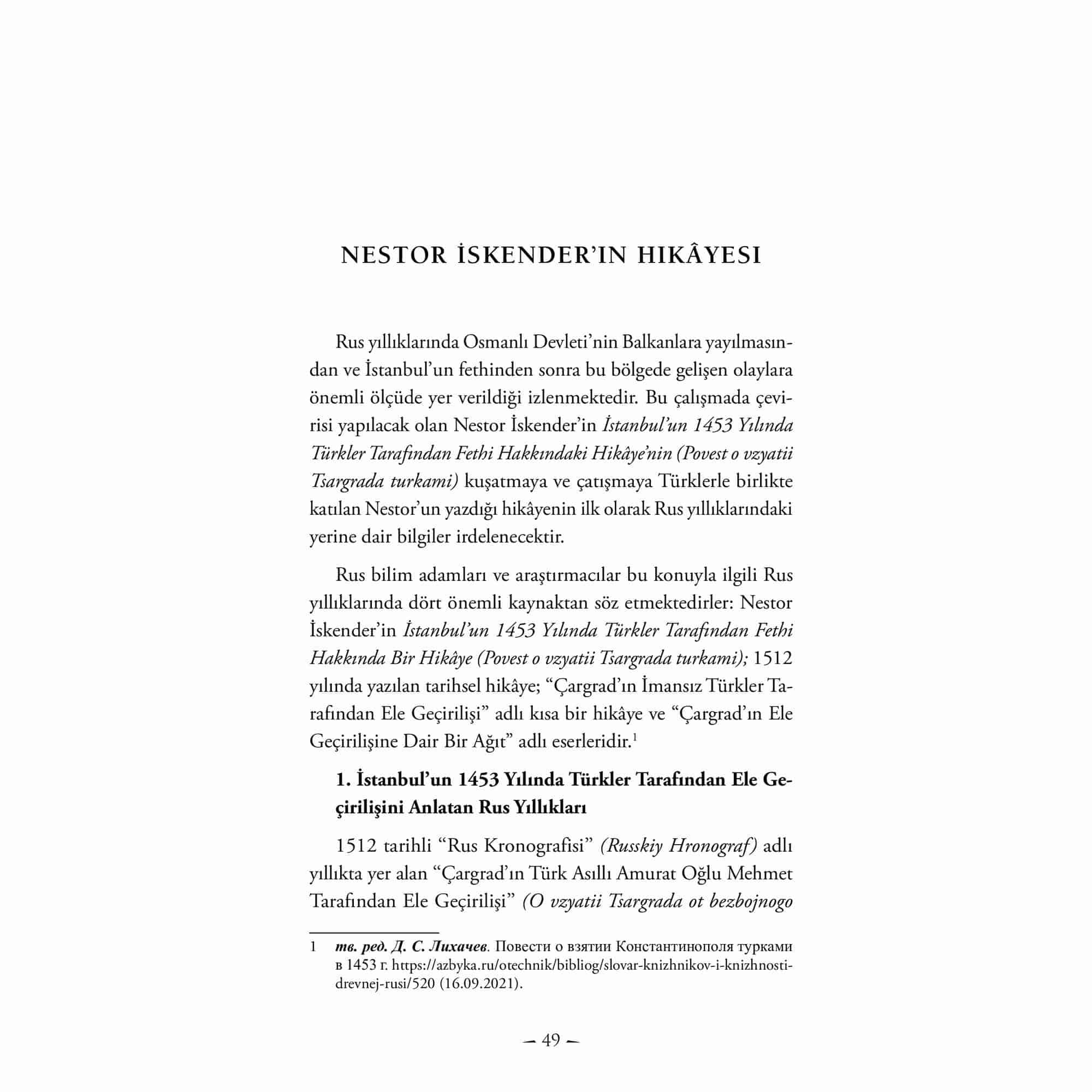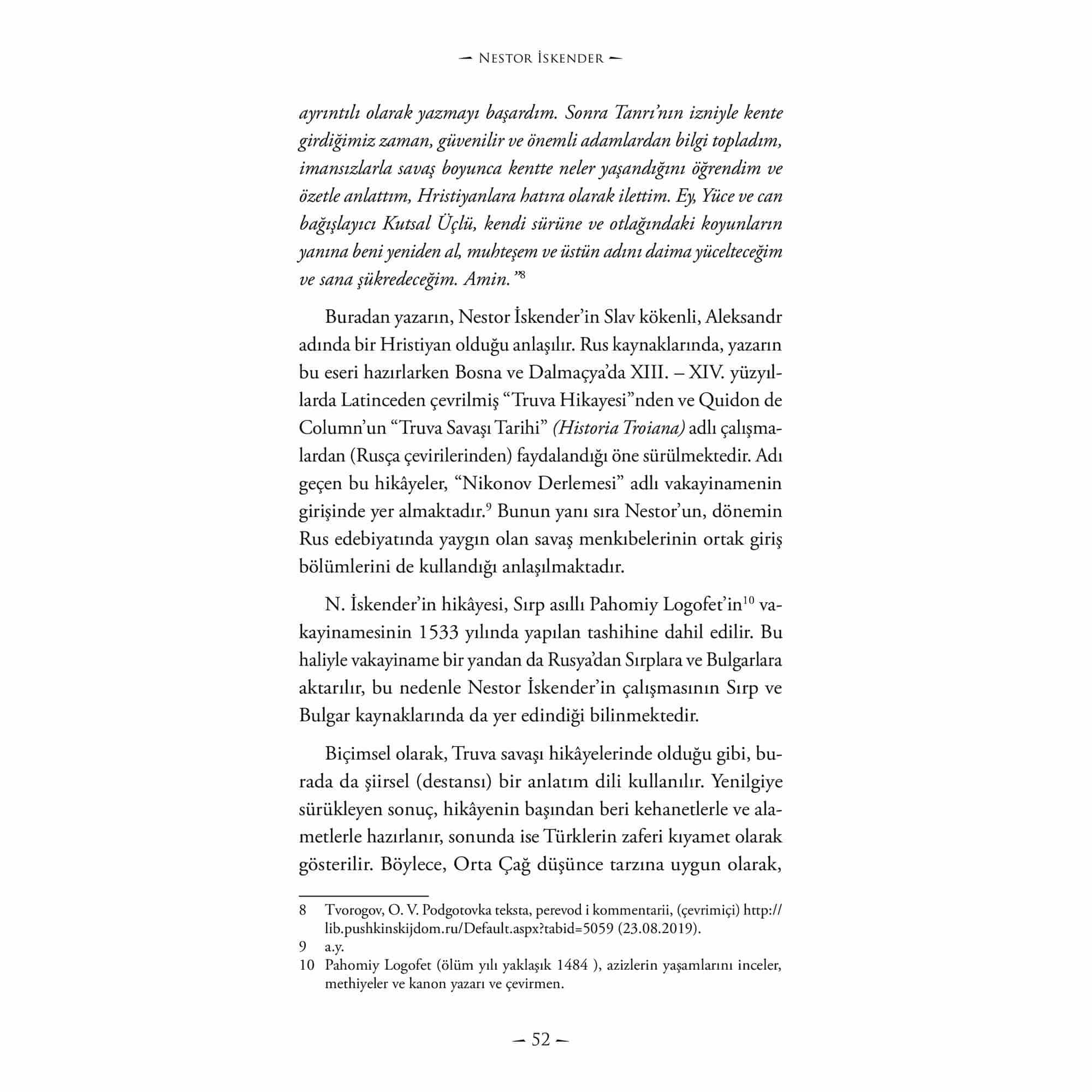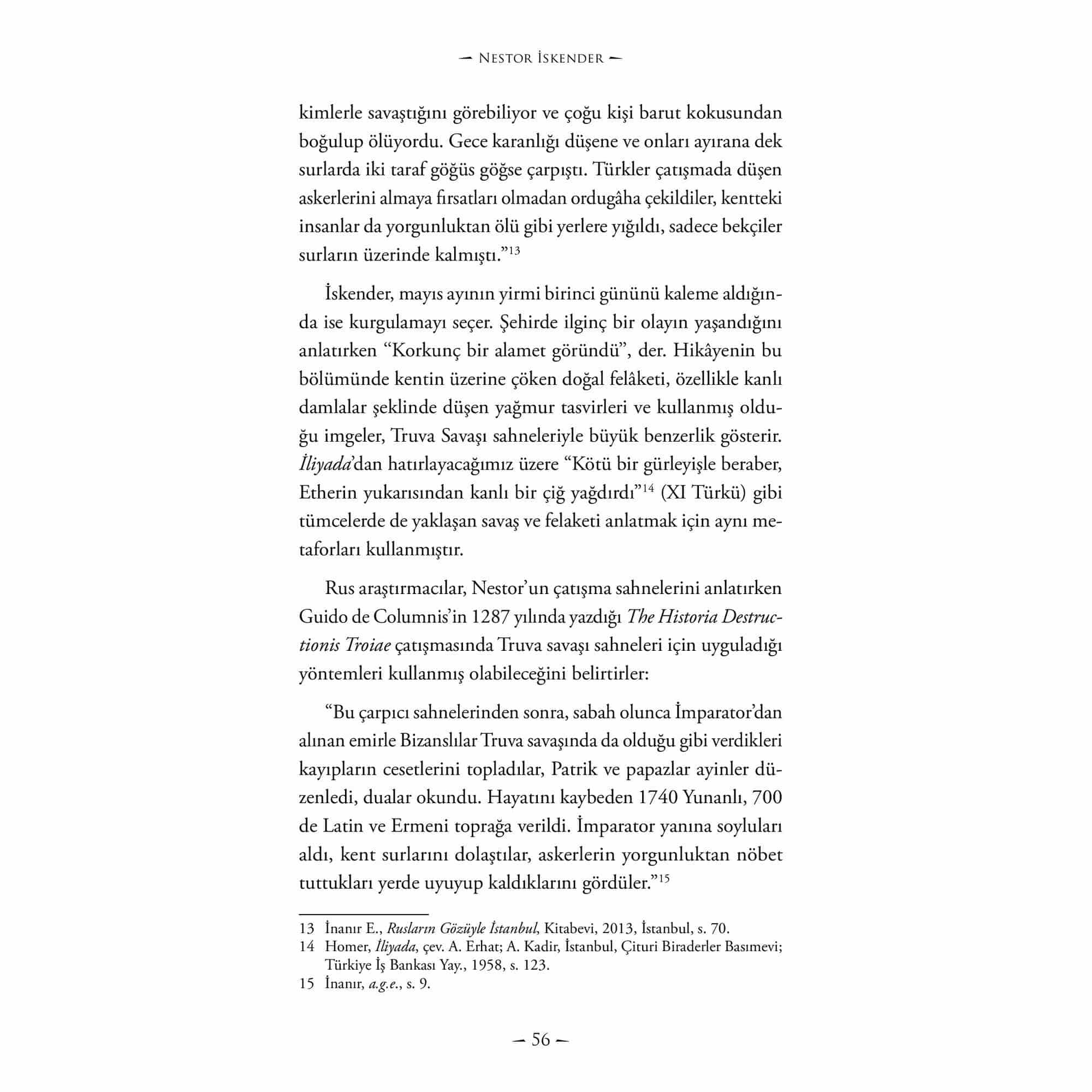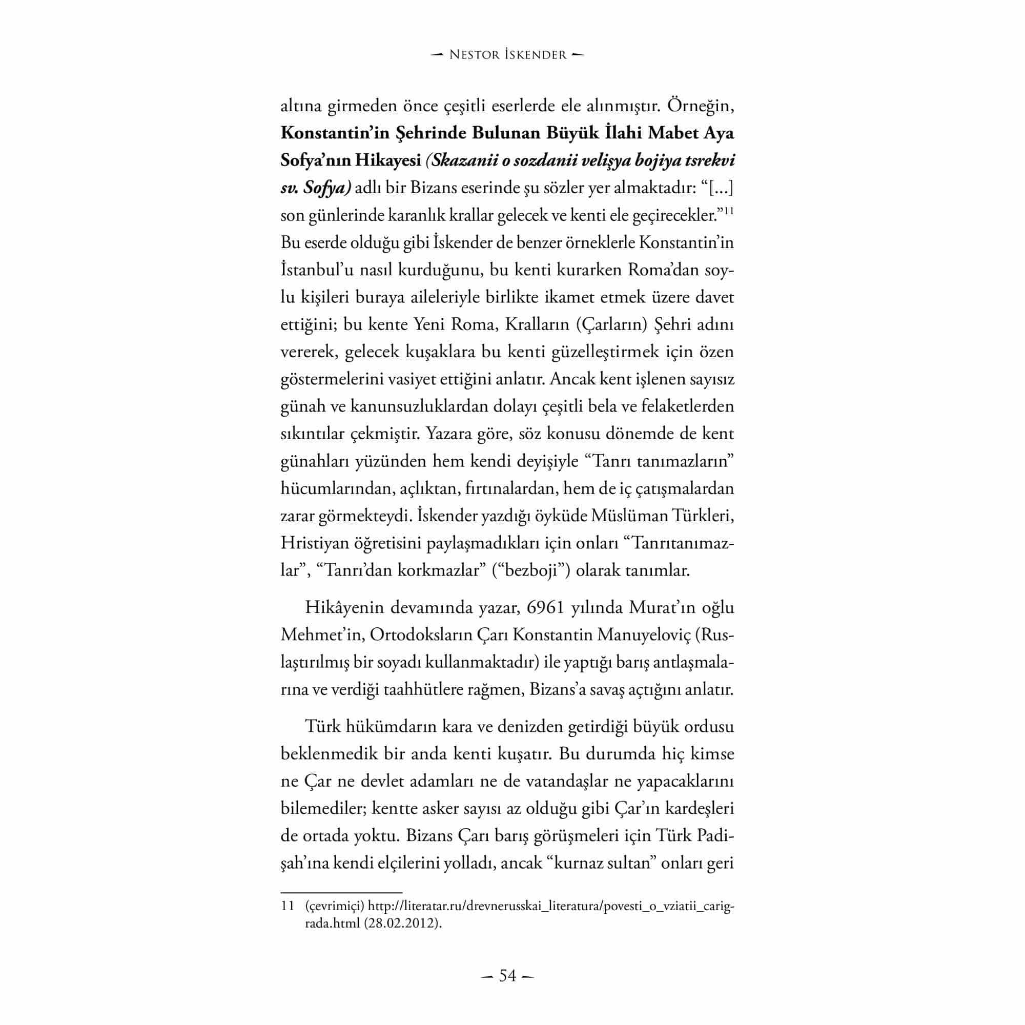 Nestor İskender Nestor İskender, Rus kaynaklarına göre 1453’te İstanbul Kuşatması’na şahit olmuş Slav kökenli bir Ortodoks Hristiyan’dır. Hayatı hakkında ise bize sadece, yaşadığı 15. yüzyılda kaleme aldıkları rehberlik eder. Araştırma ve incelemelere göre Nestor, Osmanlı topraklarına bilinmeyen nedenlerle gelmiş ve burada zorla Müslüman olmuştur. Güney Rusyalı olduğu tahmin edilen Nestor’un Fetih anlatısı ciddi derecede Bizans hayranlığı ve kilise taraftarlığı sergiler. Ona göre “kâfir” ve “tanrıtanımaz” Türklerin 1453 yılında başkent Konstantinapol’ü kuşatmaları Bizans’ta işlenen günahların kefareti, ilahi bir sonucudur. Zira “kötülükler ve kanunsuzluklar nice büyük tahtların yıkılmasına neden olmuştur.” Kehanetlerden, doğa üstü hadiselerden, kanlı yağmur damlalarından ve koruyucu meleklerden bahsedilen bu Fetih hatıratında tarih ile efsane, hayal ile gerçek, korku ile öfke iç içedir. İstanbul’un Fethi’ni bir gayrimüslimin dilinden ve süzgecinden aktaran bu özgün edebî-tarihsel hatırat, “anlatılmayan” unsurların da en az “anlatılan” unsurlar kadar bilgilendirici olabileceğini tarih okuruna ısrarla ve yeniden hatırlatmaktadır.