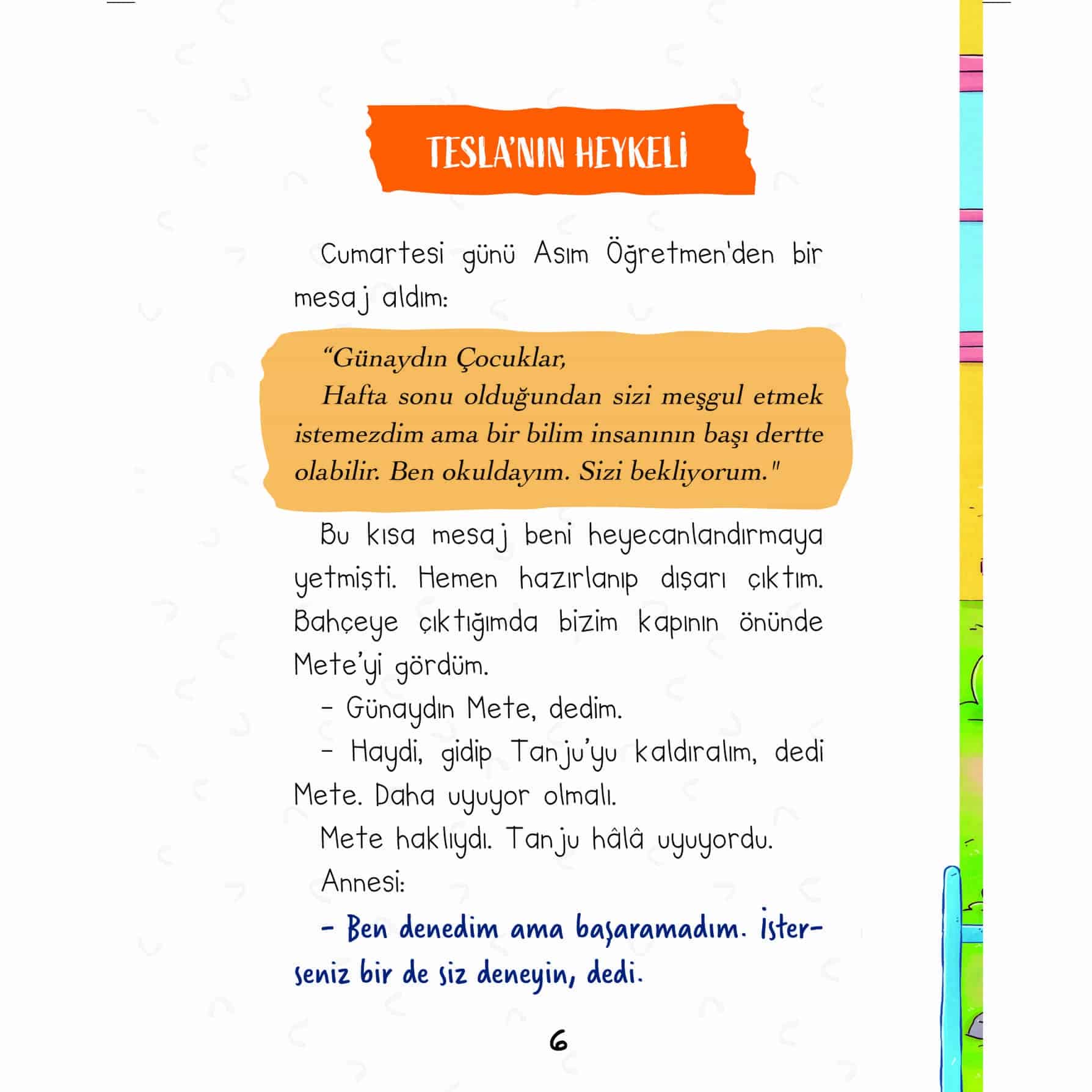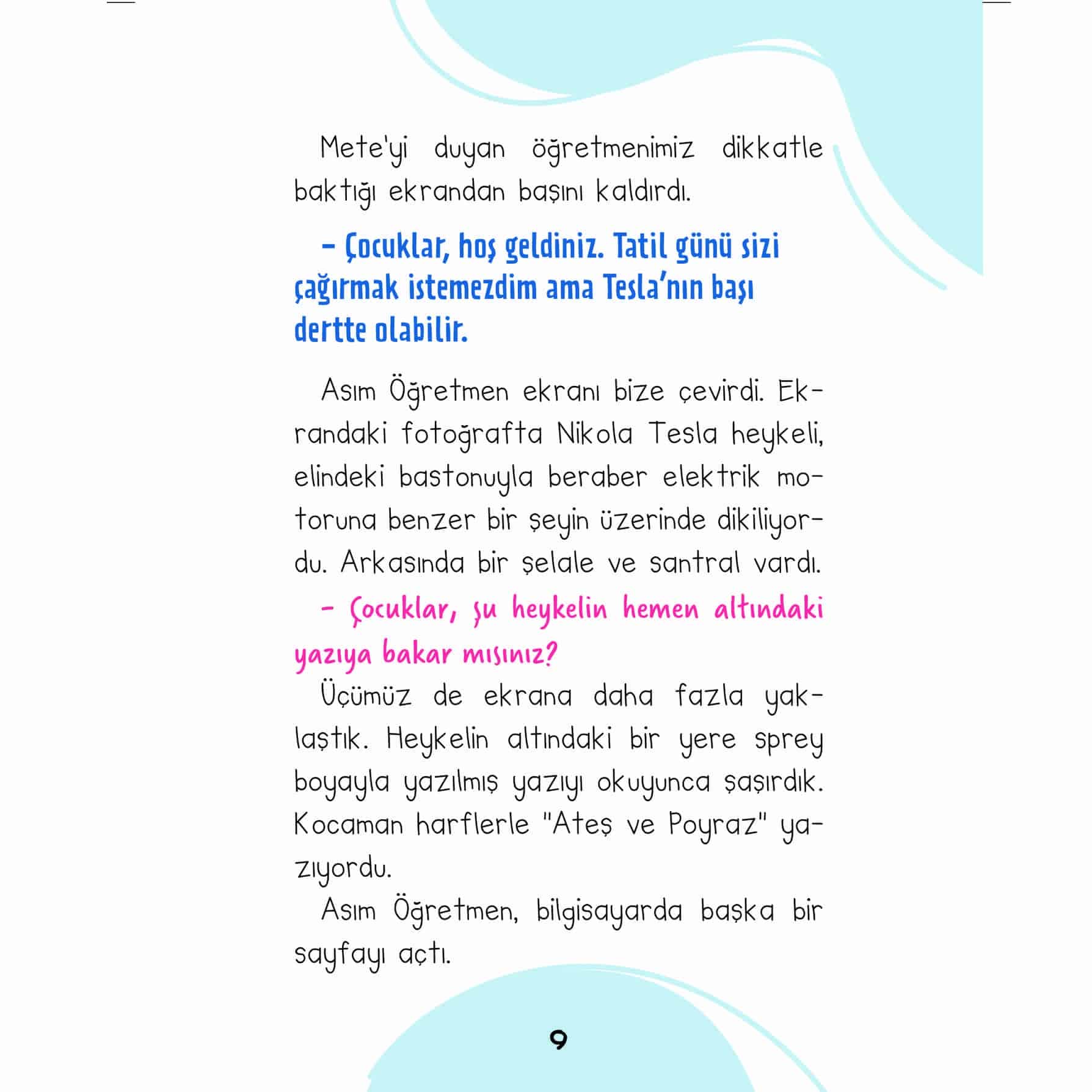 Çok sevilen Levent serisinin yazarı Mustafa Orakçı bu defa okurlarını Duru, Mete ve Tanju’yla tanışmaya davet ediyor. Yazdığı her kitapla okurlarının beğenisini toplayan, çocuklara okumayı sevdiren yazar olarak bilinen Mustafa Orakçı’nın “Bilim İnsanlarının İzinde” serisi beş kitaptan oluşuyor. Serinin bu kitabında kahramanlarımız, yaptıkları zaman yolculukları sayesinde Nikola Tesla'yla tanışıyor. Hem onu ve onun buluşlarını yakından tanıyor hem de kötü niyetli zaman yolcuları Ateş ve Poyraz’ın planlarını bozuyor.